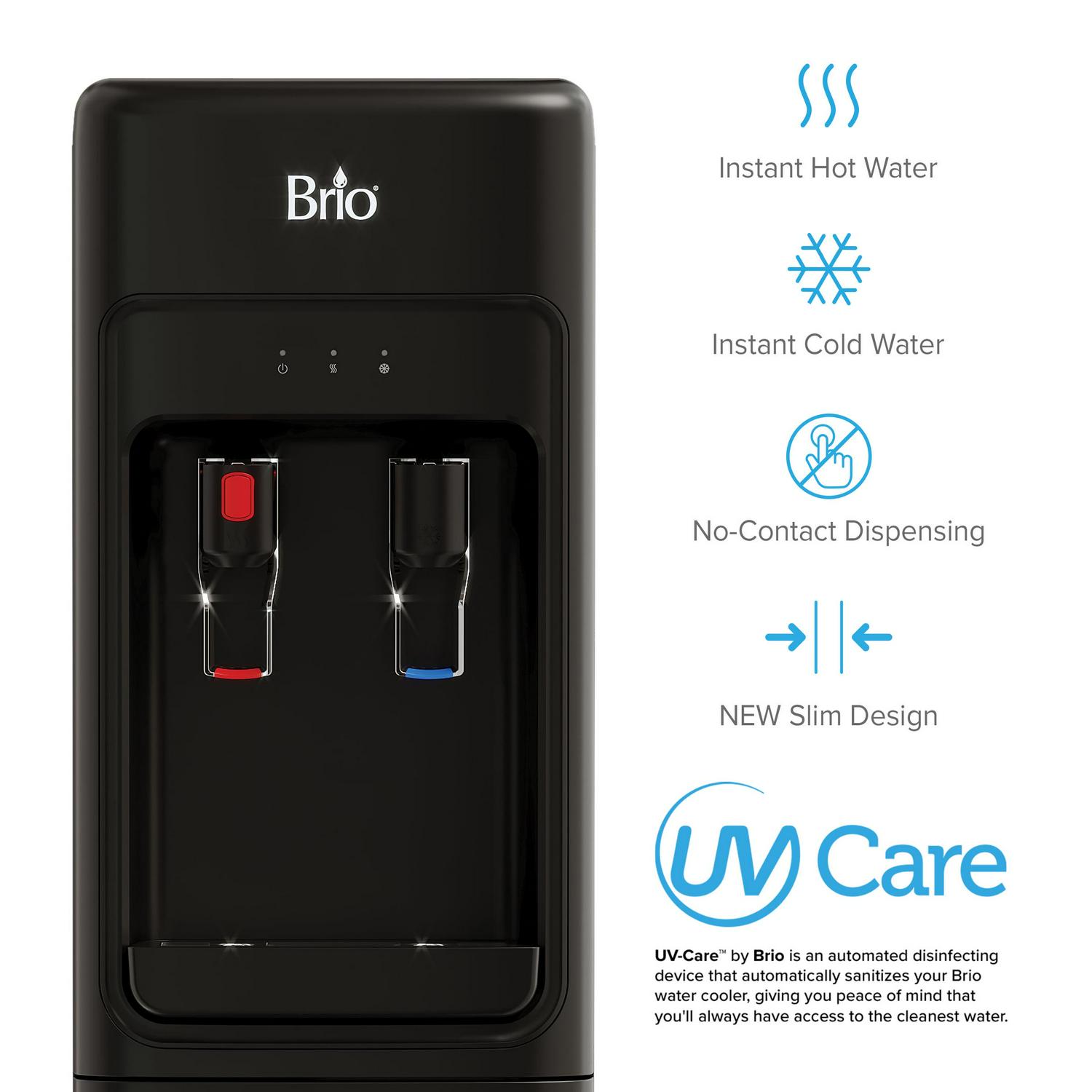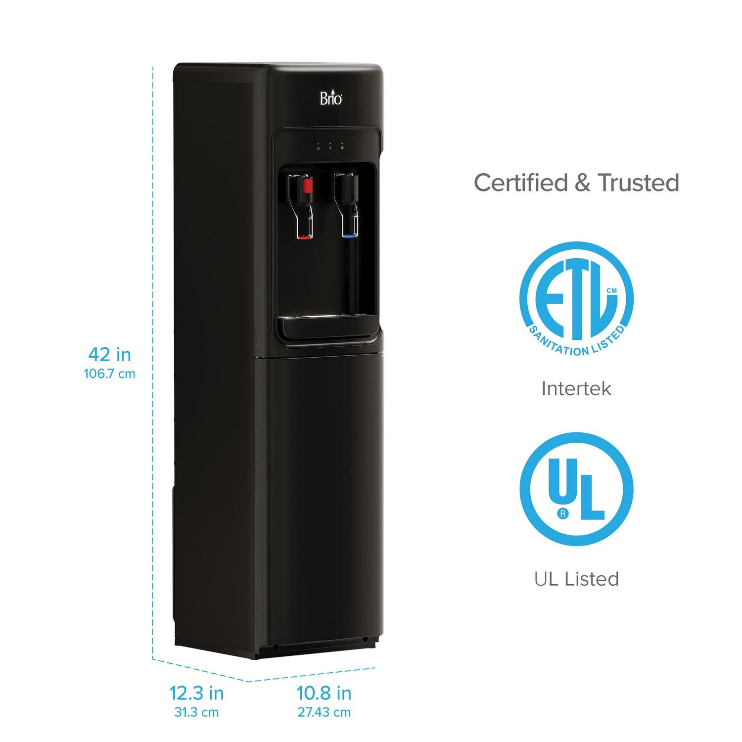 The Brio CLPOU320BSLUV2P Bottleless Water Dispenser with 3-Stage Filtration offers a quality hydration experience in every pour. This rugged cooler features both hot and cold dispensing options, and the three stages of filtration sediment, granular activated carbon, and carbon block ensure water is always refreshingly clean and delicious. LED indicator lights notifiy you when filters are nearing expiration, when water is heating and cooling, and when self-cleaning is underway. Plus, the 2-step hot water dispensing keeps the whole family safe from accidental dispensing. The cooler also makes dispensing easy with the convenient no-contact paddles that are designed to minimize contact with containers, reducing the risk of cross-contamination. The cooler connects directly to a cold water line, freeing you from expensive bottle delivery services or endless purchases of single-use bottles of water. The automatic self-cleaning ultraviolet function cycles on and off automatically, so you don’t have to do a thing. Count on the Brio Bottleless Water Dispenser with 3-Stage Filtration to bring sleek, modern style and on-demand filtered hydration to both homes and offices. Assembled Product Height 42″, Assembled Product Length 12.3″, and Assembled Product Width 10.8″.