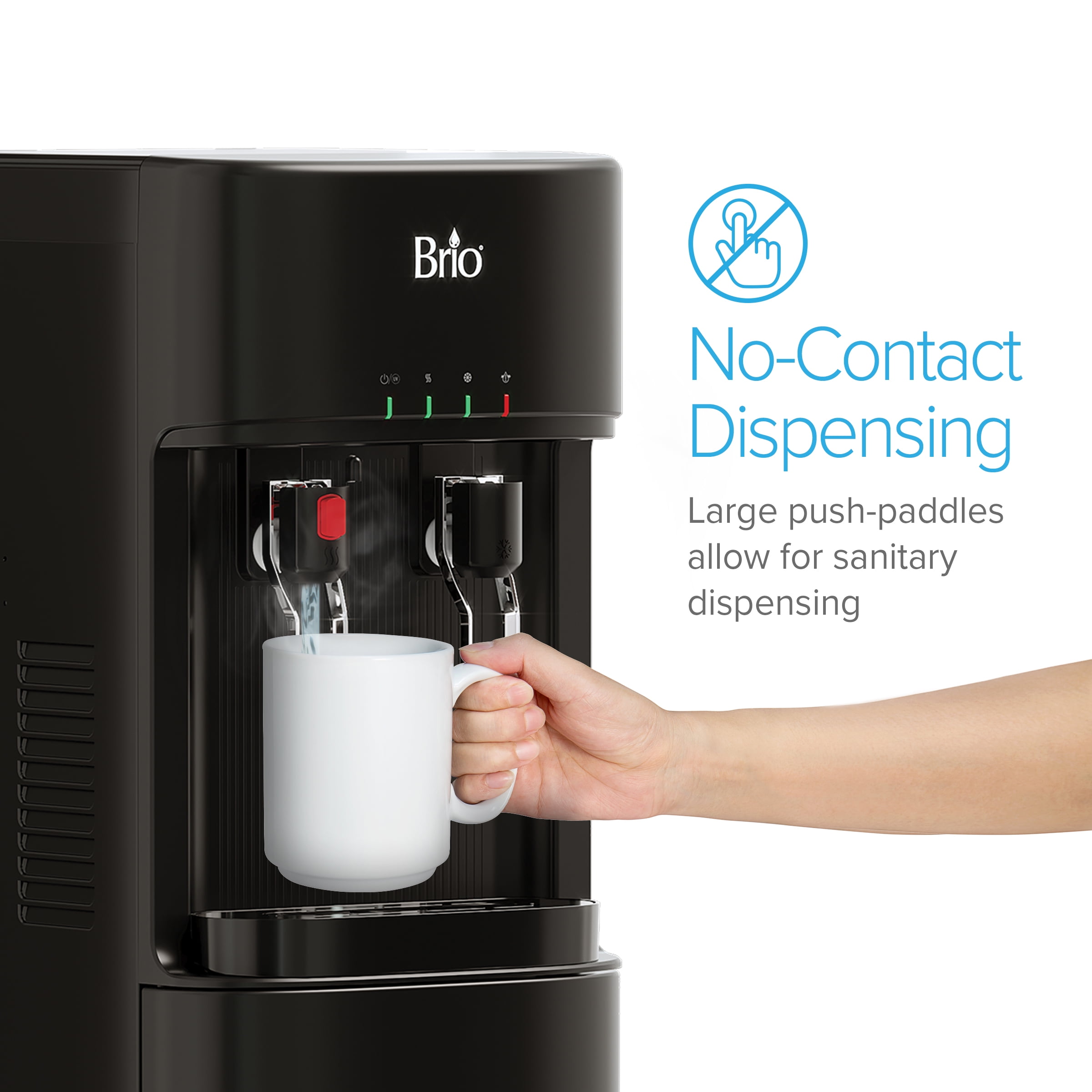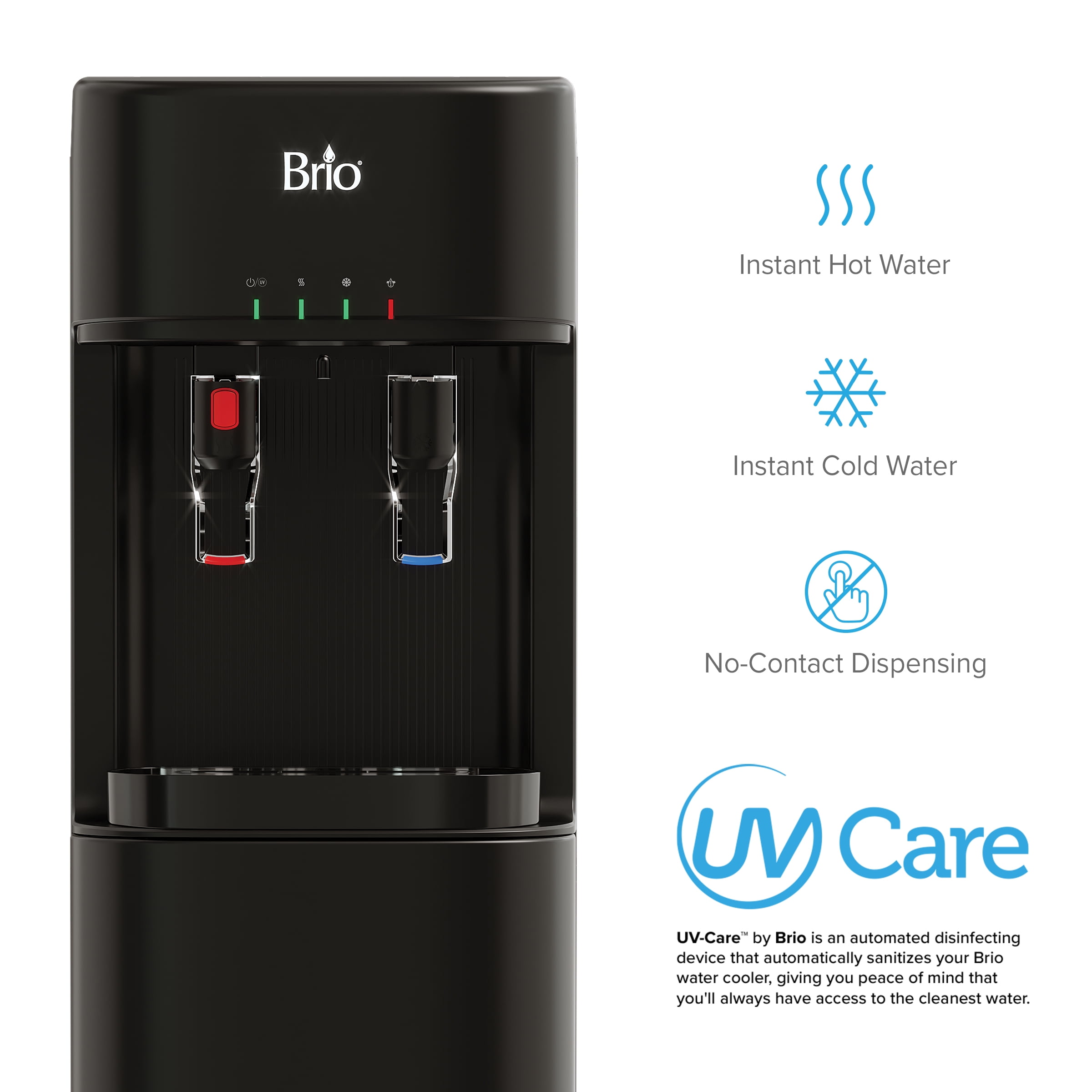 The Brio Bottleless Water Dispenser with 3-Stage Filtration offers a quality hydration experience in every pour. This rugged cooler features both hot and cold dispensing options, and the three stages of filtration–sediment, granular activated carbon, and carbon block–ensure water is always refreshingly clean and delicious. LED indicator lights notifiy you when filters are nearing expiration, when water is heating and cooling, and when self-cleaning is underway. Plus, the 2-step hot water dispensing keeps the whole family safe from accidental dispensing. The cooler also makes dispensing easy with the convenient no-contact paddles that are designed to minimize contact with containers, reducing the risk of cross-contamination. The cooler connects directly to a cold water line, freeing you from expensive bottle delivery services or endless purchases of single-use bottles of water. The automatic self-cleaning ultraviolet function cycles on and off automatically, so you don’t have to do a thing. Count on the Brio Bottleless Water Dispenser with 3-Stage Filtration to bring sleek, modern style and on-demand filtered hydration to both homes and offices.
