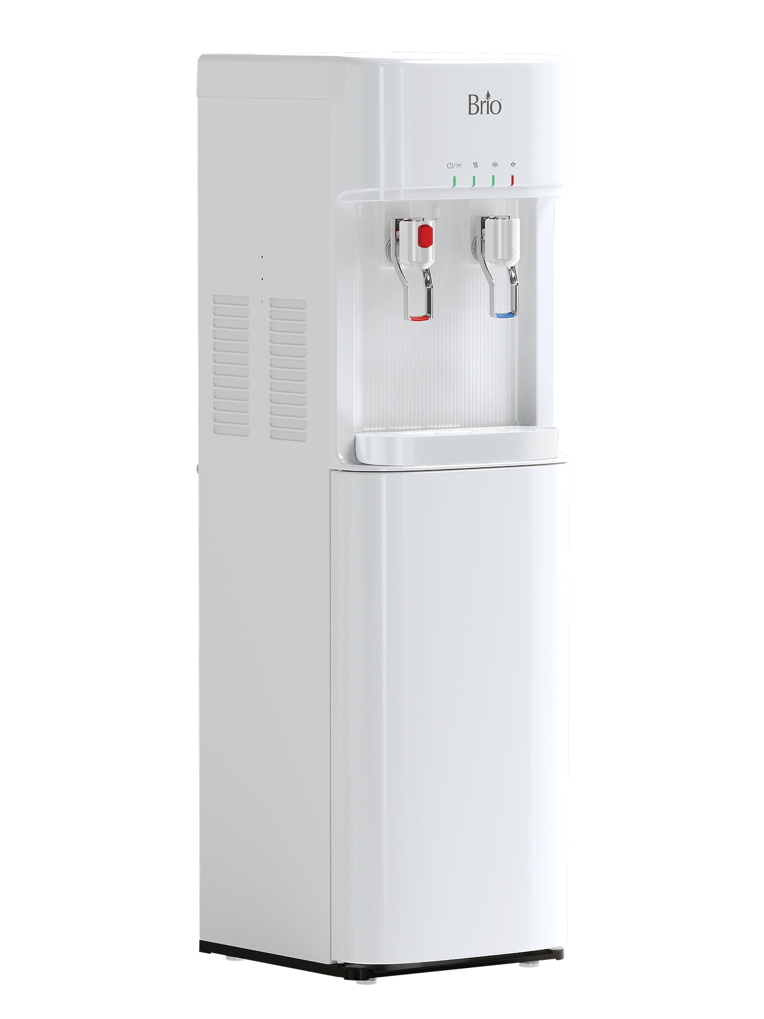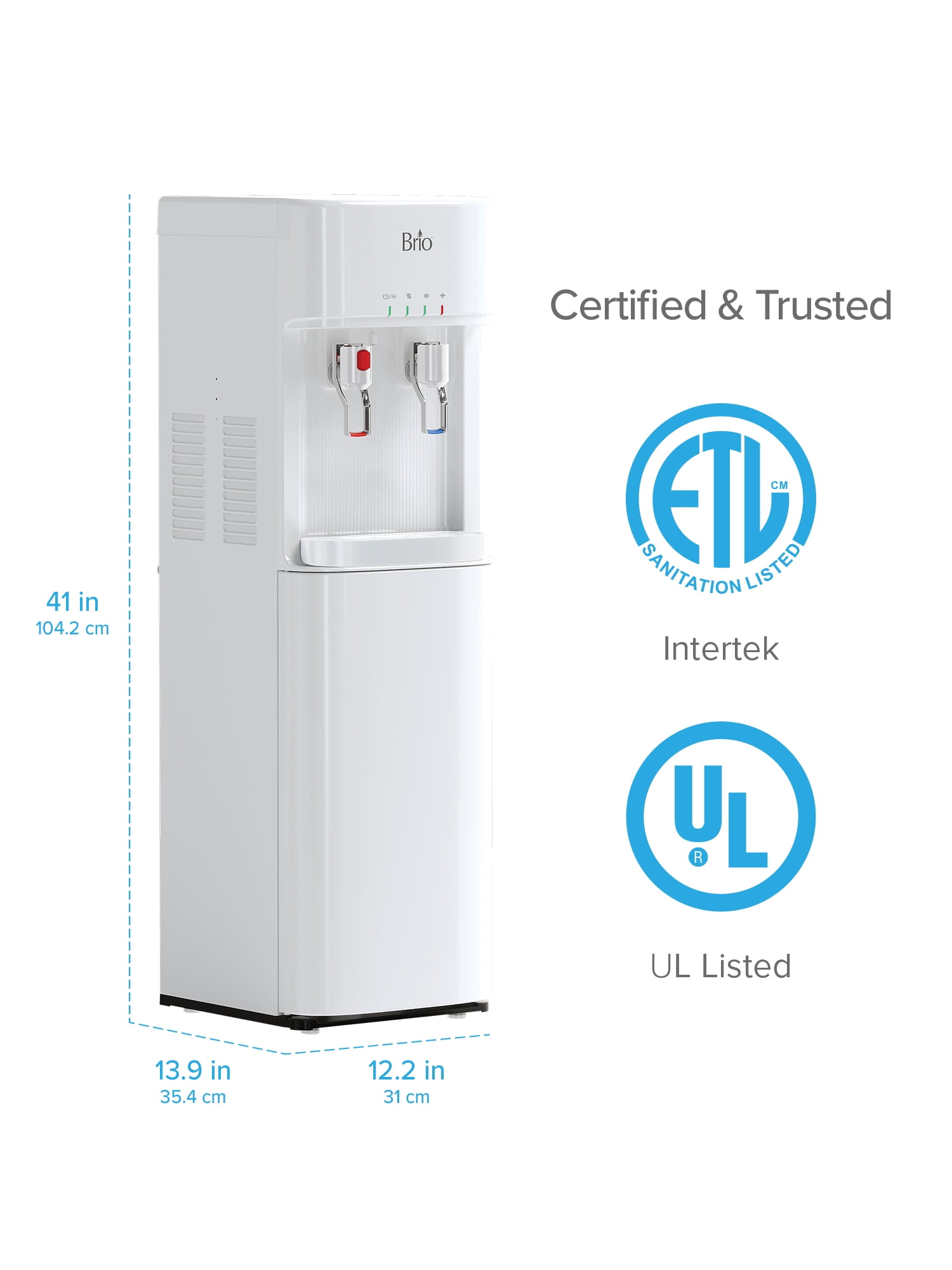 The Brio CLPOU320WUVF4P Bottleless Water Dispenser with Ultrafiltration offers a quality hydration experience in every pour. This cooler features both hot and cold dispensing options, the four stages of filtration sediment, granular activated carbon, ultrafiltration, and post carbon–ensure water is always refreshingly clean and delicious. LED lights notify you when filters are nearing expiration, when water is heating and cooling, and when self-cleaning is underway. Plus, the 2-step hot water dispensing keeps the whole family safe from accidental dispensing. The cooler connects directly to a cold water line, freeing you from expensive bottle delivery services or endless purchases of single-use bottles of water. The automatic self-cleaning ultraviolet function cycles on and off automatically, so you don’t have to do a thing. Count on the Brio Bottleless Water Dispenser with Ultrafiltration to bring sleek, modern style and on-demand filtered hydration to both homes and offices.