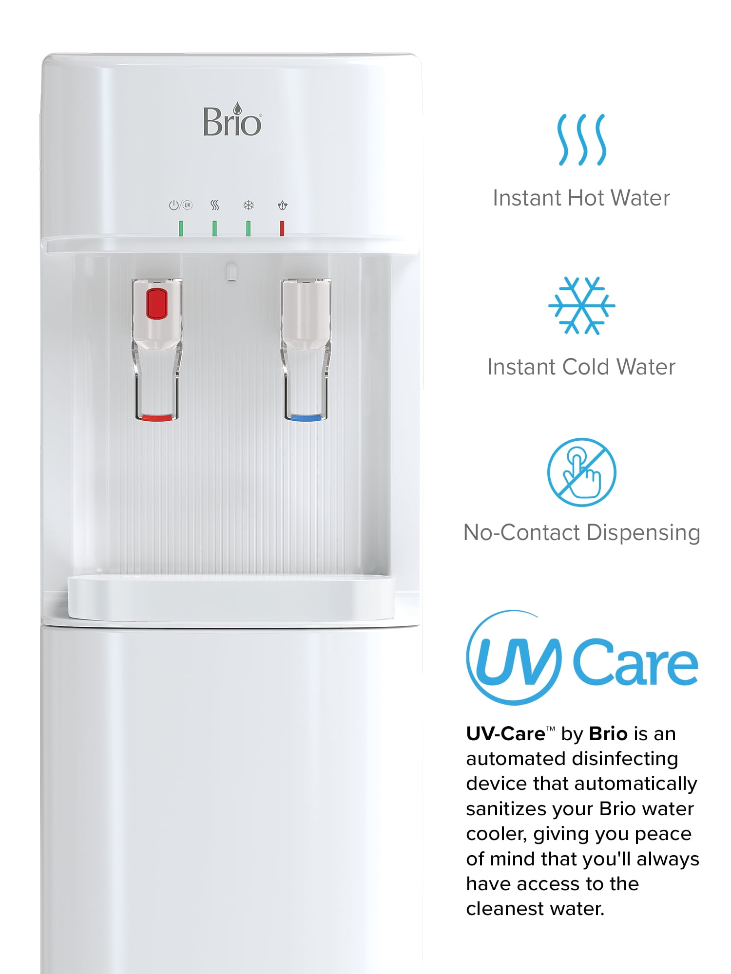 NO-CONTACT DISPENSING: Unlike a typical paddle water cooler, the Brio bottleless water cooler features innovatively designed dispense paddles that minimize contact, significantly reducing the chance of container cross-contamination for peace-of-mind dispensing. Includes child safety lock on hot water so the whole family stays safe REPLACEMENT FILTERS: For replacement filters search for “MIB400PKUF” 4-Stage Filter Replacement Kit WHAT’S INCLUDED: Point-of-use water dispenser, sediment filter, pre carbon filter, ultrafiltration filter, post carbon filter, installation kit, user manual SELF-CLEANING UV: An automatic process uses ultraviolet light to reduce biofilm buildup and other accumulated impurities in dispenser’s water and reservoirs. Keeps water consistently delicious and minimizes cooler maintenance HOT & COLD W/ ULTRAFILTRATION: Piping hot and crisply cold water are sent through 4 powerful stages of filtration, ensuring water is always clean and delicious. NSF 42-certified sediment, pre carbon, and post carbon filters reduce dirt, chlorine and chlorine byproducts, while ultrafiltration filter, rated at 0.1 microns, reduces cysts, PFAS, lead, and other harmful contaminants BOTTLELESS: This point-of-use water dispenser conveniently connects directly to your home or office’s own cold water line, so an endless supply of clean, filtered water is always available. And its sleek aesthetic adds a modern touch to homes and offices CONVENIENT LED LIGHTS: Bright indicator lights alert you when water is heating and cooling, when the self-cleaning UV cycle is underway, and when filters are nearing end of life and need to be replaced, so your always on top of your water’s status REPLACEMENT FILTERS: For replacement filters search for “MIB400PKUF” 4-Stage Filter Replacement Kit