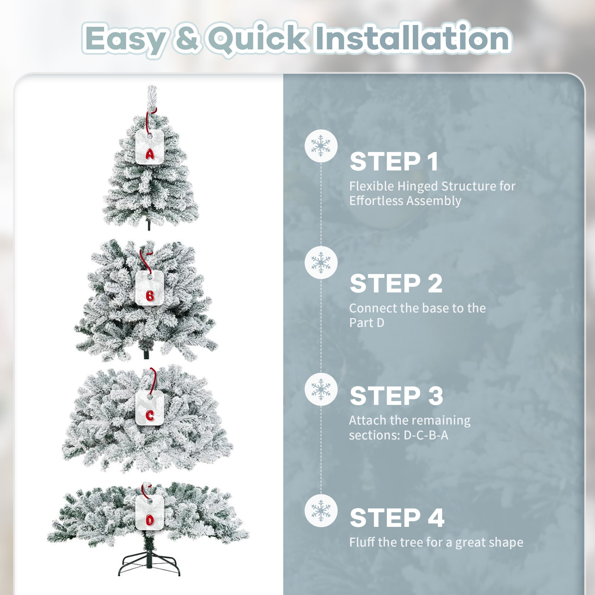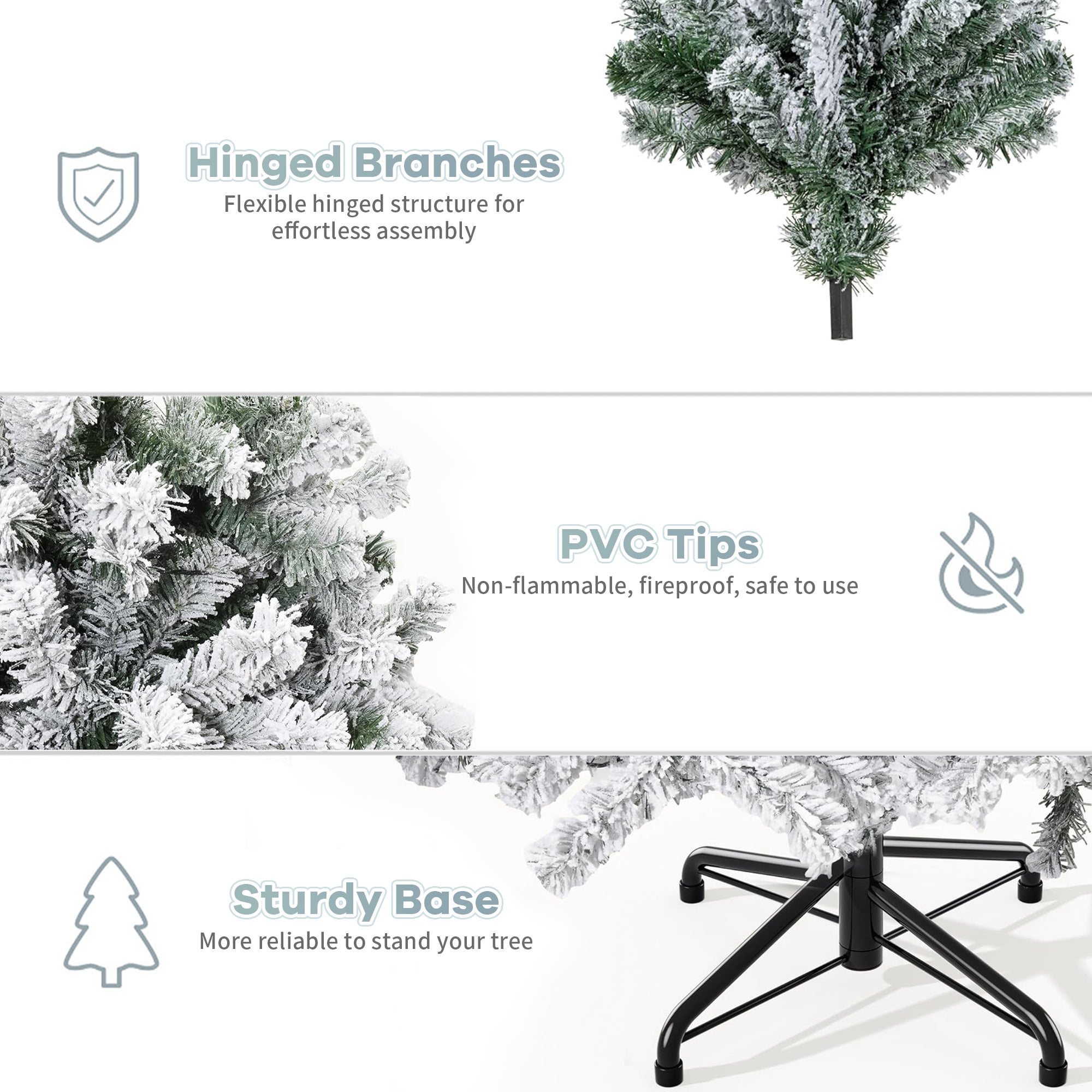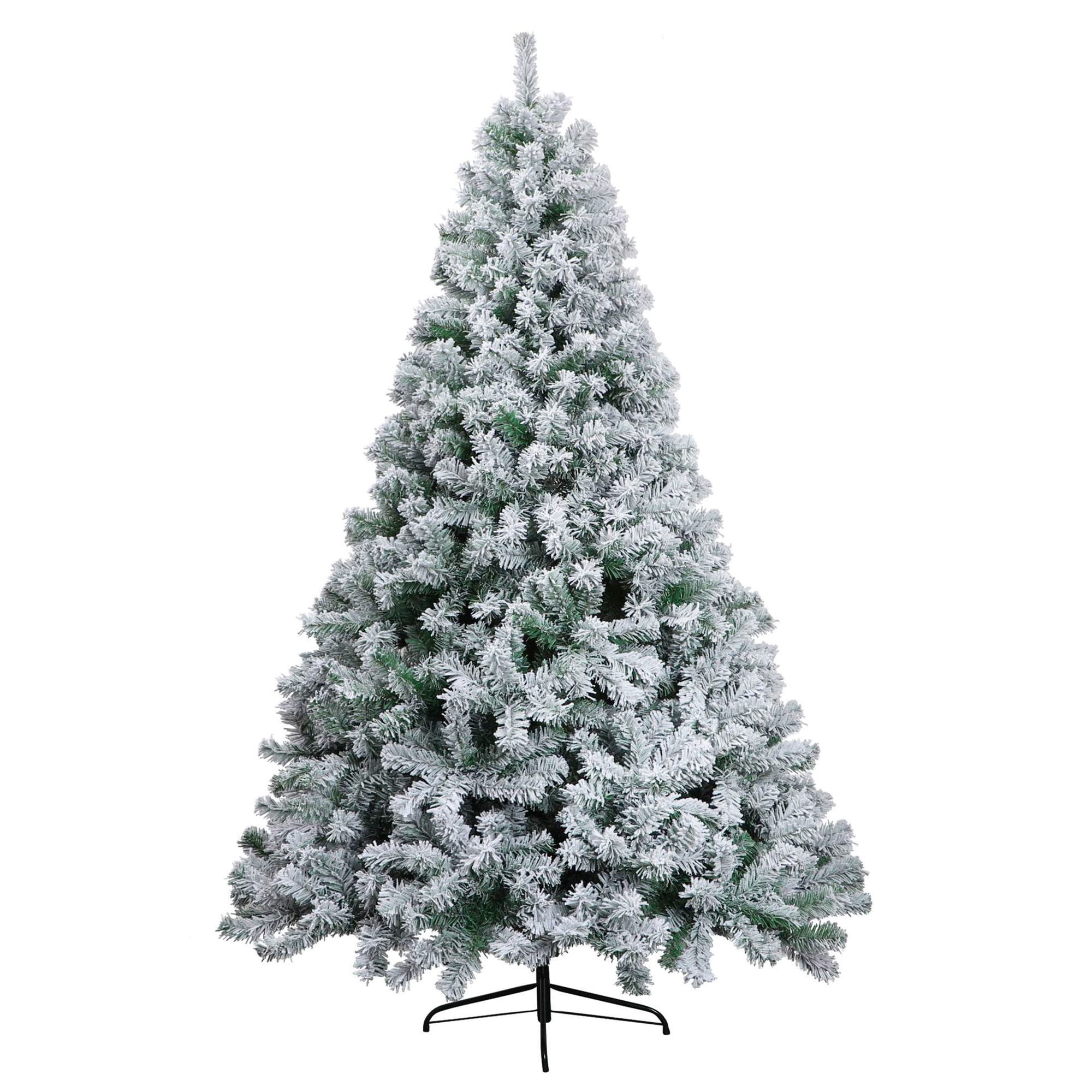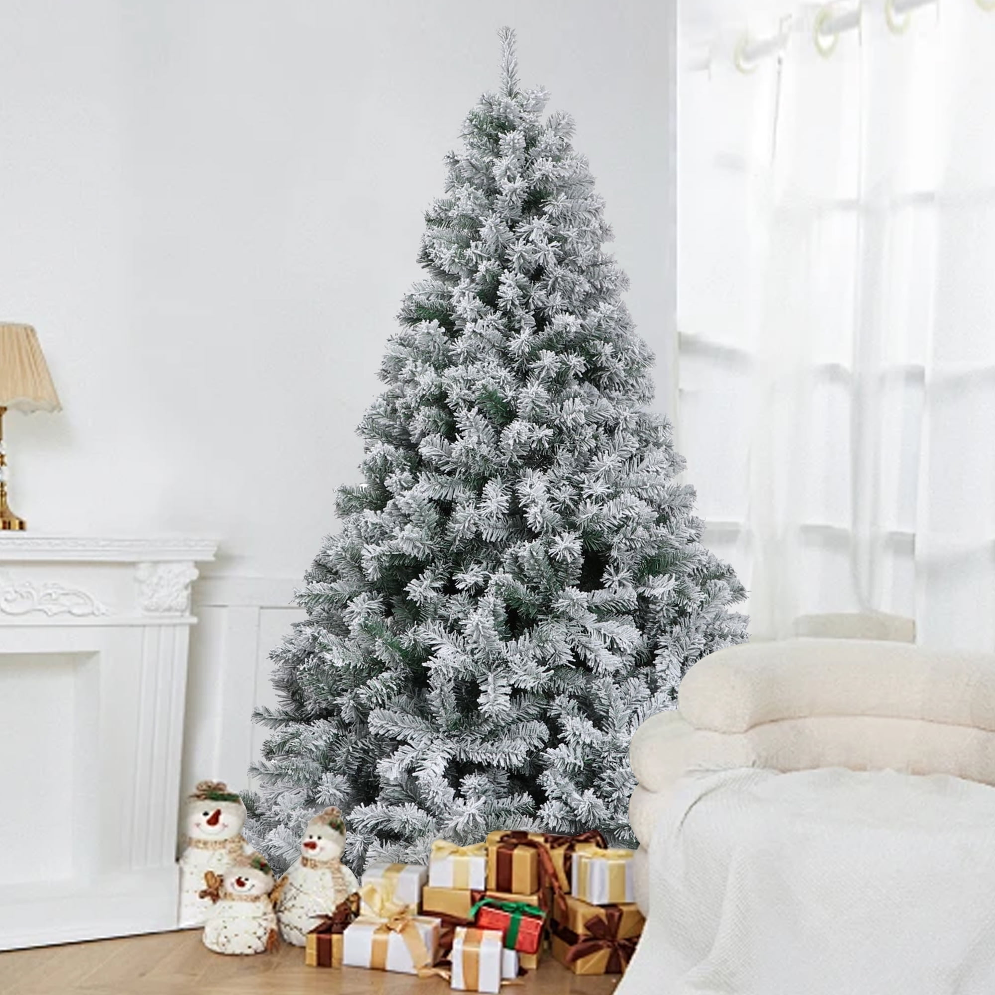 KEY FEATURES: 🎄Snow Flocked Style🎄 Spark festive cheer with our 7.9 ft snow flocked artificial Christmas pine tree; Its distinct, snow-covered appearance and 1100 bendable branch tips can be conveniently decorated with ornaments for an elegant and tailored holiday vibe. 🎄Direct Assembly with Minimal Fluffing🎄 Enjoy easy assembly thanks to the tree trunk’s pre-attached hinged branches; Branches automatically fall into place with minimal fluffing required for added convenience, saving you valuable time during the busy holiday season. 🎄Safe & Sturdy Over Time🎄 X-shaped iron stand and thickened base offer immense stability and durability; Robust branches and thickened foliage aptly hold your favorite decorations for a personalized look; Built from odorless, flame-retardant materials so you can enjoy peace of mind. 🎄Reusable and Easy to Store🎄 This flocked Christmas tree and stand can be easily folded for compact storage, making it reusable year after year while maintaining fullness. 🎄Customisable Decorations🎄 Ideal for homes, weddings, Christmas, holidays, restaurants, malls, hotels, and commercial buildings; Personalize the undecorated tree with garlands, lights, bells, stockings, or any other elements you prefer. Note: It’s normal to find flocking shedding during assembly, which will not affect the final appearance.
