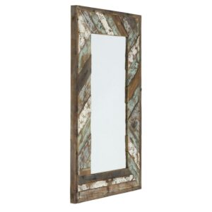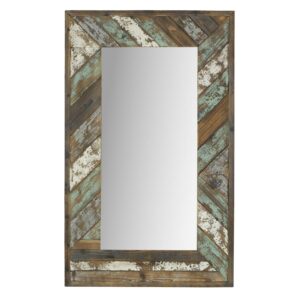 Colorful reclaimed wood is a look that everybody loves. Drawing on this appeal, the Brogan wall mirror is a home accent that will enrich your space. The distressed solid Fir wood slats are painted and sanded, then pieced together at unique angles that adds to the overall design.