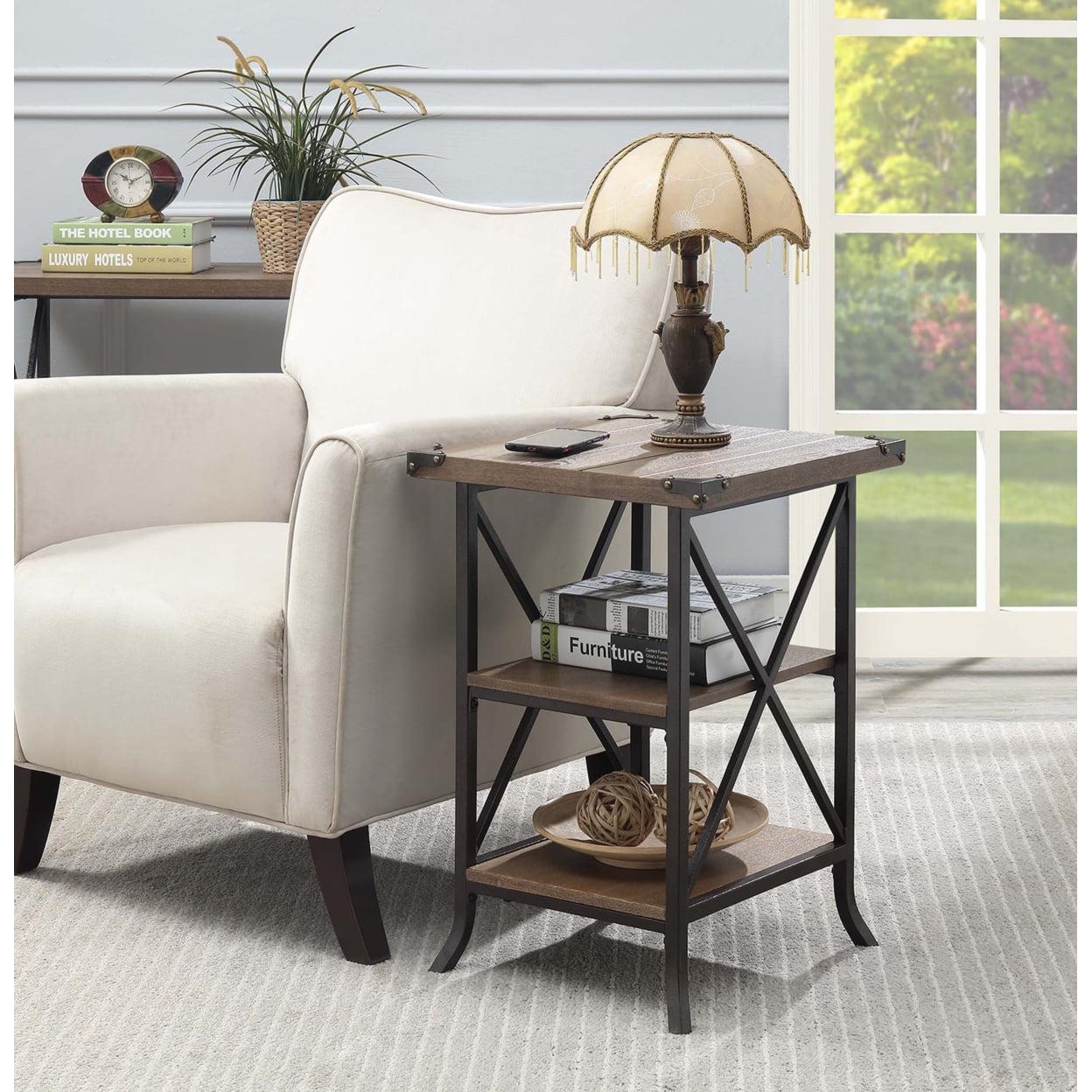 Brookline End Table, Brown Give your space a charming makeover with the Brookline End Table by Convenience Concepts. Featuring a grooved top panel paired with decorative metal corner protectors that give this piece elegant character. Both the middle and bottom shelves allow plenty of space for you to store and display your favorite collectibles. Constructed from a hammered metal frame with slightly scrolled feet ensures that this piece will guarantee style and stability.