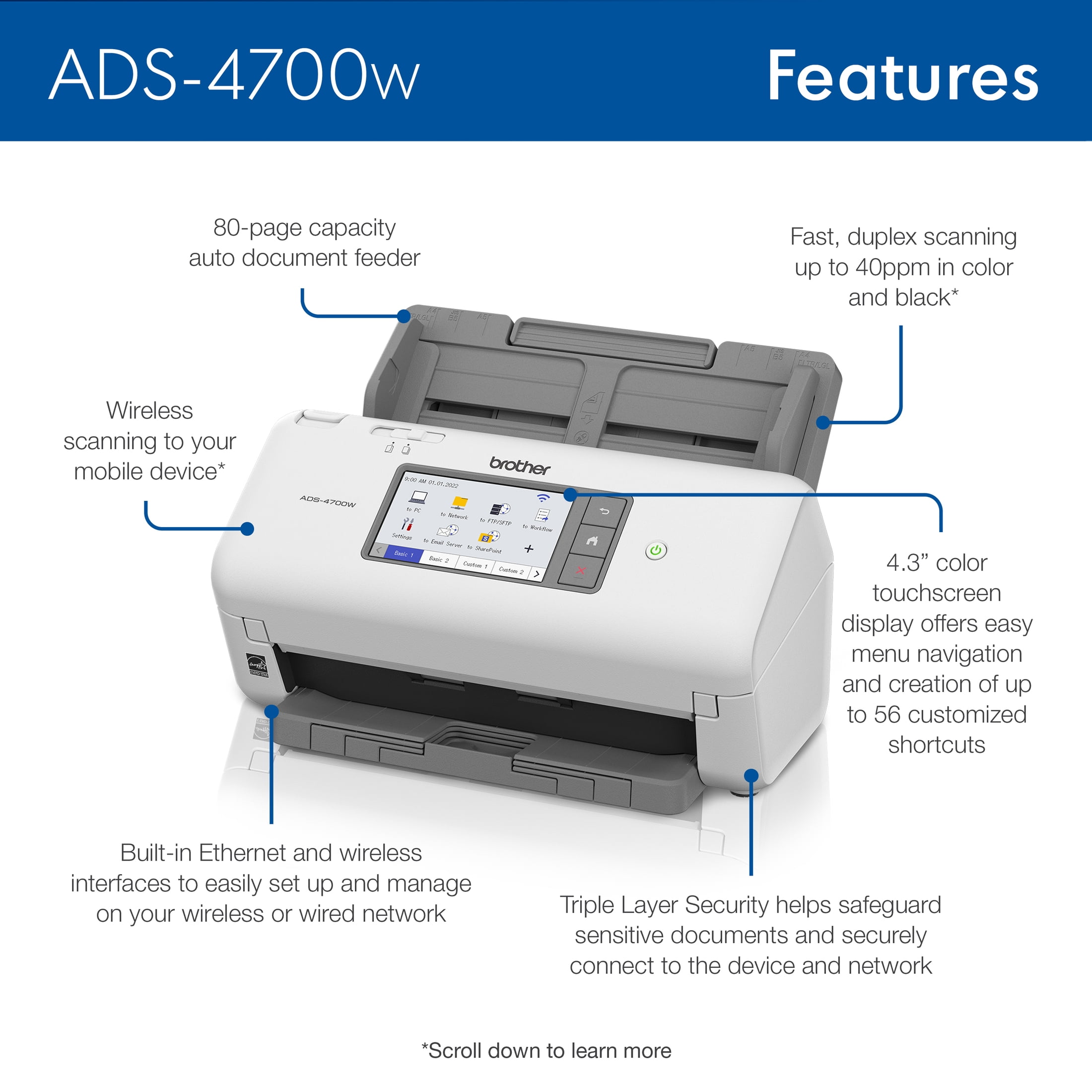 The Brother ADS-4700W Professional Desktop Scanner is an essential component of an optimized fleet for the way work now works – providing easy integration with existing workflows, versatile scan-to destinations, and improved productivity. Equipped with fast, two sided scanning up to 40ppm1 to help maximize workgroup productivity. Quickly scan stacks of paper with various sizes and weights via the 80-page capacity auto document feeder to help optimize efficiency and productivity. The 4.3” color touchscreen display offers easy menu navigation and the ability to create up to 56 customizable shortcuts for one-touch scanning to multiple destinations and scan job preview. Offers Triple Layer Security features to help limit document and device access and protect against network intrusions. Provides wide driver support (TWAIN, WIA, ISIS, and SANE) for compatibility with existing software applications and document management systems. Enables scanning to variety of cloud applications2 including Google Drive™, Dropbox, and OneDrive, as well as email, SharePoint, SSH Server (SFTP), USB memory stick, and more, for easy collaboration. Equipped with a powerful bundled software suite to create, edit, and convert scanned documents into a wide variety of file formats including Searchable PDFs, Secure PDFs, Word, Excel, and PowerPoint. Maximize output quality with integrated image optimization features, such as Auto Deskew, Auto Image Rotation, and Bleed-through Removal. Features built-in wireless and Ethernet network interfaces to easily set up and share on your wired or wireless network. Ideal for busy offices and workgroups, scan-to your mobile device3 with AirPrint® and Brother Mobile Connect. The ADS-4700W is also ENERGYSTAR® compliant and EPEAT® Silver rated, making it an energy-efficient choice for your document capture needs. Includes a three-year standard limited warranty for peace of mind, as well as free online, live chat, or phone technical assistance for the life of your product.