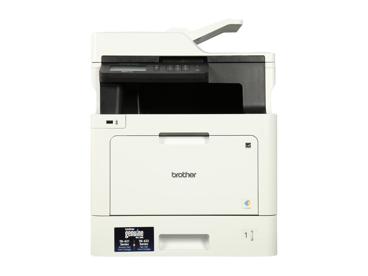 FAST PRINT & COPYING: The Brother MFC-L8610CDW can print and copy up to 33 pages per minute and produces business-quality color documents. FAST, ADVANCED SCANNING CAPABILITY: Supports multiple scan-to destinations such as email, USB, SharePoint, Cloud Services, Network more.(1) ADVANCED SECURITY FEATURES: This office color laser all-in-one helps limit device and document access and help lower costs by restricting color printing. FLEXIBLE NETWORK CONNECTIVITY: Built-in wireless 802.11b/g/n and Gigabit Ethernet interfaces allow you to share the MFC-L8610CDW with multiple users. CONVENIENT MOBILE DEVICE PRINTING AND SCANNING: Print from your mobile device via AirPrint®, Google Cloud Print™ 2.0, Mopria®, Brother iPrint&Scan, Cortado Workplace and Wi-Fi Direct®. Plus, wirelessly scan to your mobile device with the Brother iPrint&Scan app(2). FLEXIBLE PAPER HANDLING: Easily handle your large print jobs via an adjustable 250-sheet capacity paper tray and 50-sheet capacity multi-purpose tray. Additional optional paper trays are available in 250-sheet capacities (for an up to 1,050-sheet total capacity). 3.7” COLOR TOUCHSCREEN: Allows for easy menu navigation and creation of up to 48 customized shortcuts. Plus, scan to popular business cloud services(1) directly from the Touchscreen including: EVERNOTE®, DROPBOX, GOOGLE DRIVE™, ONENOTE, and more. FOR USE WITH BROTHER GENUINE TONERS: TN431 Standard Yield: TN431BK, TN431C, TN431Y, TN431M, TN433 High Yield Toners: TN433BK, TN433C, TN433Y, TN433M FOOTNOTES: (1)Requires an Internet connection and an account with desired service. (2) Requires connection to a wireless network. AirPrint is a registered trademark of Apple Inc. ©2017 Google LLC. All rights reserved. Google Cloud Print is a trademark of Google LLC. Mopria® is a registered trademark or service mark of Mopria Alliance, Inc. in the United States and other countries. Unauthorized use is strictly prohibited. Cortado is a trademark of Cortado AG. Wi-Fi Direct is a registered trademark of Wi-Fi Alliance®.