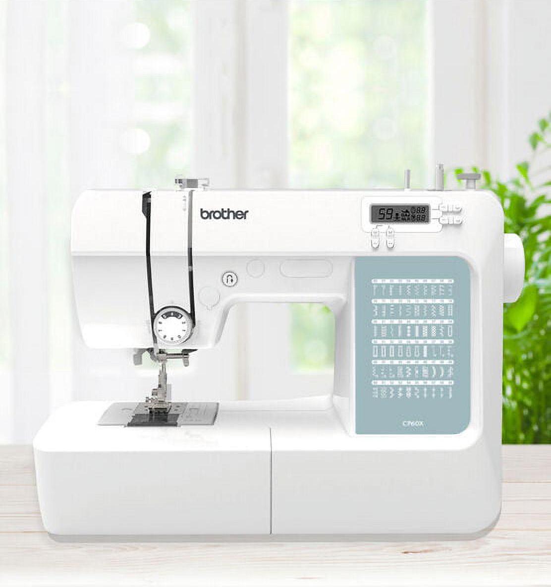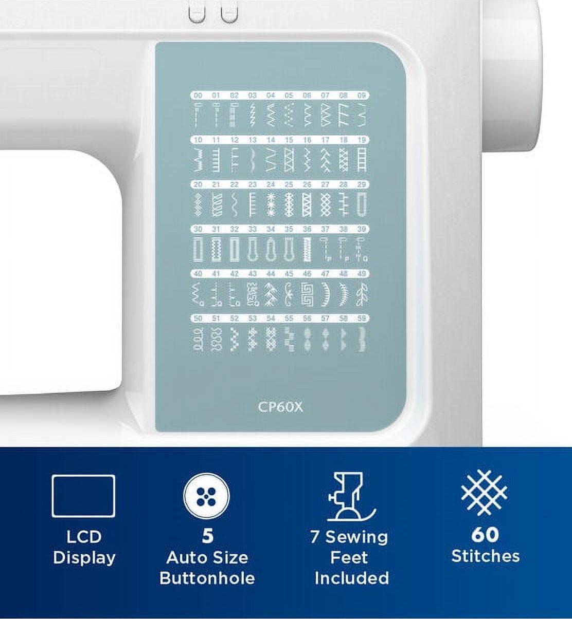 The Brother CP60X is perfect for beginners who are learning how to sew and for more advanced sewers who are looking for versatility. With the CP60X computerized sewing machine, you can enjoy a full range of features in a compact yet durable footprint, great for traveling and for small space work areas. The CP60X comes with 60 built-in stitches, including 7 styles of auto-size one-step buttonholes. Selecting your stitch is as easy as pressing a button with the easy stitch selector and sharp LCD screen. Experience virtually effortless sewing on denim, tweed, and other thick fabrics with the exceptional feed system and fixed needle bar. Utilize drop feed dogs and try free-motion sewing or the free arm capability to make sewing cuffs, sleeves, and skinny jeans a breeze. Also included are 7 first-rate sewing feet to help you achieve a variety of sewing techniques. Complete with an advanced needle threading system that makes threading easy, a Quick-Set bobbin, and a super bright LED-lit work area, the CP60X will have you creating DIY projects and garments in no time.