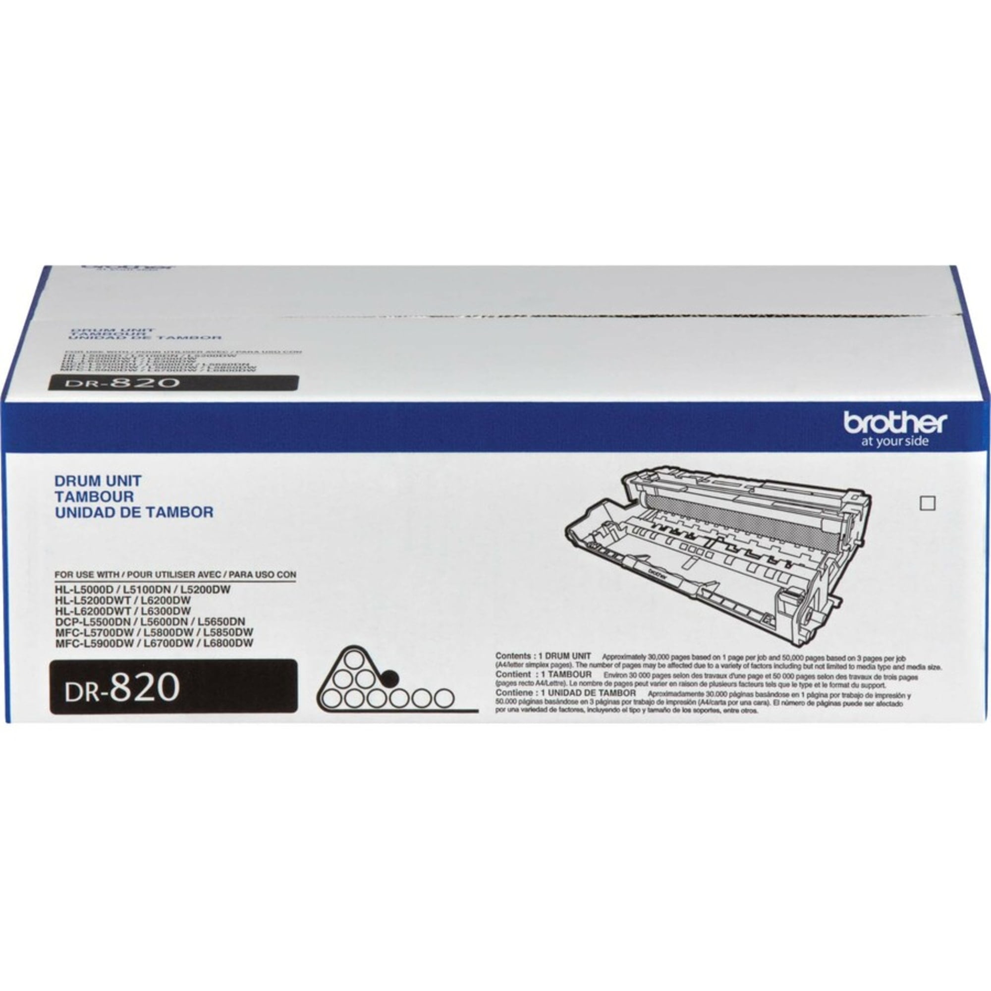 Brother Genuine DR-820 drum unit. Delivers crisp, professional output with 30,000-page yield1. Designed as part of a complete printing system to provide high-quality results.4.Precisely balanced for even flow and consistent toner distribution on the paper. Brother offers an environmentally responsible way for customers to recycle Brother Genuine cartridges. Visit to learn more. The Brother Genuine DR-820 Drum Unit is for use with the Brother DCP-L5500DN, DCP-L5600DN, DCP-L5650DN, HL-L5000D, HL-L5100DN, HL-L5200DW, HL-L5200DWT, HL-L6200DW, HL-L6200DWT, HL-L6300DW, MFC-L5700DW, MFC-L5705DW, MFC-L5800DW, MFC-L5850DW, MFC-L5900DW, MFC-L6700DW, and MFC-L6800DW. Disclaimer: *Approximately 30,000 pages based on 1 page per job and 50,000 pages based on 3 pages per job [letter/A4 simplex pages]. The number of pages may be affected due to a variety of factors including but not limited to media type and media size
