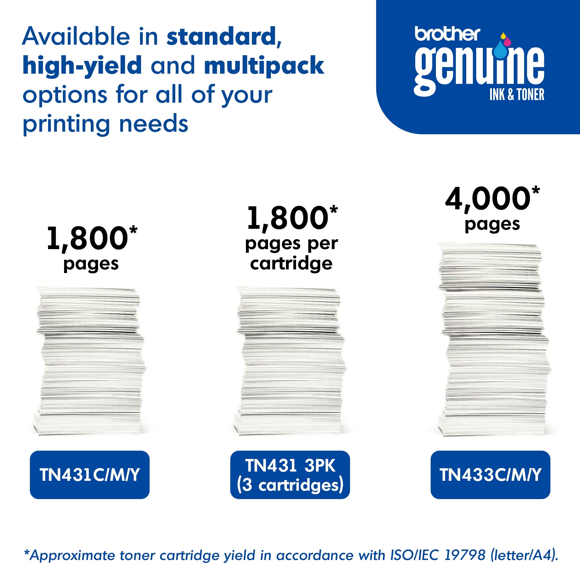 Brother Genuine Standard-Yield Color Toner Cartridge Three Pack contains one cartridge each of TN431 Cyan, Magenta, and Yellow toner that deliver professional, laser-quality prints that you can rely on for up to 1,800 pages per cartridge(1) Using Brother multi-pack toner helps cut down on the frequency of replacement orders and offers a convenient way to always have replacement toner on hand Brother Genuine laser toner is intelligently engineered to work in seamless unison with your Brother printer Brother Genuine color toner produces rich, vivid laser-quality prints that withstand the test of time Brother offers an environmentally responsible way for customers to dispose of Brother Genuine cartridges. Visit to learn more Brother Genuine Standard-Yield Color Toner Cartridge Three Pack TN431 3PK is for use with: HL-L8260CDW, HL-L8360CDW, HL-L8360CDWT, MFC-L8610CDW, MFC-L8900CDW Disclaimer: ¹Approximate toner cartridge yields in accordance with ISO/IEC 19798(Letter/A4).