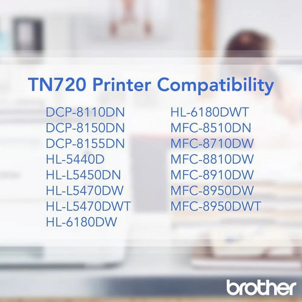 Brother Genuine TN720 Standard-yield Mono Laser Toner Cartridge. Professional mono laser print quality you can consistently rely on for up to 3,000 pages‡. Intelligently engineered to work in seamless unison with your Brother printer. Brother Genuine toner produces crisp, sharp prints that withstand the test of time. Brother offers an environmentally responsible way for customers to dispose of Brother Genuine cartridges. Visit to learn more. Brother Genuine TN720 is for use with: DCP-8110DN, DCP-8150DN, DCP-8155DN, HL-5440D, HL-5450DN, HL-5470DW, HL-5470DWT, HL-6180DW, HL-6180DWT, MFC-8510DN, MFC-8710DW, MFC-8810DW, MFC-8910DW, MFC-8950DW, MFC-8950DWT. Disclaimers: *Approximate cartridge yield in accordance with ISO/IEC 19752 (letter/A4).