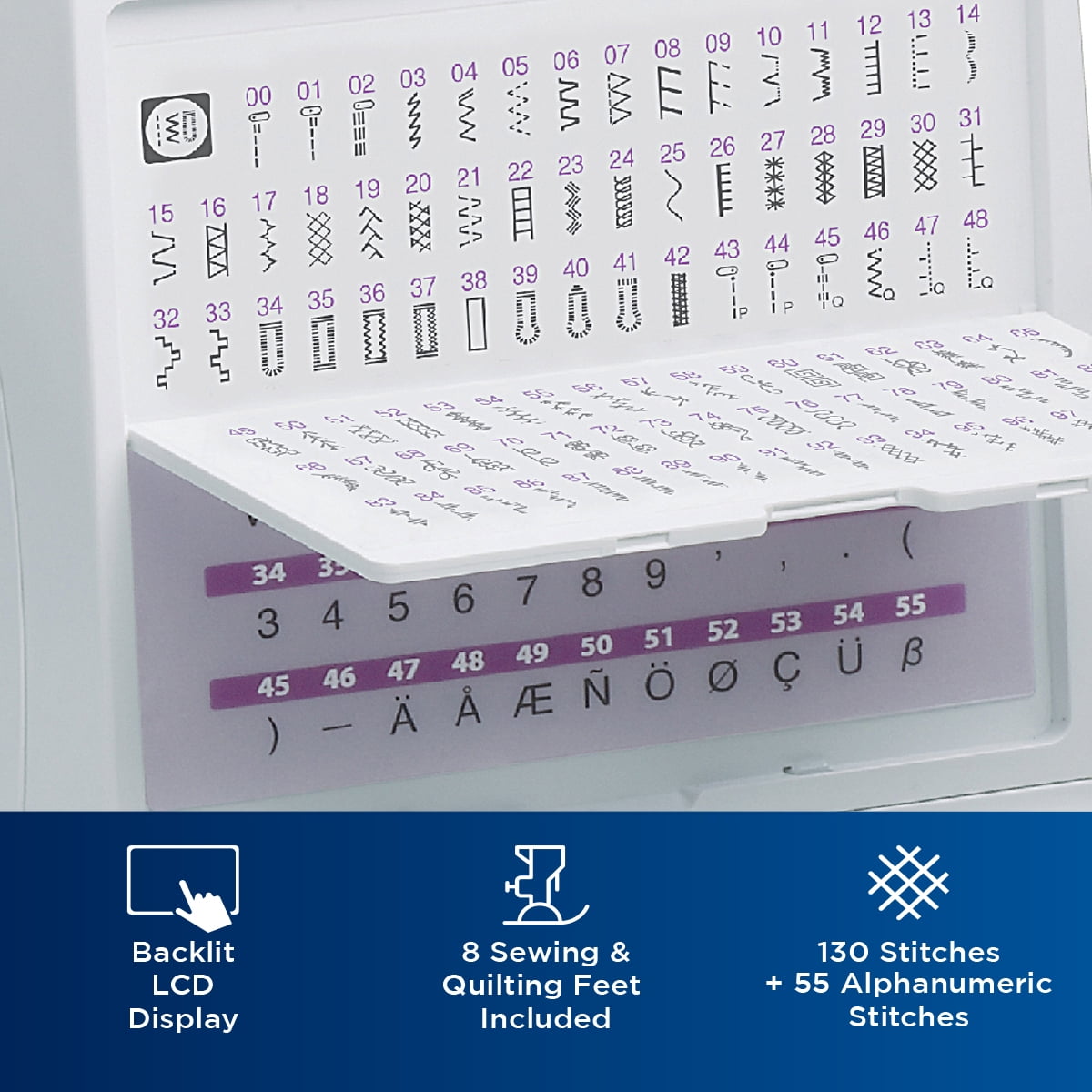Brother HC1850 Computerized Sewing and Quilting Machine with 130 Stitches: 185 Unique built-in stitches: The HC1850 includes 130 sewing stitches including 8 styles of auto-size buttonholes, plus 55 alphanumeric sewing stitches Advanced needle threader and drop-in top bobbin: This sewing and quilting machine includes an advanced needle threading function that easily pushes thread through the needle with the press of a lever and a jam resistant drop-in top bobbin Included accessories: The HC1850 quilting and sewing machine includes a wide table, 8 feet, instructional DVD, manual and more LCD Screen: Easily select your stitches with the touch of a button and view your selections on the LCD display At your side support: The HC1850 quilting and sewing machine comes with Brother At your side support offering free technical support via online, live chat or phone for the life of your machine Weight 10.1 pounds Needle Threader: Automatic Table: 1 wide table Free Arm: Yes Buttonholers: 1 step automatic, 8 styles Speed options: Three Monogramming: 1 font complete with (0-9) numbers, letters (A-Z), specialty symbols (total of 8), and punctuation marks (total of 7). Stitch width: 7mm Stitch length: 5mm