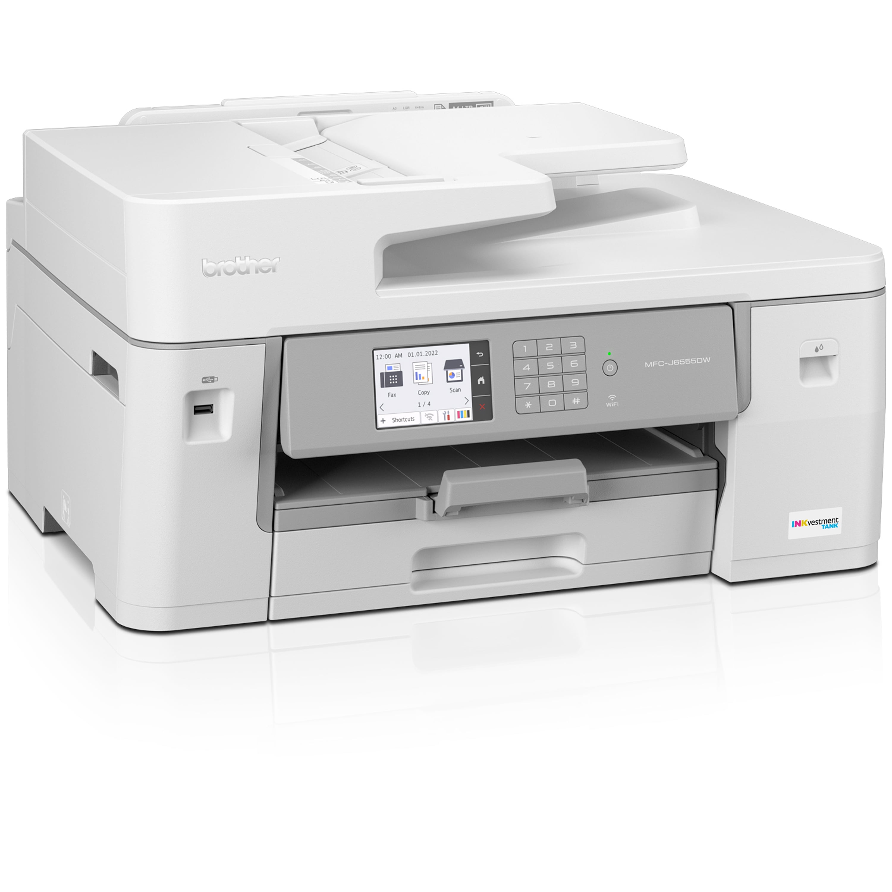 You can INK BIG with MFC-J6555DW Brother INKvestment Tank color inkjet all-in-one printer, complete with up to 1 year of Ink in-box(1). Print, copy, scan and fax up to 11”x17” (ledger) size paper all powered by Brother MAXIDRIVE Inkjet Technology. This dynamic printer delivers super sharp images, text and graphics with print speeds of up to 30 pages per minute(2), black and color. It’s perfect for printing marketing materials, reports, or handouts. Robust Triple Layer Security helps safeguard sensitive documents and securely connect to the device and network while printing. Work the way you want – it’s easy to connect and print wired, wirelessly(3)(2.4GHz / 5GHz), or even on the go with the Brother Mobile Connect App(4). Built to last and designed for exceptional ease of use right out of the box.