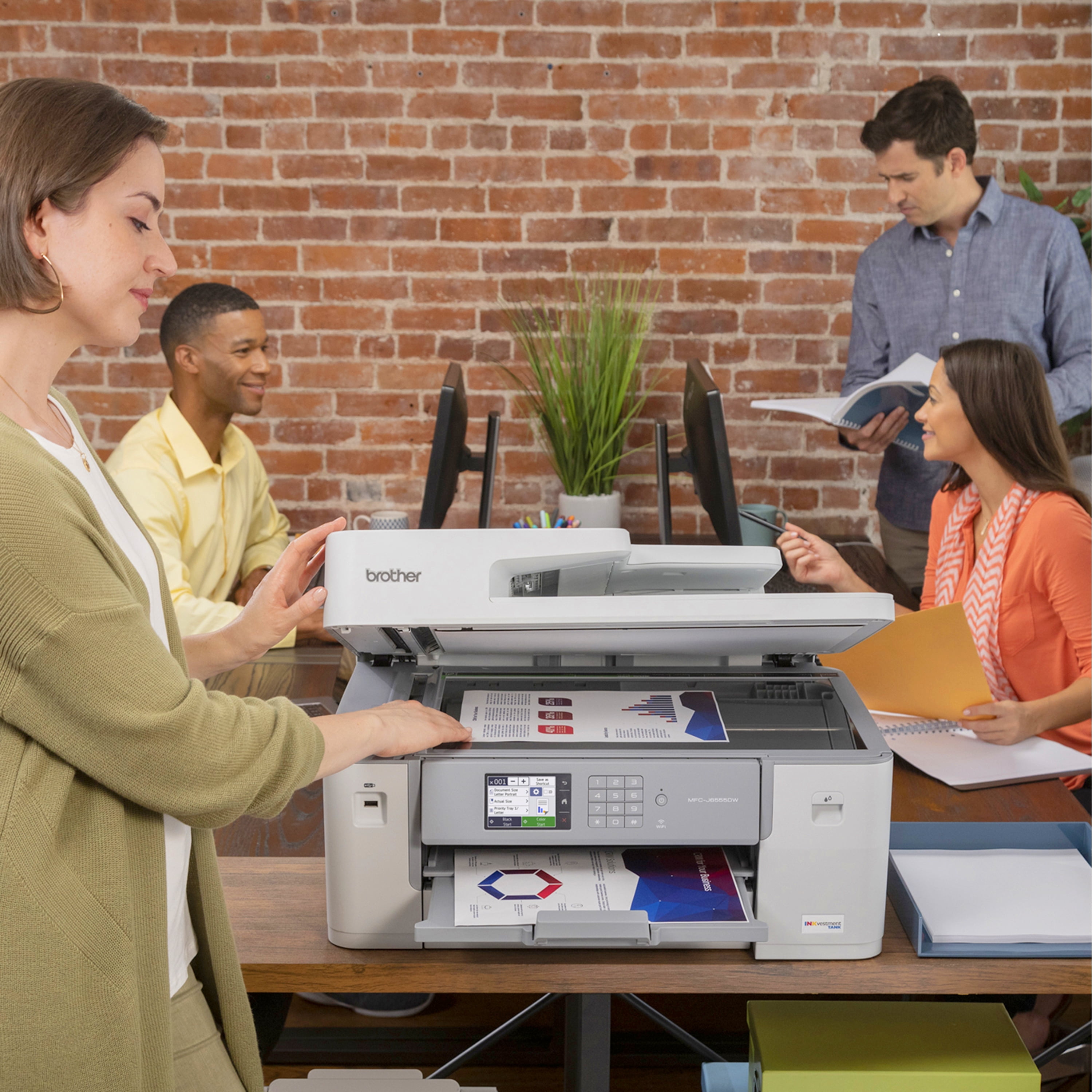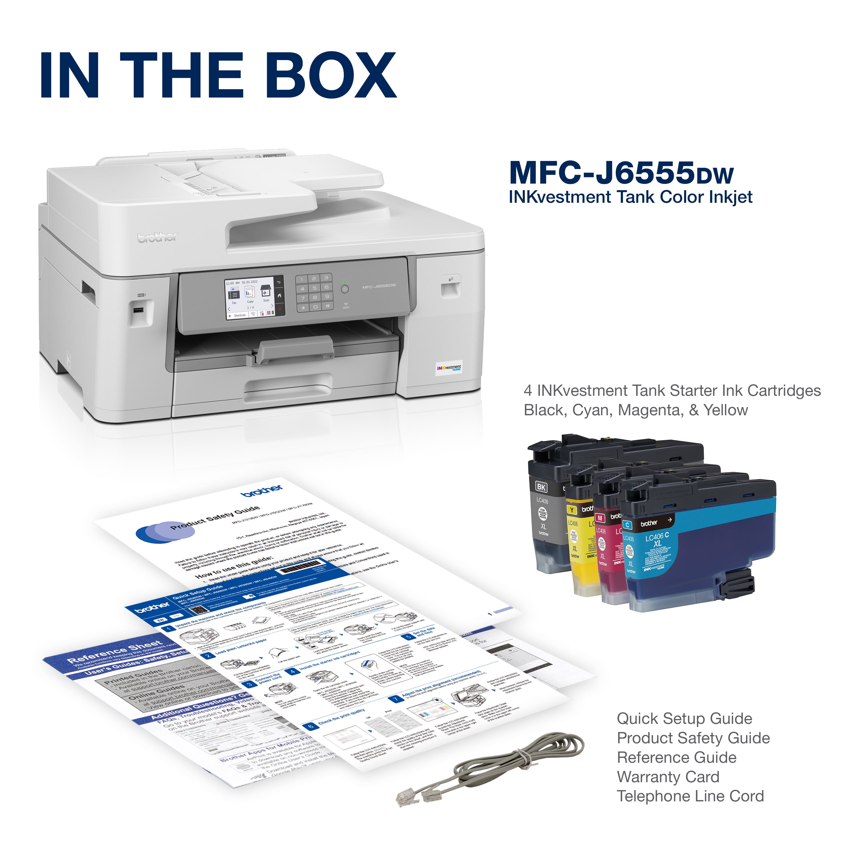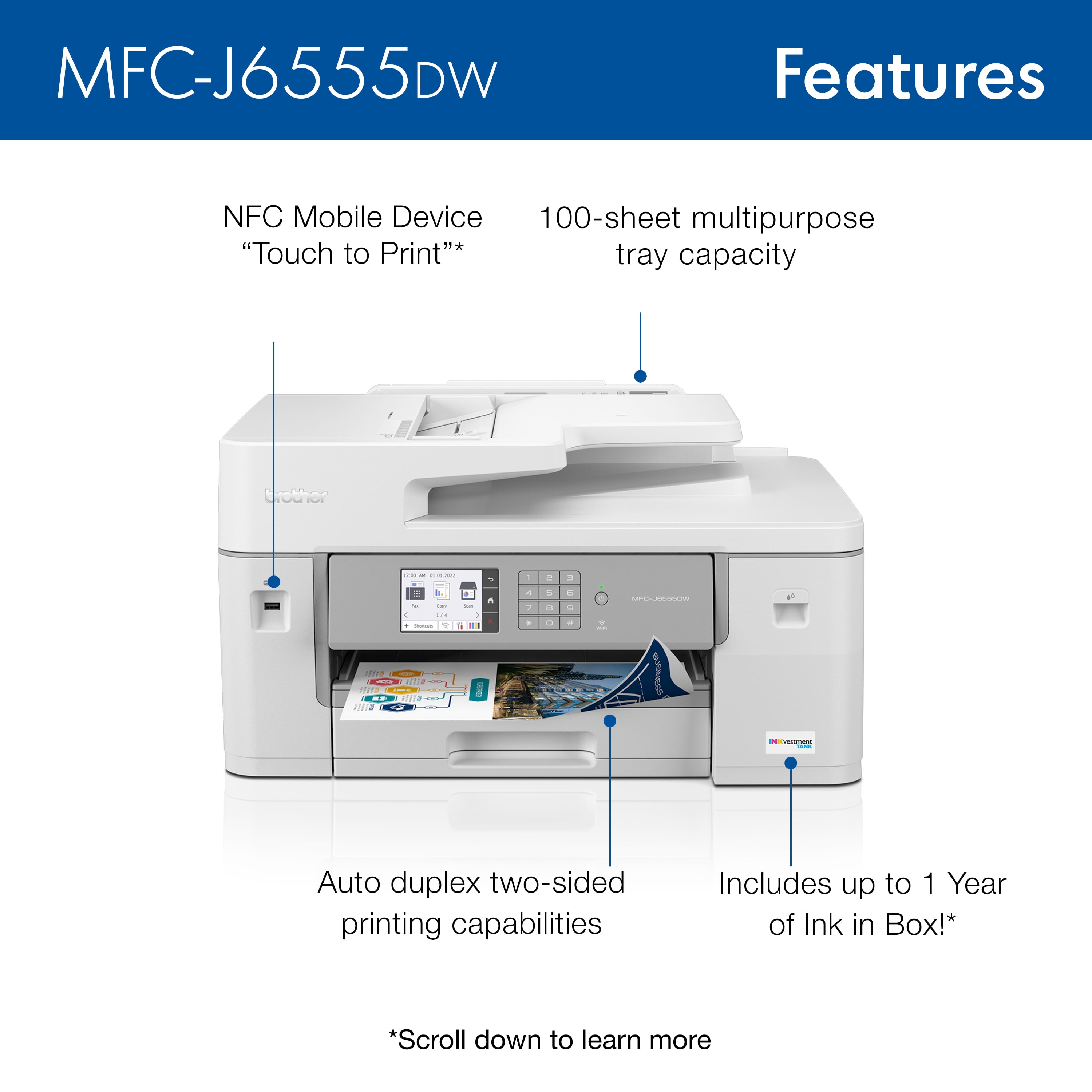 Reliable printing that lasts…with up to 1 year of ink in-box(1). Start printing and keep printing for a long, long time with up to 1 year of ink in-box(1). Brother INKvestment tanks are bottle-free – no fuss, no mess Features MAXIDRIVE Inkjet Technology. Brother’s next generation of inkjet printing technology. Completely re-engineered from chip to print-head, the MFC-J6555DW features our fastest INKvestment tank print speeds – up to 30 ppm(2) (black and color). Our redesigned print head is built for durability and uniform printing, even with long-term use. Keep your business documents secure. Helps safeguard sensitive documents while printing and allows you to securely connect to your printer and your network while printing – critical for today’s business environment. Versatile as you need – print, copy, scan, and fax up to 11”x17” (Ledger) size paper. Print, copy, scan, and fax from the 250-sheet capacity paper tray or use the 100-sheet multipurpose tray to print on envelopes, cardstock and other specialty papers. The 50-page capacity automatic document feeder(5) helps save time with multipage copy, scan, and fax. Work your way connectivity. Use built-in dual band wireless (2.4GHz / 5GHz)(3), Wi-Fi Direct®, connect via Ethernet, or even connect to a single computer through a USB cable. Works with Amazon Alexa. Print on the go. Print, scan, and manage your printer from almost anywhere when connected through a wireless network using the Brother Mobile Connect App(4). Intuitive Cloud Connection. Print-from and scan-to popular cloud apps including Dropbox, Google Drive™, Evernote, OneNote and more(6) directly from the 3.5″ color touchscreen. Save time by creating custom shortcuts right on the screen for your frequently used features. Eco-friendly features. EPEAT® Silver and ENERGY STAR® certified with eco-friendly options like Eco Mode and Ink Save Mode. Plus, automatic duplex printing helps reduce paper use. Print confidently with Brother Genuine Ink. Brother Genuine Ink is engineered to perform optimally with your Brother INKvestment printer, to ensure smooth and reliable printing with vivid colors and sharp images. So, you can print confidently every time. At Your Side support. Backed by Brother with a 2-year limited warranty, plus free online or live chat support for the life of your Brother printer. Disclaimers: (1) Based on average monthly print volumes of approximately 300 pages at 60% black pages / 40% color pages in accordance with ISO/IEC 24711 using 4 cartridges provided in-box. For more page yield information, see . (2) ISO print speed based on ISO/IEC 24734 (after first set of ISO test pages). For more details, please visit . (3) Requires an Internet connection. (4) Requires connection to a wireless network. Brother Mobile Connect free app download is not available in all countries. (5) Maximum capacity based on using 20 lb. paper. (6) Requires an Internet connection and an account with desired service.