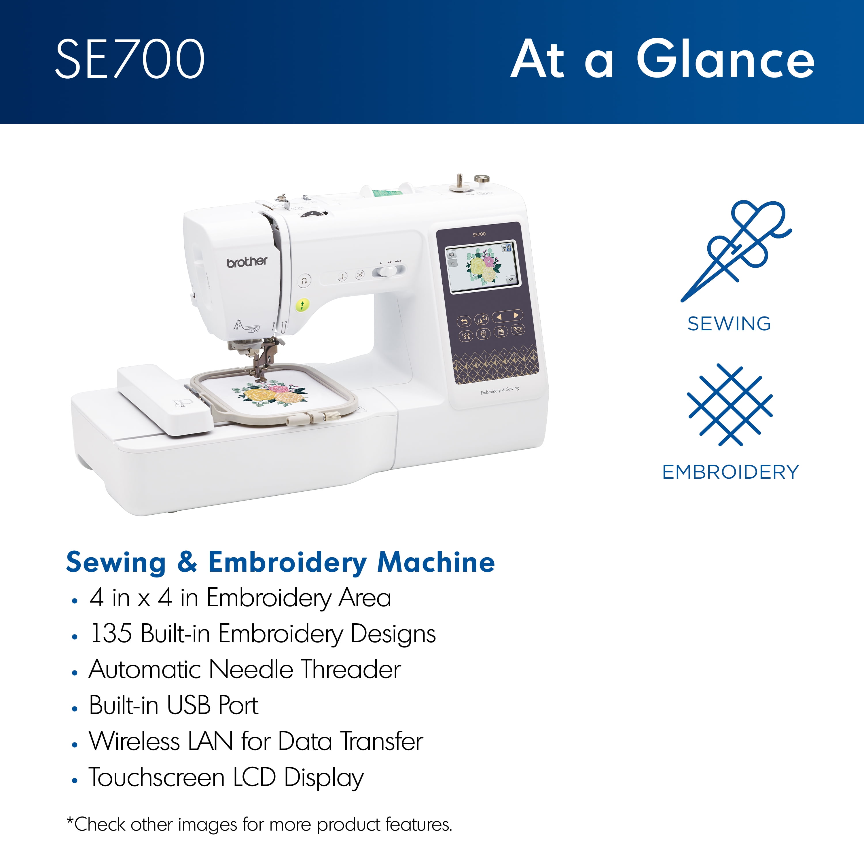 135 Built-in designs: The SE700 comes with 135 built-in designs and 10 embroidery lettering fonts for personalizing your projects Automatic needle threader and drop-in top bobbin: This sewing and embroidery combo machine includes an automatic needle threader that perfectly pushes the thread through the needle and a convenient, jam resistant drop-in top bobbin 103 Built-in sewing stitches: This machine features 103 sewing stitches including 10 styles of auto-size buttonholes. Maximum Sewing Speed (Stitches per minute)- 710 Large color touchscreen: The Brother SE700 computerized sewing and embroidery machine features a large sharp 3.7” LCD display allowing you to preview your designs before stitching 4″ X 4″ Embroidery field: This computerized combo machine is built with a 4″ x 4″ Embroidery field with an included hoop, embroidery arm, and 8 sewing feet Condition: New Beginners to advanced users.