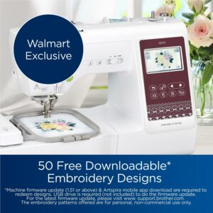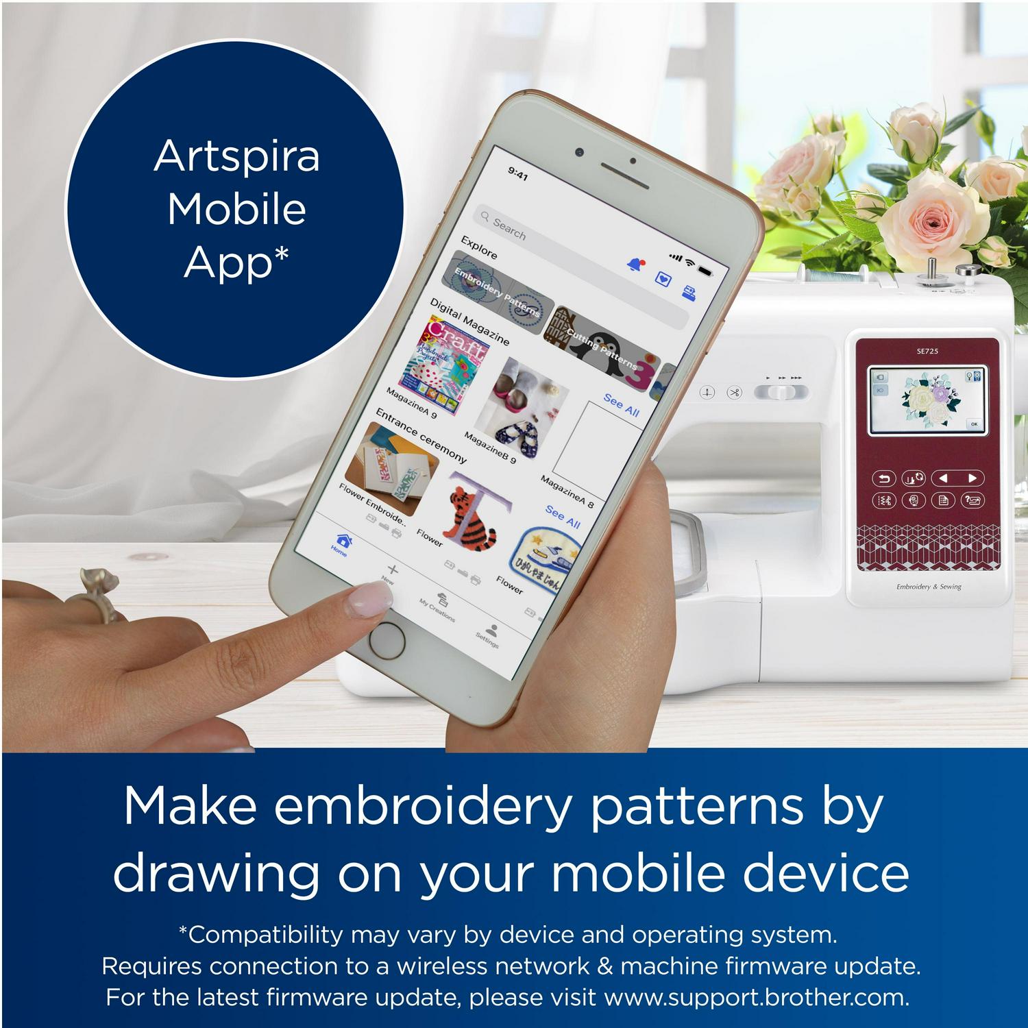 – Fifty Free Embroidery Designs: The SE725 Crowdfused Exclusive sewing and embroidery machine gives you the ability to download 50 Free embroidery designs (a Crowdfused Exclusive) for your next DIY project. Machine firmware update (1.51 or above) & Artspira mobile app download are required to redeem designs. A USB drive is required (not included) to update the firmware. For the latest firmware update, please visit www. support.brother.com. The embroidery patterns offered are for personal, non-commercial use only.