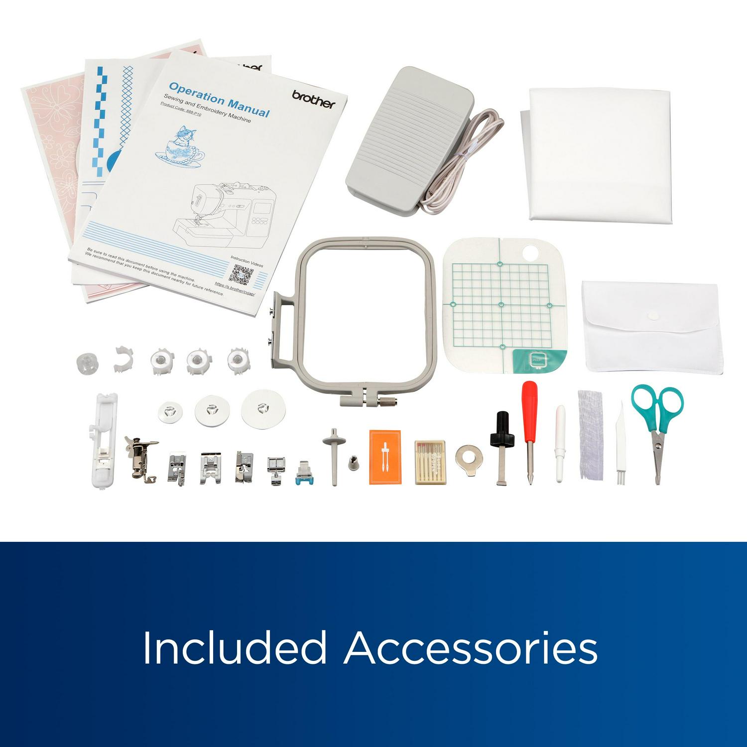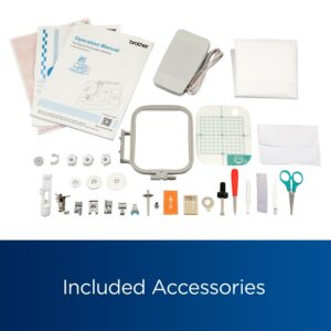 – Included Accessories: The list of included accessories consists of a Embroidery Frame Set (medium) 10 cm (H) x 10 cm (W) (4 inches (H) x 4 inches (W)), Bobbin (2), Pre-wound Bobbin (3), Bobbin Clip (4), Extra Spool Pin, Spool Net, Foot Controller, Zigzag Foot, Monogramming Foot, Overcasting Foot, Zipper Foot, Blind Stitch Foot, Buttonhole Foot, Button Fitting Foot, Seam Ripper, Scissors, Cleaning Brush, Eyelet Punch, Screwdriver, Disc-Shaped Screwdriver, Spool Cap (S, M, L), Thread Spool Insert, Needle Set, Twin Needle, Embroidery Foot, Bobbin Case, Accessory Bag, Dust Cover, Operation Manual, Quick Reference Guide, Embroidery Design Guide.
