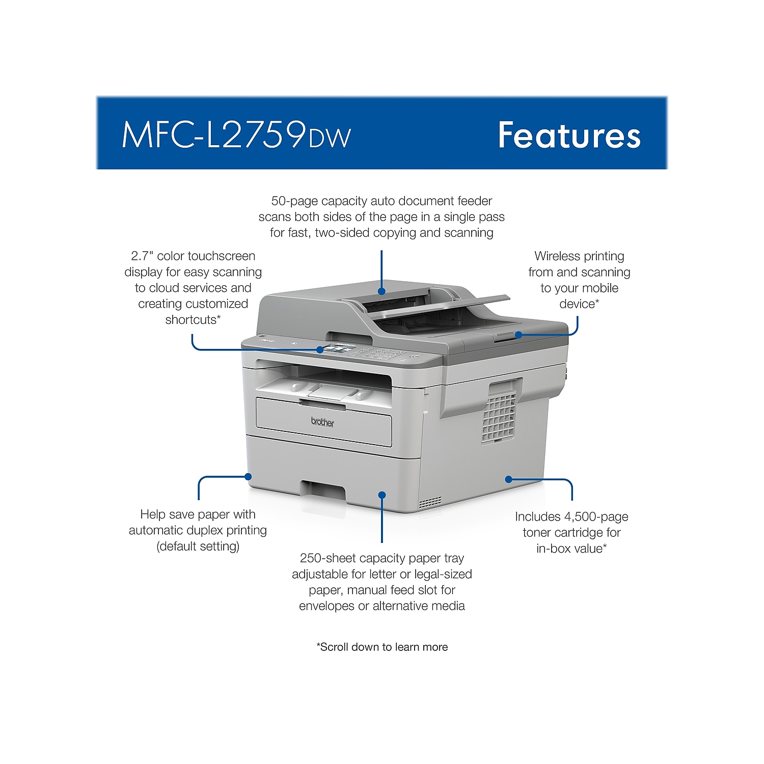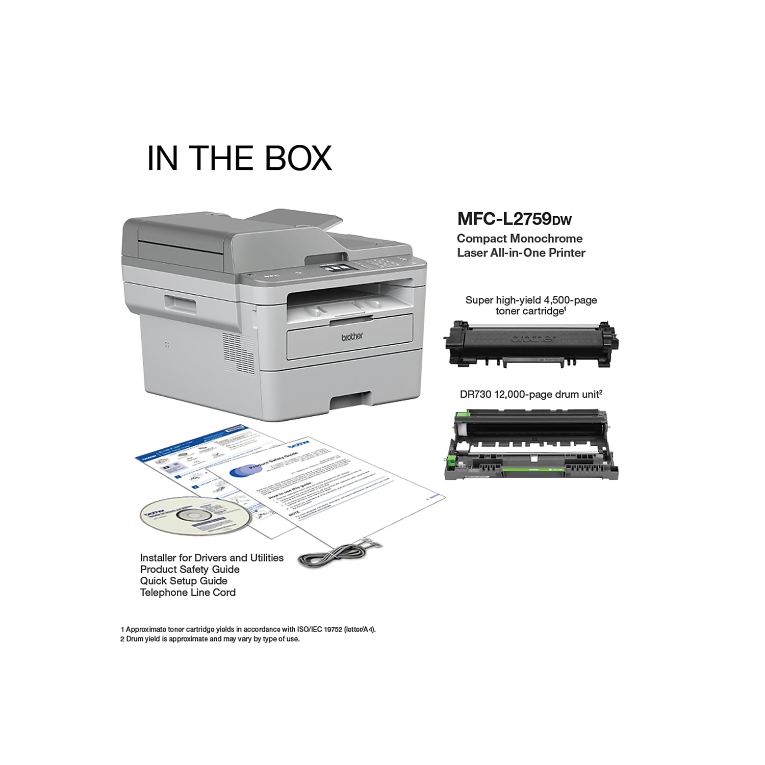 The Brother MFC‐L2759DW compact monochrome laser all-in-one printer provides the functionality you need for environments with limited space, including corporate home offices and small offices. This compact and reliable all-in-one printer helps increase productivity with fast print speeds up to 36 ppm and default automatic duplex (two-sided) printing to help save paper. Offers in-box value with the ability to print up to 4500 pages using the included Brother genuine super high-yield toner cartridge. Equipped with a 250‐sheet capacity paper tray that is adjustable for letter- or legal-size paper, so you can spend less time refilling paper trays. Helps save time with single-pass duplex (two-sided) scanning and copying via a 50‐page capacity automatic document feeder for multipage copy, scan, and fax. Print from and scan to popular cloud services directly from the 2.7″ color touch-screen display. Create custom shortcuts for your most used features to help streamline workflows and save time. The MFC‐L2759DW also features built-in wireless and Ethernet network interfaces to easily set up and share on your wireless or wired network. Wirelessly print from your desktop, laptop, smartphone, or tablet: perfect for today’s remote workforce. • Designed for how work now works, this compact all-in-one printer is perfect for today’s corporate home offices and small offices. • Offers resolutions up to 2400 x 600 dpi for excellent readability. • High-quality output with print speeds up to 36 ppm helps boost productivity and ensures fast professional-quality documents. • 1 x USB 2.0, 1 x LAN, NFC, and Wi-Fi connectivity helps enhance productivity. • Dimensions: 12.5″H x 16.1″W x 15.7″D. • Types of media supported include plain paper, letterheads, recycled paper, bond paper, labels, and envelopes. • 600MHz processor and 256MB of memory ensure speed and accuracy. • Offers in-box value with the ability to print up to 4500 pages using the included Brother genuine super high-y…