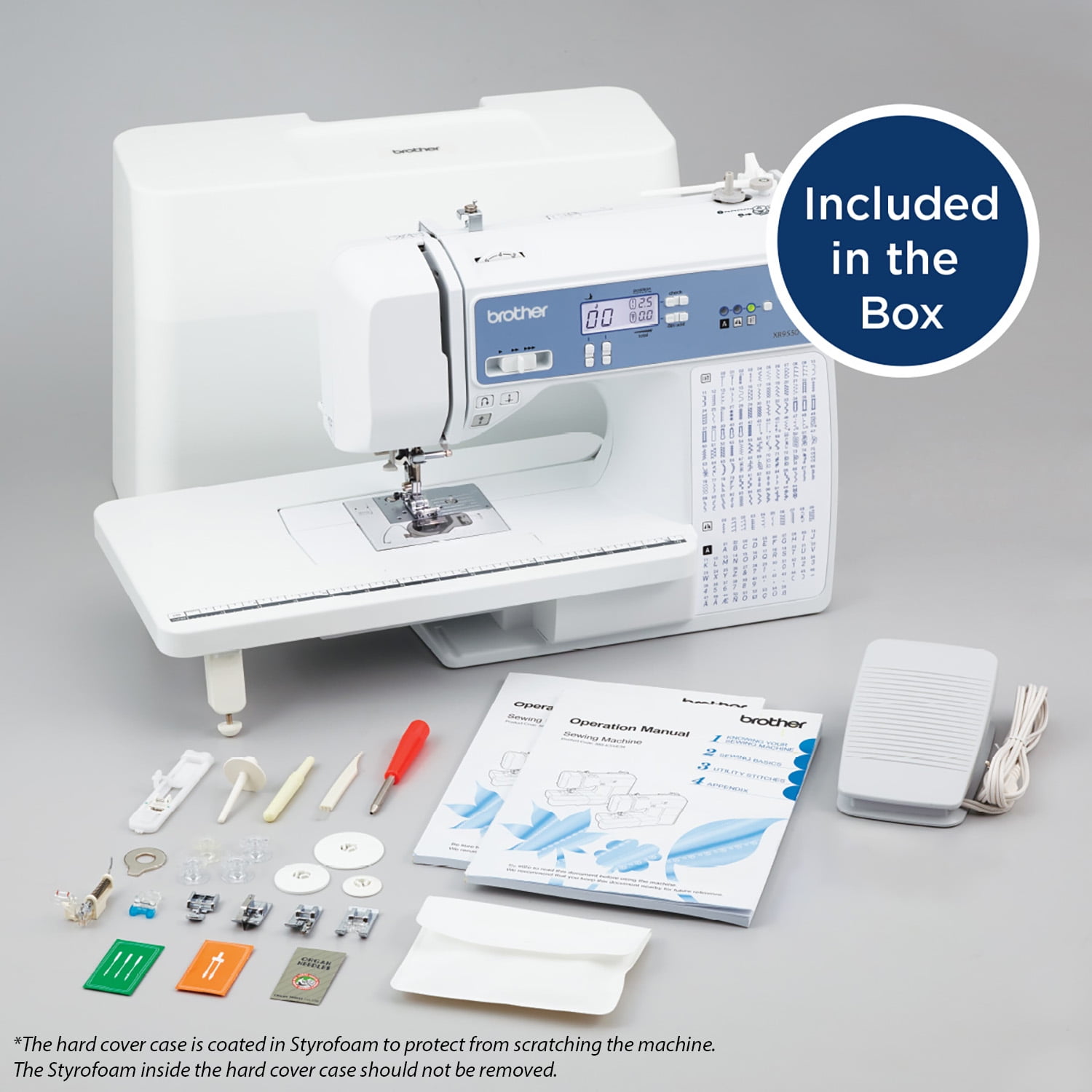 LCD Screen: An intuitive LCD screen lets you easily select stitches and adjust settings with a single button press. Automatic Needle Threader & Drop-In Bobbin: The Brother F.A.S.T. needle threading system handles threading for you, paired with a convenient, jam-resistant drop-in top bobbin. Included Accessories: Protective hard cover*, wide table, and 8 sewing feet. 165 Unique Built-In Stitches: Features 110 utility, decorative, and heirloom stitches, including 8 styles of auto-size buttonholes, plus 55 alphanumeric stitches. At Your Side Support: Includes Brother At Your Side support with free technical assistance via online, live chat, or phone for the life of your machine. Suggested User: Beginner to advanced users. Condition: New Machine Type: Computerized quilting and sewing machine Disclaimer: The hard cover case is coated in Styrofoam to protect the machine from scratching. The Styrofoam inside the hard cover case should not be removed.