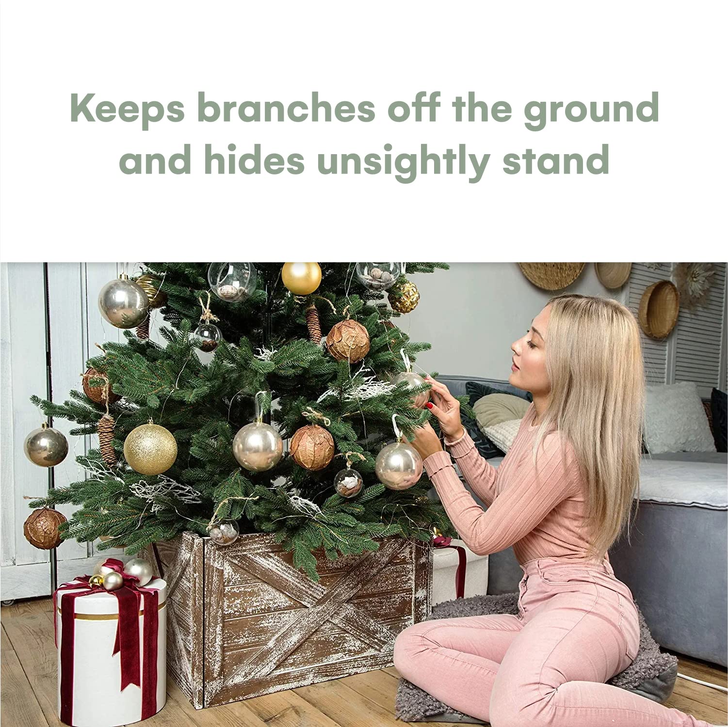 Add a touch of farmhouse design to your Christmas tree with this rustic-finished wood tree ring. This Christmas tree base cover will bring a touch of vintage and modern accents into your home. ADJUSTABLE DIMENSIONS: Fully assembled, the tree skirt panel base is 23.5 inches by 23 inches with an interior diagonal length of 31 inches perfect for large trees up to 12ft in height. The decorative tree skirt stands 14 inches in height. BENEFITS: Hides unsightly or ugly Christmas tree stands by hugging the bottom of your tree. Perfect for Pets – Keeps your dog, cat, or other animals away from your Christmas tree base. Stops pets from drinking water from the base or chewing on the tree. Prevents fur, hair, feathers, and dander from getting onto the tree. PACKAGING: The wood tree collar arrives in a neat cardboard box.