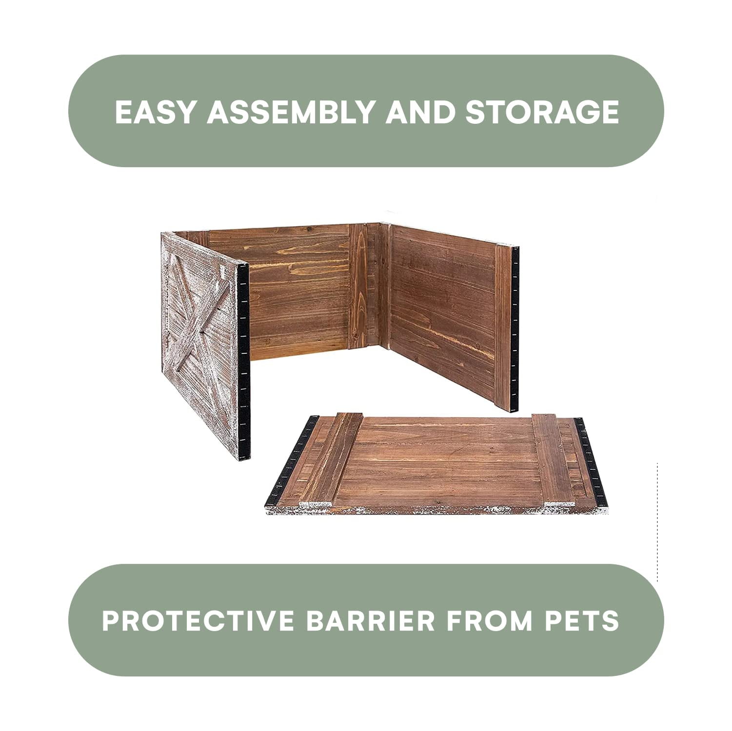 FARMHOUSE RUSTIC DESIGN: Brown Wood Finish in clear coating PERFECT SIZE: Sides of 23.5 inches x 23 inches. Height of 14 inches EASY ASSEMBLY AND COMPACT STORAGE: quick velcro assembly and 4 stackable panels for compact storage GREAT FOR PETS: Keeps your dog or cat away from the Christmas tree base or water in a tree stand ENVIRONMENTALLY FRIENDLY & Sustainably Sourced Real Wood