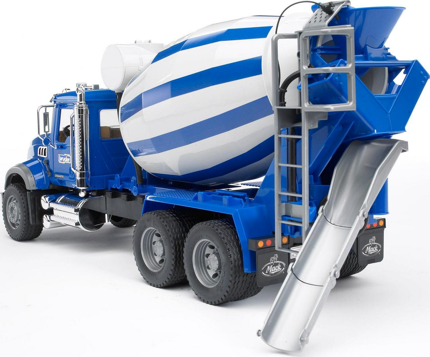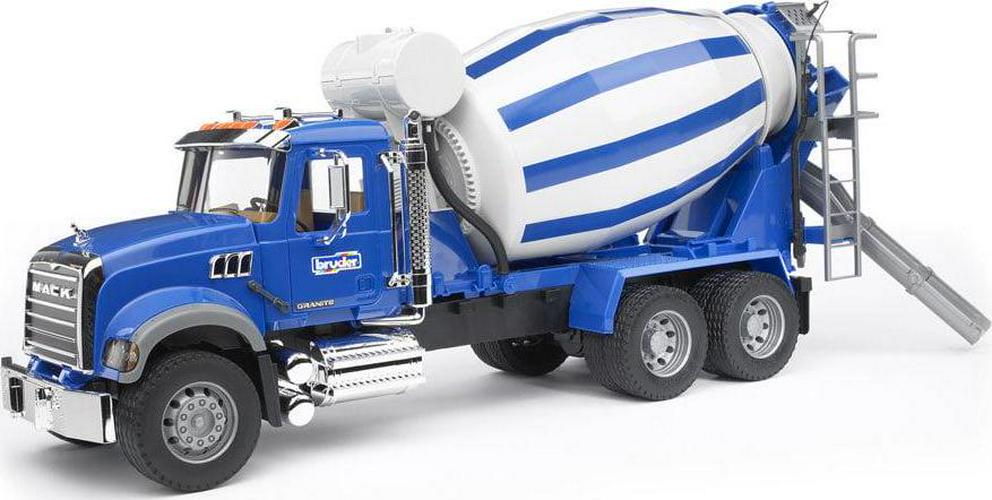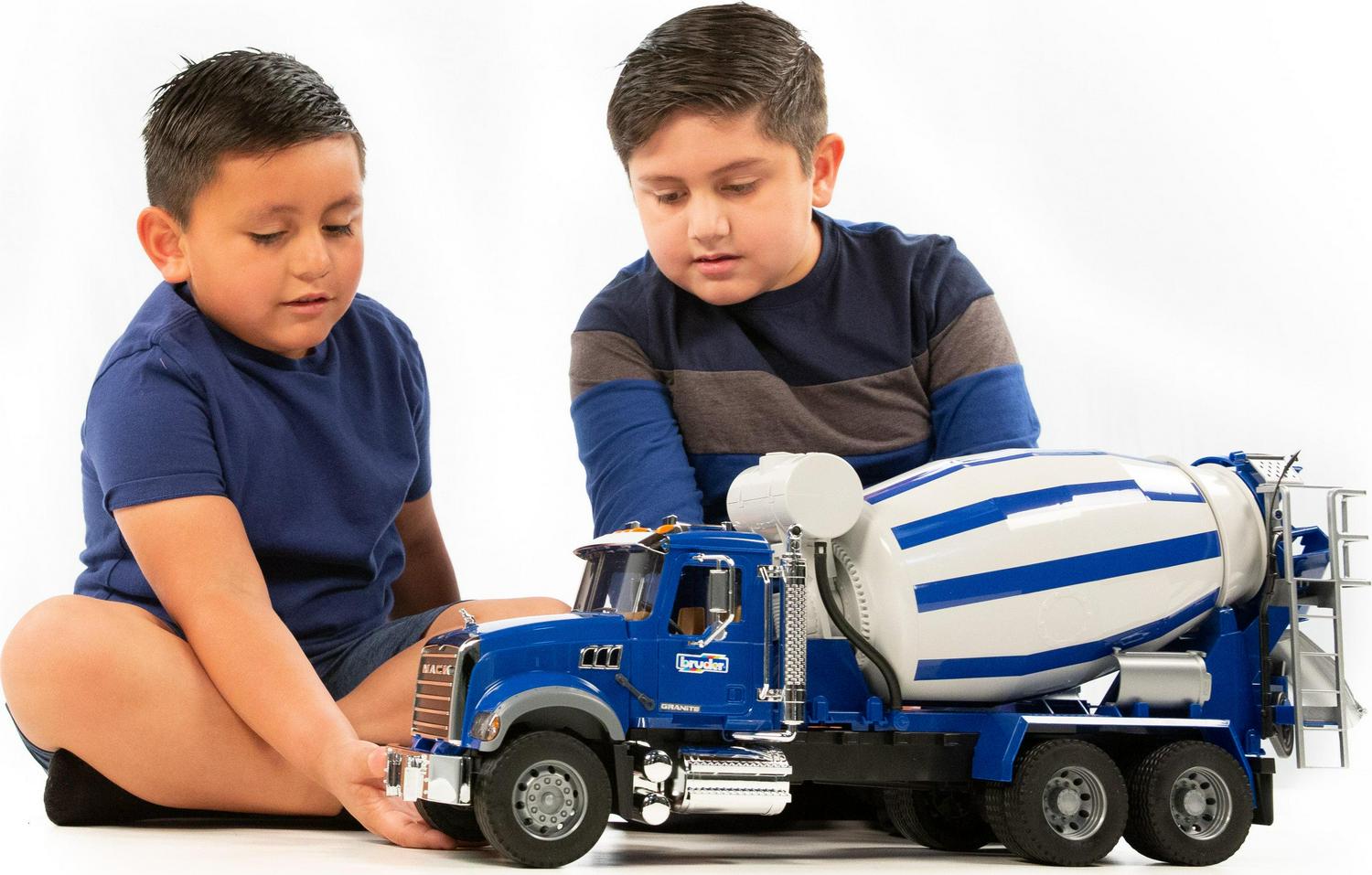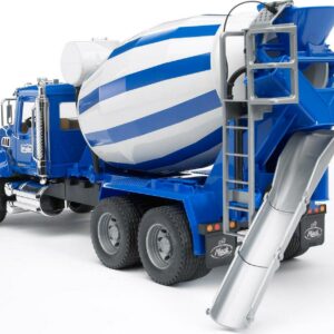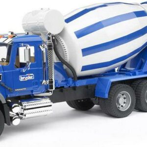 The MACK Granite Trucks are a feast for the eyes of every truck fan. The “incredibly” realistic driver’s cabin features doors that can be opened, folding side-view mirrors, a tilting engine hood that provides a full view of the engine block, and the many add-on accessories which give these trucks their chrome look. The mixing barrel is operated by a fold-out crank handle (hidden in the water tank). It is also equipped with 2 slip-on chute extensions that attach to the sides of the truck and can be slipped over the rear concrete chute.