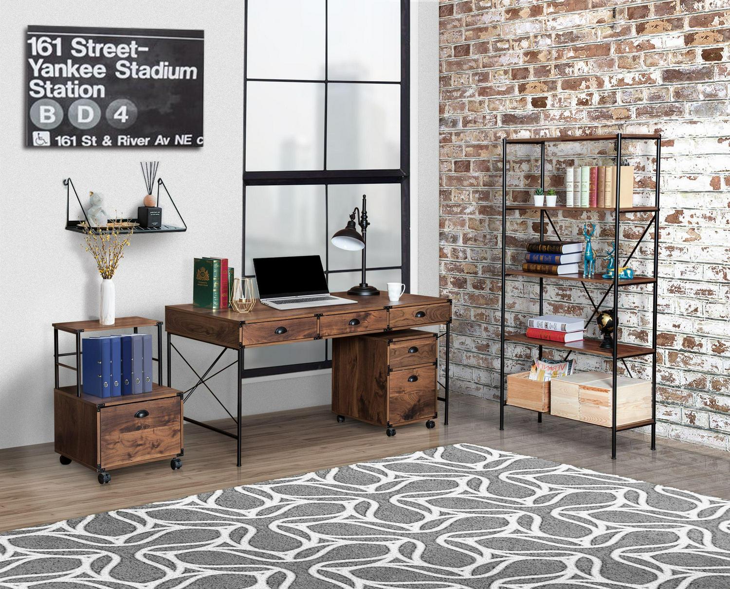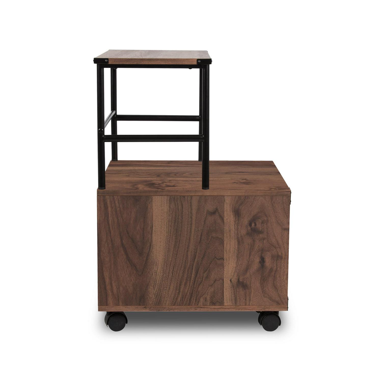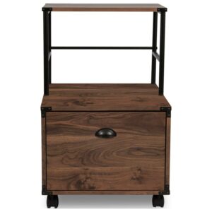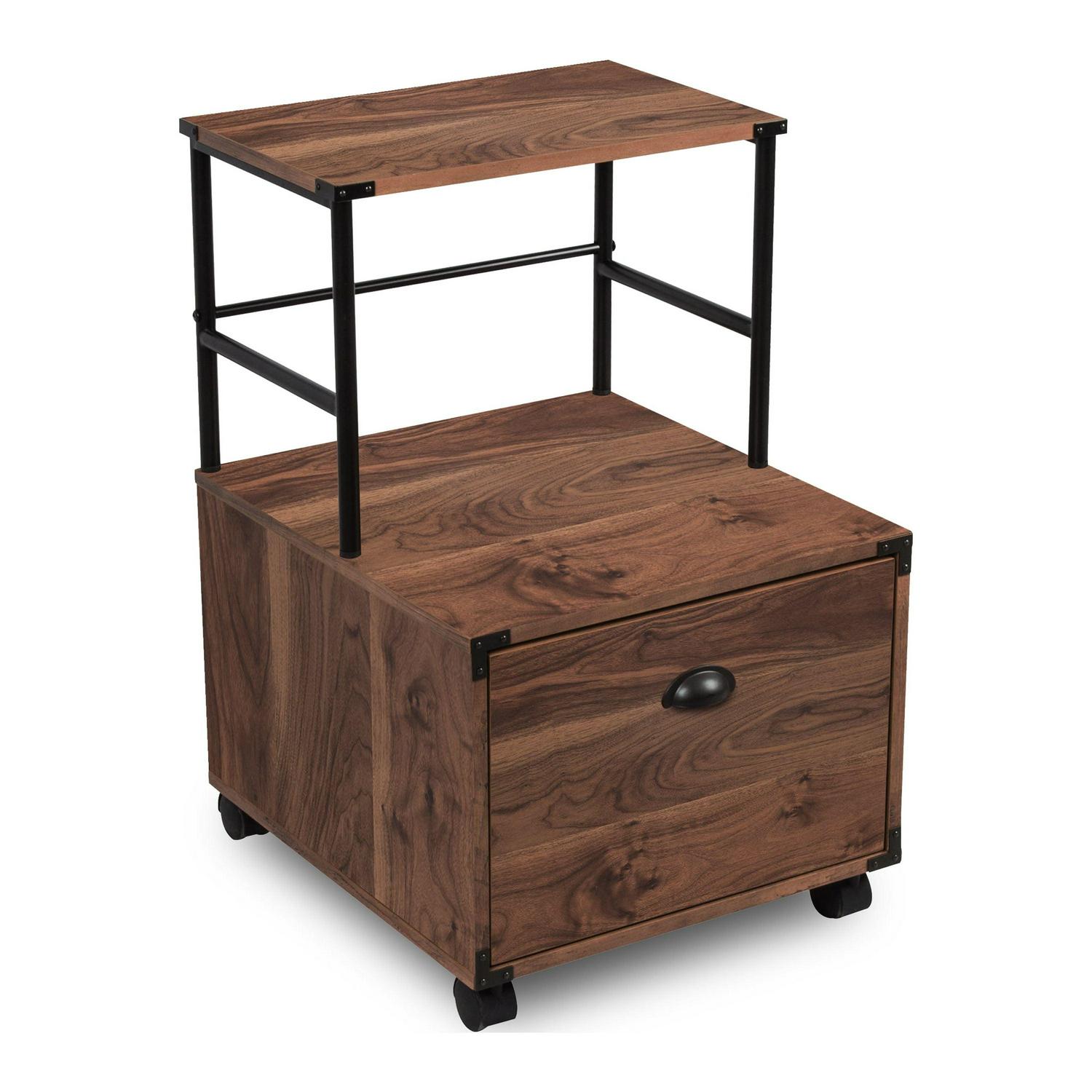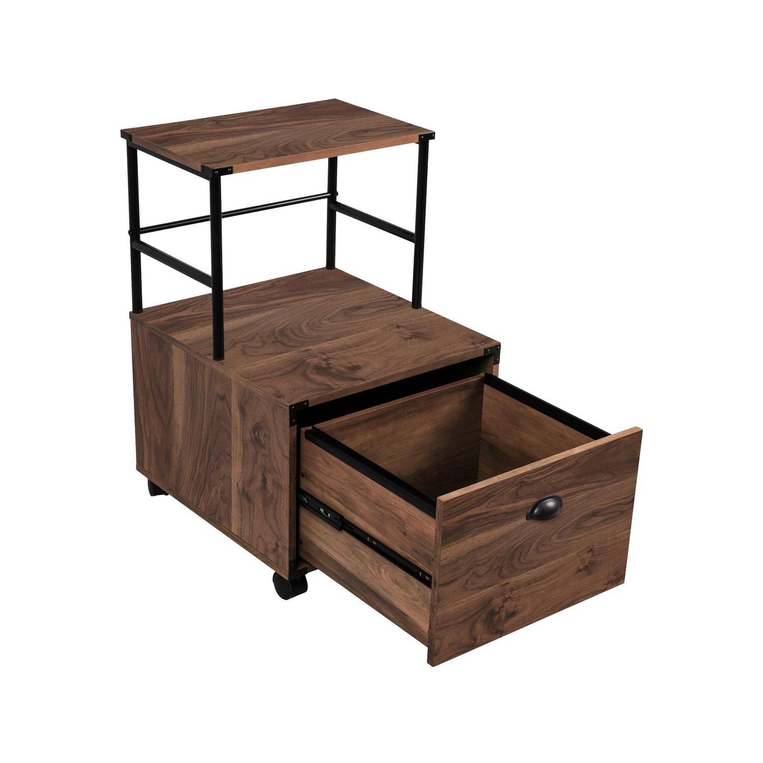Perfecting an industrial vibe and an industrious design, this mobile file cabinet and shelf will expand your home office’s organization and look good while doing so. One file drawer and one open shelf provide copious storage. The full extention drawer within the cabinet has dimensions compatible with A4 storage, and a maximum weight capacity of 10 lbs., and included file bars also aid in setting up the perfect office. Finished in warm walnut, the cabinet has black steel pull handles for added rustic-industrial appeal, and built-in wheels provide instant mobility and ease of use.