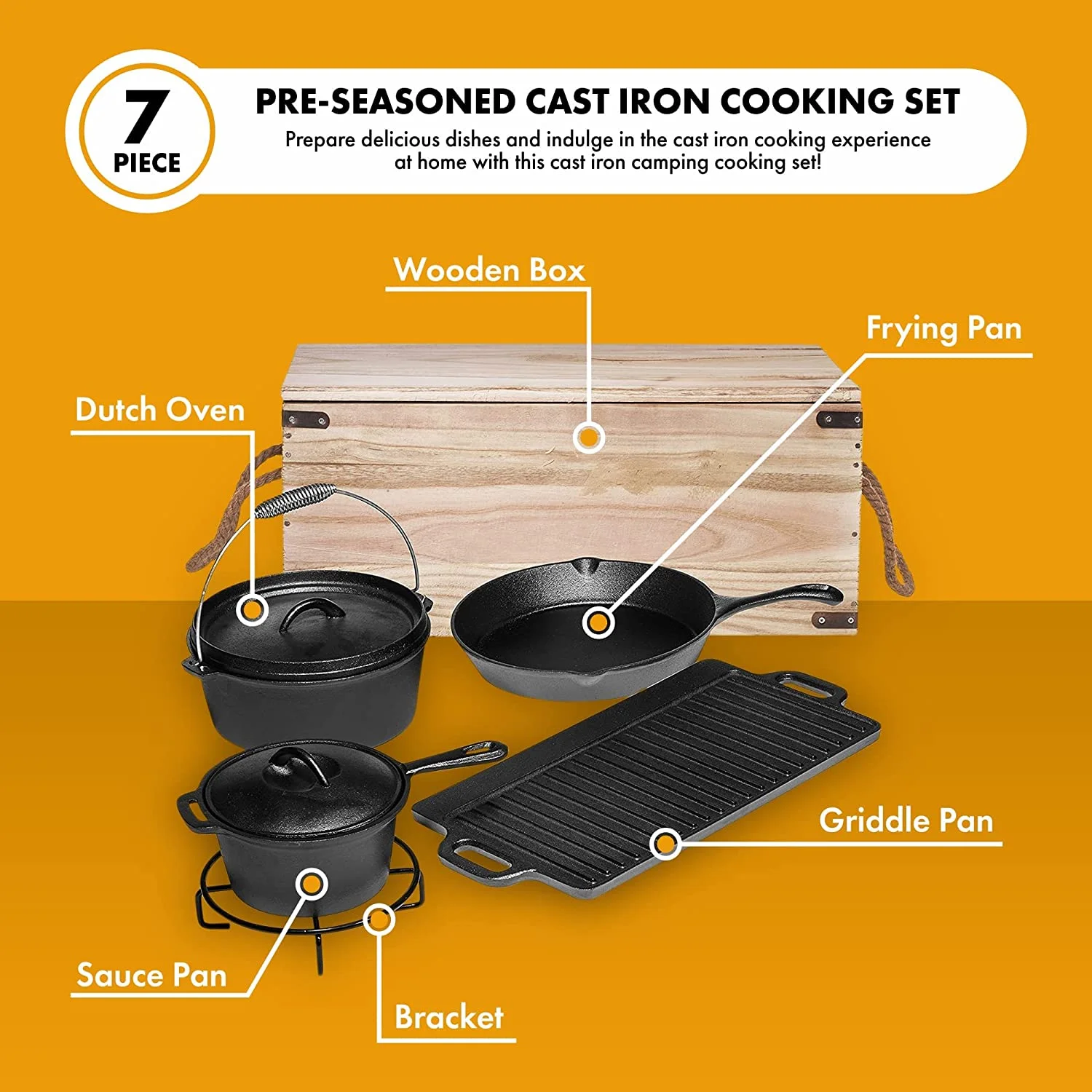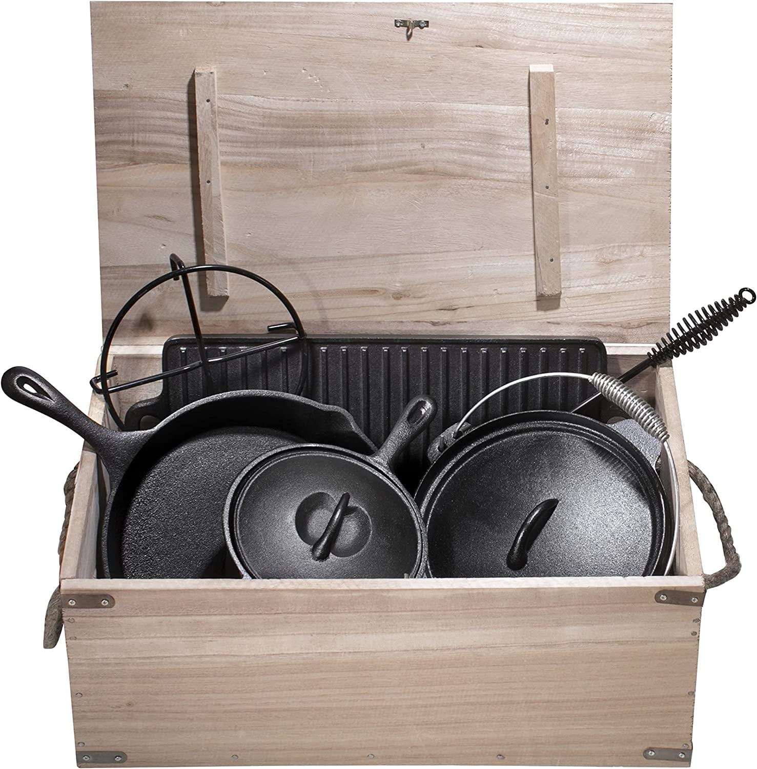 PreSeasoned 12″ Cast Iron Skillet, 4.5qt Dutch Oven Pot, 2.5qt Saucepot, 20″ x 9″ Heavyduty Reversible Cast Iron Griddle. Also includes 8.6″ Trivet & Dutch Oven Lid Lifter For cooking on an open fire or with burning ash Large pot with lid and recess for the circulation of the burning ash Convenient wooden box for easy transport Preseasoned and nonstick surfaces help to ensure that cleaning is quick and painless