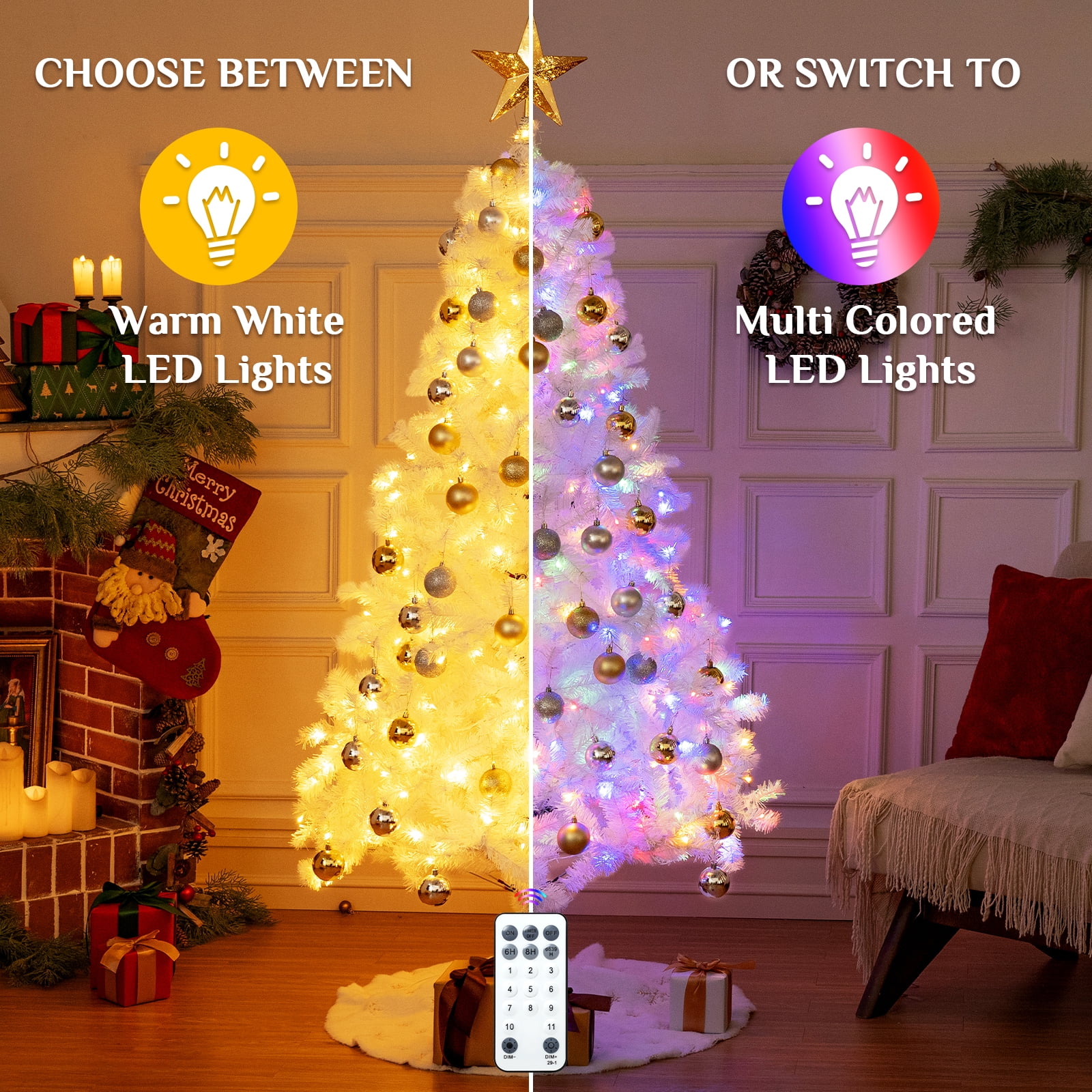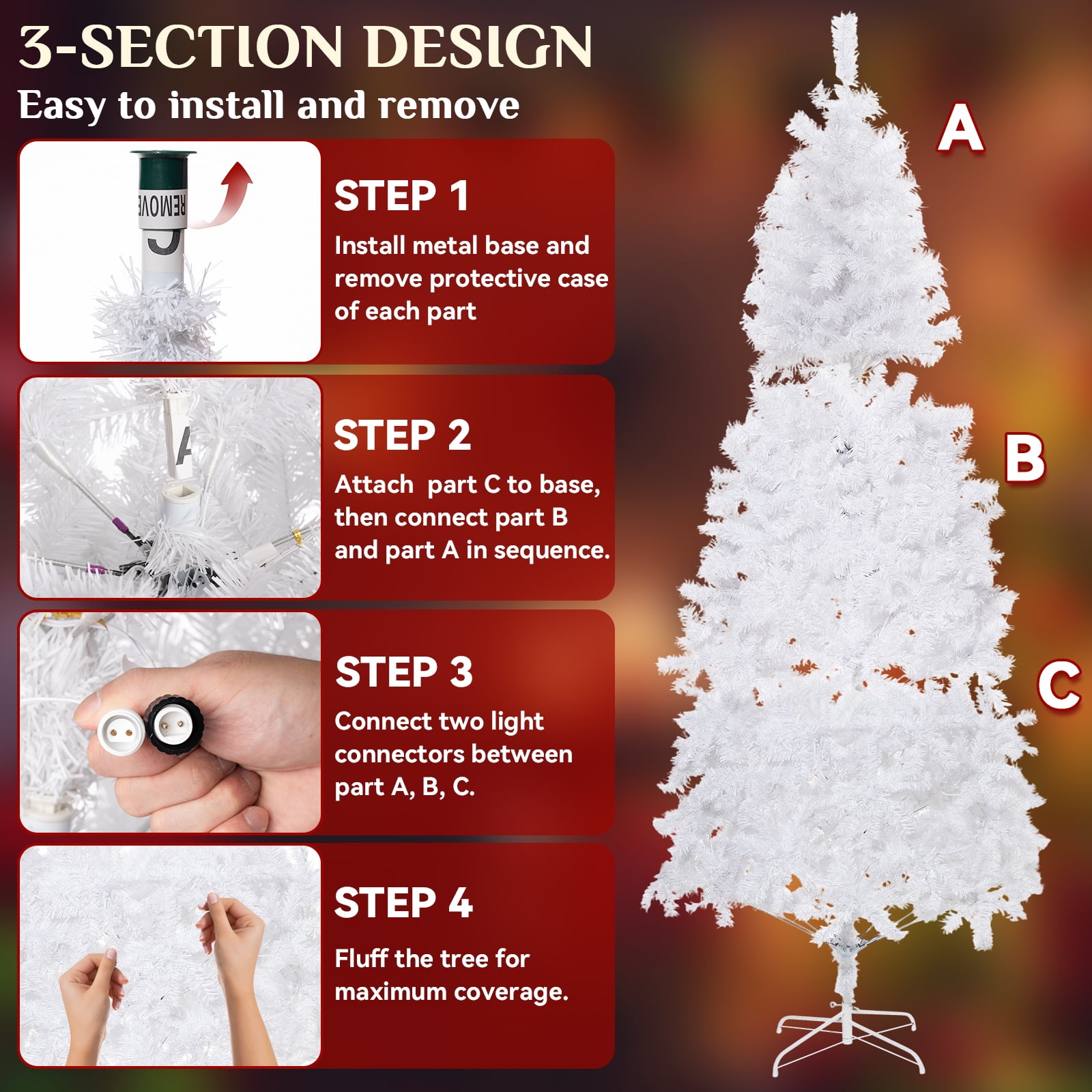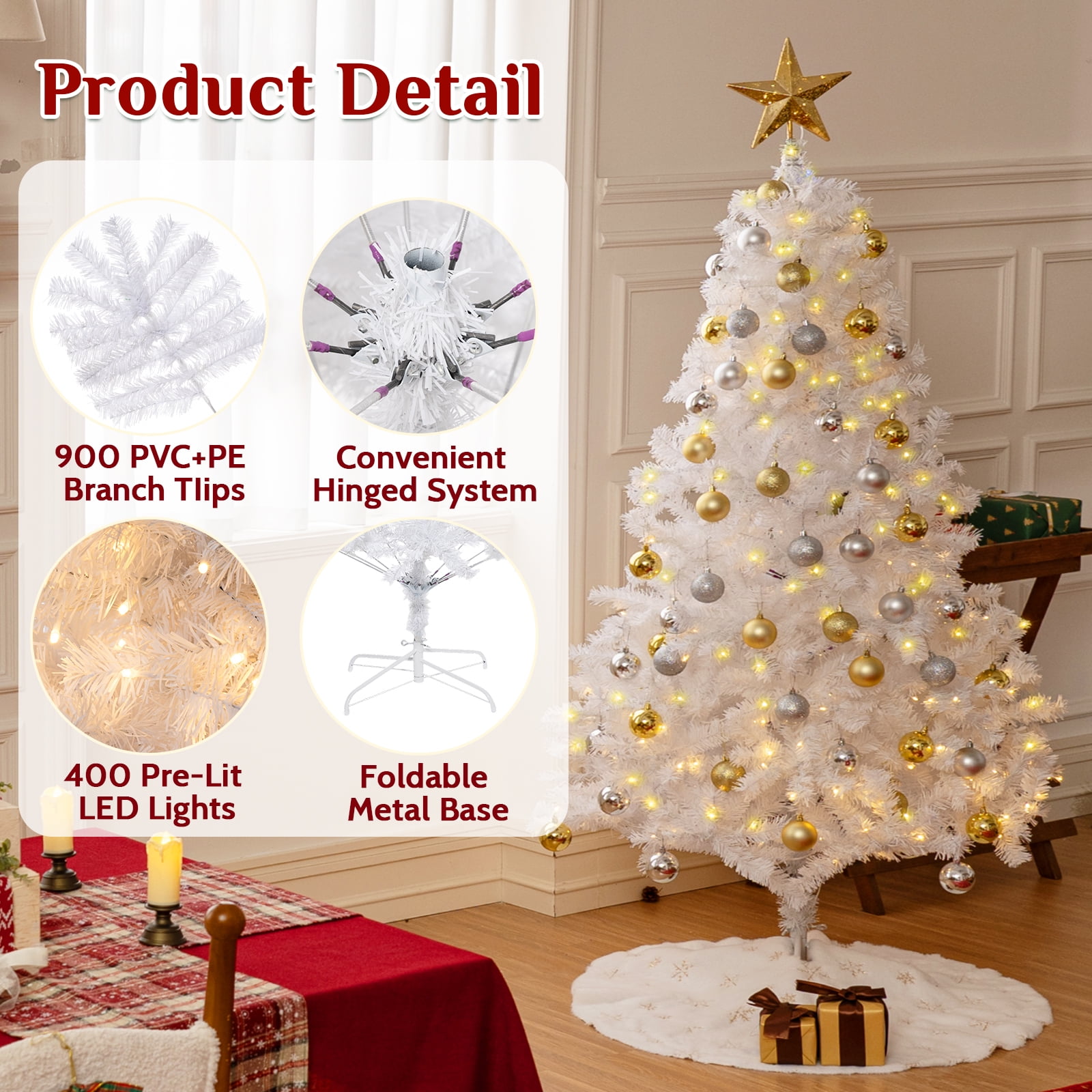 🌟 Key Features: 🌟 Radiant Illumination: Pre-strung with 600 led lights to bring a festive glow to your home.Two lighting modes, both warm light and colored light.Instant one-click connection makes assembly a snap. No wires, no hassle – one plug for the entire tree. Lush Branches: With a remarkable count of 16000 branches, our tree boasts a lush and full appearance that captures the look of a natural fir tree. The branches are meticulously designed to hold your ornaments and decorations in style. Hinged Design: Set up your pre-lit christmas tree effortlessly with the innovative hinged design. Each branch is attached to the central pole through hinges, allowing you to unfold and shape them with ease, saving you time and effort. PVC Leaves: Crafted of premium materials that are flame-retardant and non-allergenic.. This material not only ensures a lifelike appearance but also promises durability and easy maintenance, so you can enjoy its beauty for years to come. Height:7.5ft Diameter:4.3ft Number of branch tips: 1600 Number of prestrung with warm white led bulbs: 600 Material:flame-retardant and non-allergenic pvc 🎁What’s Included: 🎁 1 x BSHAPPLUS 7.5ft pre-lit white christmas tree 1 x Hinge base 🎅 “Oh, Christmas tree, Oh, Christmas tree, how radiant are thy branches!”