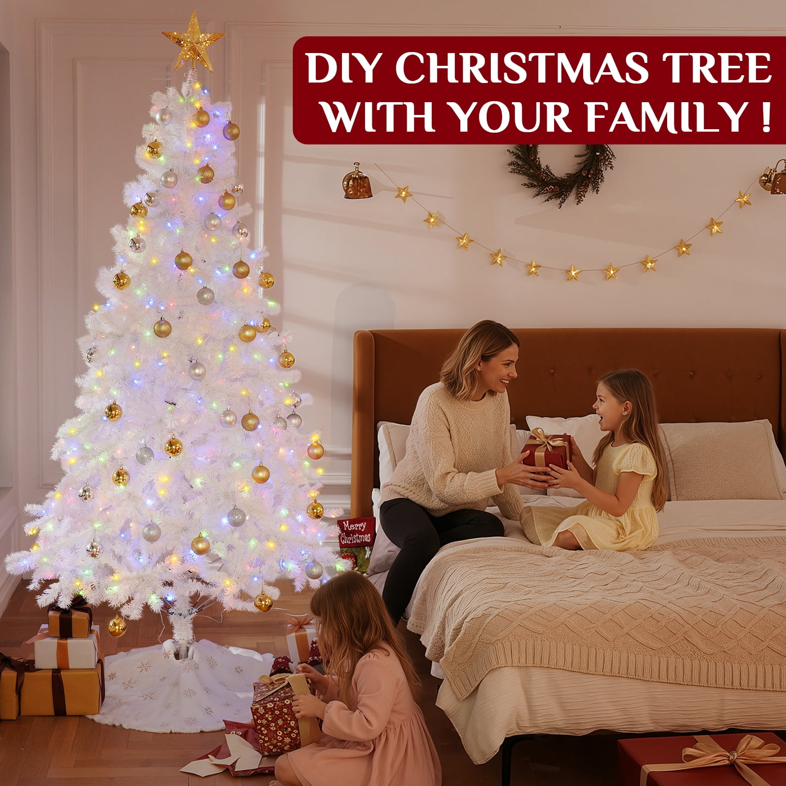 🎄Welcome to BSHAPPLUS Festive Delights! 🎄 7.5ft Pre-Lit White christmas tree is an artificial christmas tree from BSHAPPLUS featuring lifelike foliage painted multiple hues of white so no two are exactly alike. BSHAPPLUS produces the most realistic christmas trees in the market, offering all the long-term benefits that come with owning an artificial tree. Imagine never having to shop, chop and pay for another natural tree again. The artificial Christmas tree’s all-metal hinged branch construction simply unfolds out of storage, ready to bring seasonal enchantment to your space. The tree needles are constructed out of non-allergenic and flame-retardant materials,leave your old tangled string lights behind this year,simply unfold out of storage, fluff and decorate! The model comes pre-strung with 600 LED bulbs that emit both warm and colored light, evenly distributed and fixed to the frame.
