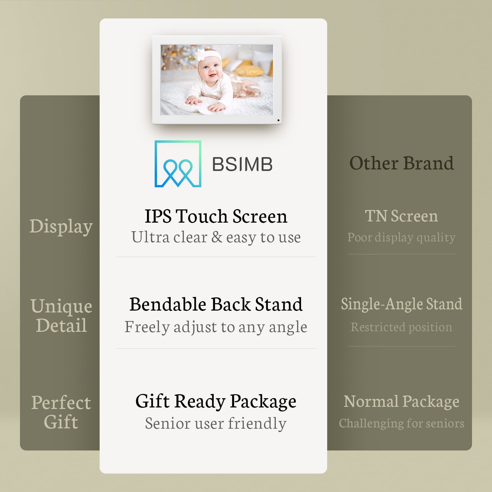 As a brand integrated with technology and innovation, BSIMB is committed to delivering digital solution to get memories come to life. Featured with premium quality display and private set-up, BSIMB presents a simple and better way to get people connected with love and happiness, no matter where they may be BSIMB intelligent Cloud digital photo frame with 10.1 inch display, IPS LCD panel, resolution of HD 1280*800 pixels, 16:10 ratio, viewing angle of 178 °. The digital frame can be freestanding or wall mounted in both landscape and portrait with auto-rotation.
