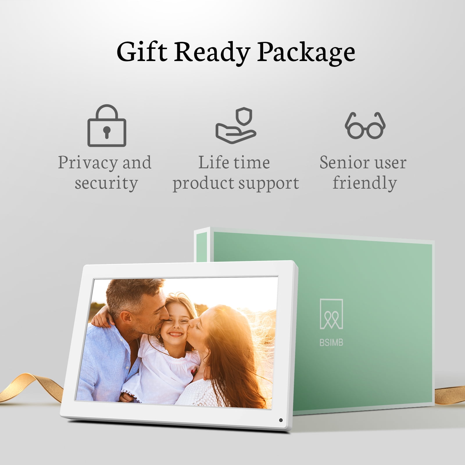 INSTANT WIRELESS SHARING – Instantly share moments by sending pictures and videos from your phone via VPhoto app or email with the BSIMB smart WiFi frame (NOTE: Only works with 2.4GHz WiFi; not compatible with 5GHz & hidden networks). Enjoying the picture slideshow by using the customized settings, such as transition effect, background music, slideshow interval captions and more! AMAZING VIEWING DISPLAY: Intelligent Cloud digital photo frame with 10.1 inch display, IPS LCD panel, resolution of HD 1280*800 pixels, 16:10 ratio, viewing angle of 178 °. The digital frame can be freestanding or wall mounted in both landscape and portrait with auto-rotation. EASY SETUP AND US SERVER – Set up in minutes with your fingers via the touchscreen. BSIMB electronic photo frames use the encrypted AWS server with free unlimited cloud storage, share pictures securely. ALL-IN-ONE FRAME FOR GIFTING–Designed with multi-functionalities (music/weather/alarm/calendar…), BSIMB WiFi digital frame is built-in sleep mode and motion sensor to save energy. It can be freestanding or wall-mounted in both landscape and portrait with auto-rotation. Perfect gift for family and grandparents on big days, such as birthday, Christmas, Thanksgiving, Mother’s Day and so on. SATISFACTION GUARANTEED – As a professional digital frame brand since 2010, BSIMB presents various digital frames from small to large with HD/FHD/2K IPS display. We offer 30-day money-back guarantee and 1-year worry-free warranty. Our customer service team is always here for you to make sure you are happy with your frames.