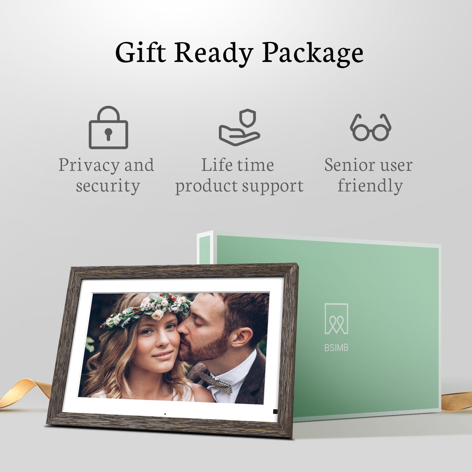 Versatile Gift: The multi-functional BSIMB WiFi digital frame features music, weather, alarm, and calendar options. With built-in sleep mode and motion sensor, it conserves energy. Whether freestanding or wall-mounted, it supports both landscape and portrait modes with auto-rotation. Perfect gift for family and grandparents on special occasions like birthdays, Christmas, Thanksgiving, Mother’s Day and so on. Its extra-large size also serves as an advertising board for product marketing. Impressive FHD Touch Screen and Remote Control: The BSIMB digital picture frame boasts a stunning FHD 1920 x 1080 IPS resolution with a 16:9 aspect ratio, delivering high-quality image display and a broad viewing angle. It can be conveniently managed using the included remote control, offering flexibility in customizing settings and managing pictures. This user-friendly design is especially beneficial for elderly users, ensuring ease of use for everyone. Secure and Private Photo Sharing: BSIMB digital frames utilize an encrypted AWS server with free unlimited cloud storage, ensuring the security and privacy of your photo stream. With built-in 64GB storage, you can store over 80,000 pictures. Additionally, it supports memory cards and USB drives (up to 64GB) for expanded storage when necessary. Instant Wireless Sharing: Effortlessly share moments by sending pictures and videos from your phone using the VPhoto app or email with the BSIMB smart WiFi frame. Please note that it operates exclusively with 2.4GHz WiFi and is not compatible with 5GHz or hidden networks. Delight in customized picture slideshows with tailored settings including transition effects, background music, slideshow intervals, captions, and more! Satisfaction Guaranteed: With a legacy as a professional digital frame brand since 2010, BSIMB offers a range of digital frames from small to large with HD/FHD/2K IPS displays. We provide a 30-day money-back guarantee and a 1-year worry-free warranty. Our dedicated customer service team is committed to ensuring your happiness with your frames.