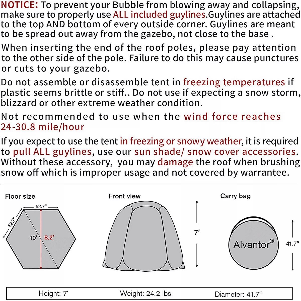 Enjoy the outdoors by using Alvantor 10′ x10′ Pop Up Winter Bubble Tent Hot House. It’s pop up style and easy to set up, so do-it-yourselfers can put it to use quickly. You can enjoy sunshine and beautiful scenery and feel warm all the time outdoors in winter with the super transparent PVC fabric. It has two zippered doors for simple entry and exit as well. It is the best choice for picnic, Hot Tub, Jacuzzi, barbecue, afternoon tea, and party on the backyard, garden and park in winter! This pop up screen gazebo has plenty of space, light-weight and fold compact for easy transport. 1 Year 100% SATISFACTION GUARANTEE: Alvantor is a U.S. based company which is located in Los Angeles, CA. Trademark is registered, if you have any question about Alvantor Tent, please contact us 626-542-3420.
