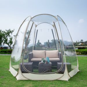 – PACKED FULL OF ADDITIONAL FEATURES: Two windows on the top provide ventilation to let your pop up bubble breath, along with waterproof covers to protect against the rain or snow. This patio tent features internal hooks to hang coats or bags, and additional support features to increase stability during windy weather. This weather proof pod has two large entrance doors with double side silicone zippers, allow easy access from inside and out.