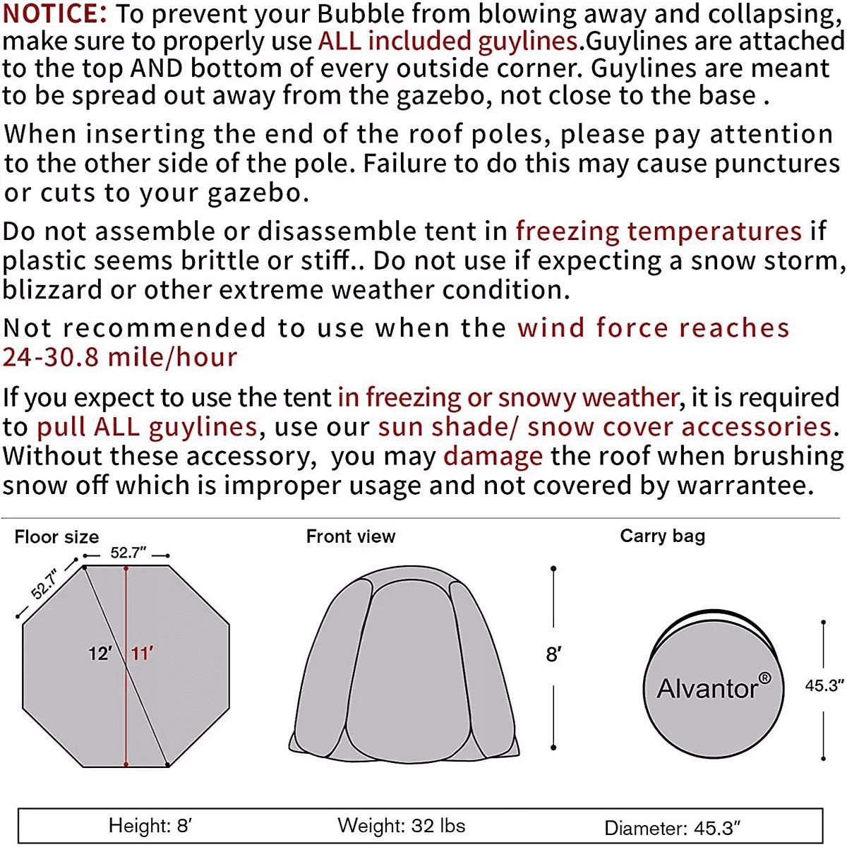 Enjoy the outdoors by using Alvantor 12′ x12′ Pop Up Winter Bubble Tent Hot House. It’s pop up style and easy to set up, so do-it-yourselfers can put it to use quickly. You can enjoy sunshine and beautiful scenery and feel warm all the time outdoors in winter with the super transparent PVC fabric. It has two zippered doors for simple entry and exit as well. It is the best choice for picnic, Hot Tub, Jacuzzi, barbecue, afternoon tea, and party on the backyard, garden and park in winter! This pop up screen gazebo has plenty of space, light-weight and fold compact for easy transport.