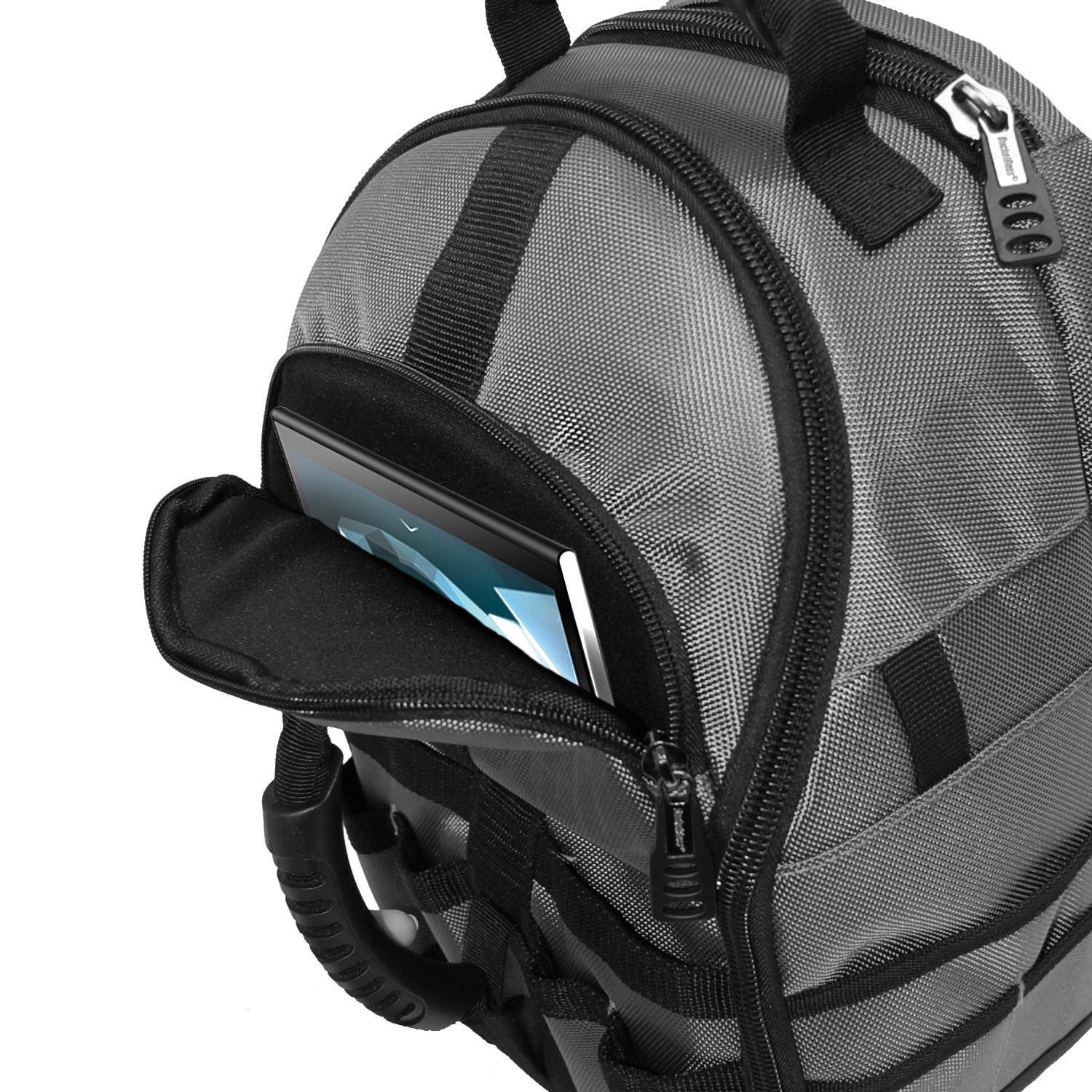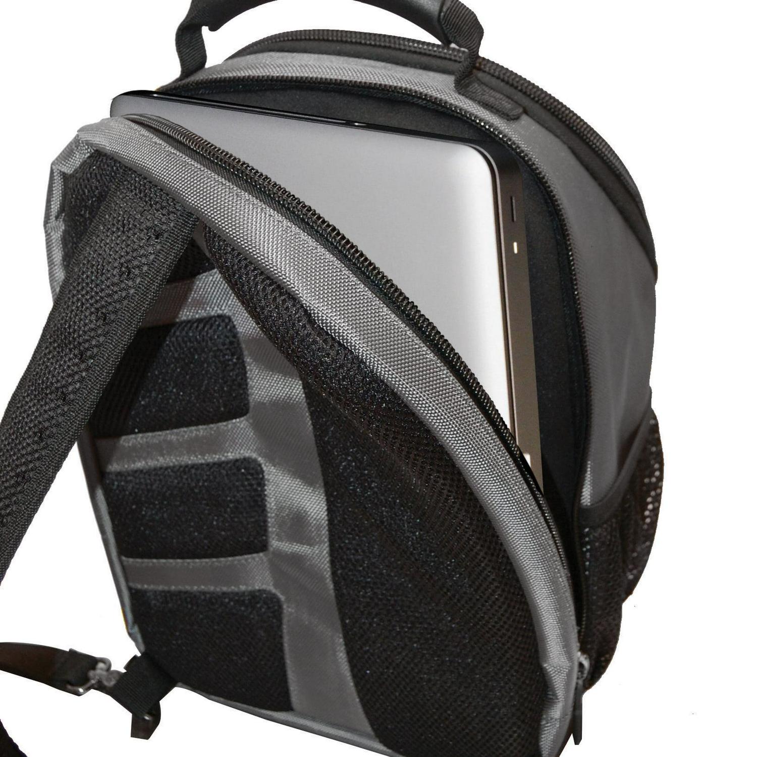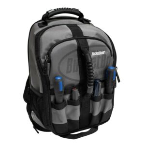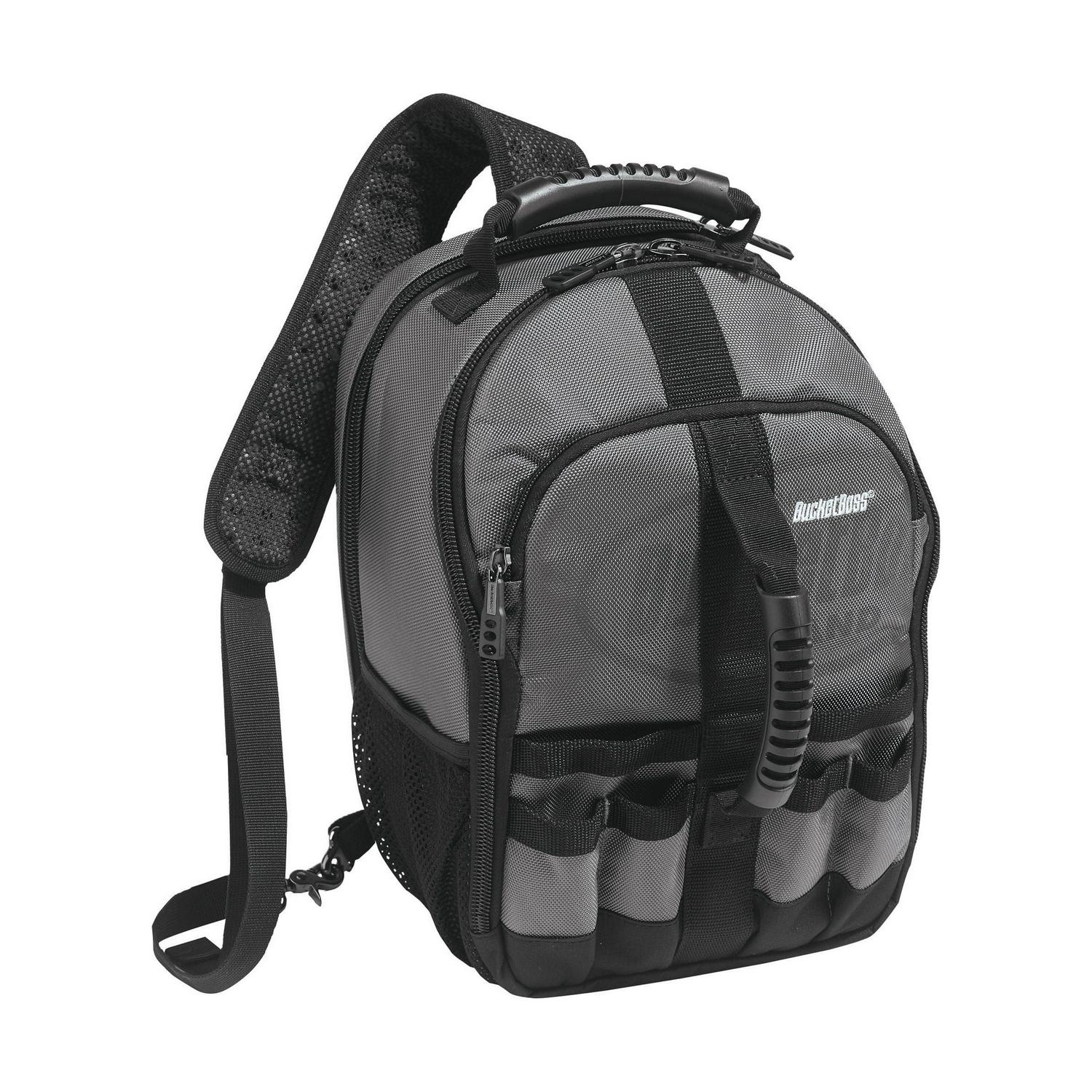From the Bucket Boss Professional Series, the Sling Pack Tool Bag is made for the professional contractor, constructed with heavyweight 1680 2-ply poly fabric. The compact size and single shoulder strap make this backpack an ideal choice for tight working spaces. The padded sling strap can attach to the base of the bag on either side, allowing it to be worn on the left or right shoulder. Other features include 2 molded handles on the front and top of the bag that allow it to function as a workstation, 24 total tool pockets, an adjustable interior drill loop, and 2 tech-pockets. Zippered tech-pockets on front and back of the bag are lined with thick, flexible neoprene and hold a tablet and up to a 13 in. laptop respectively.