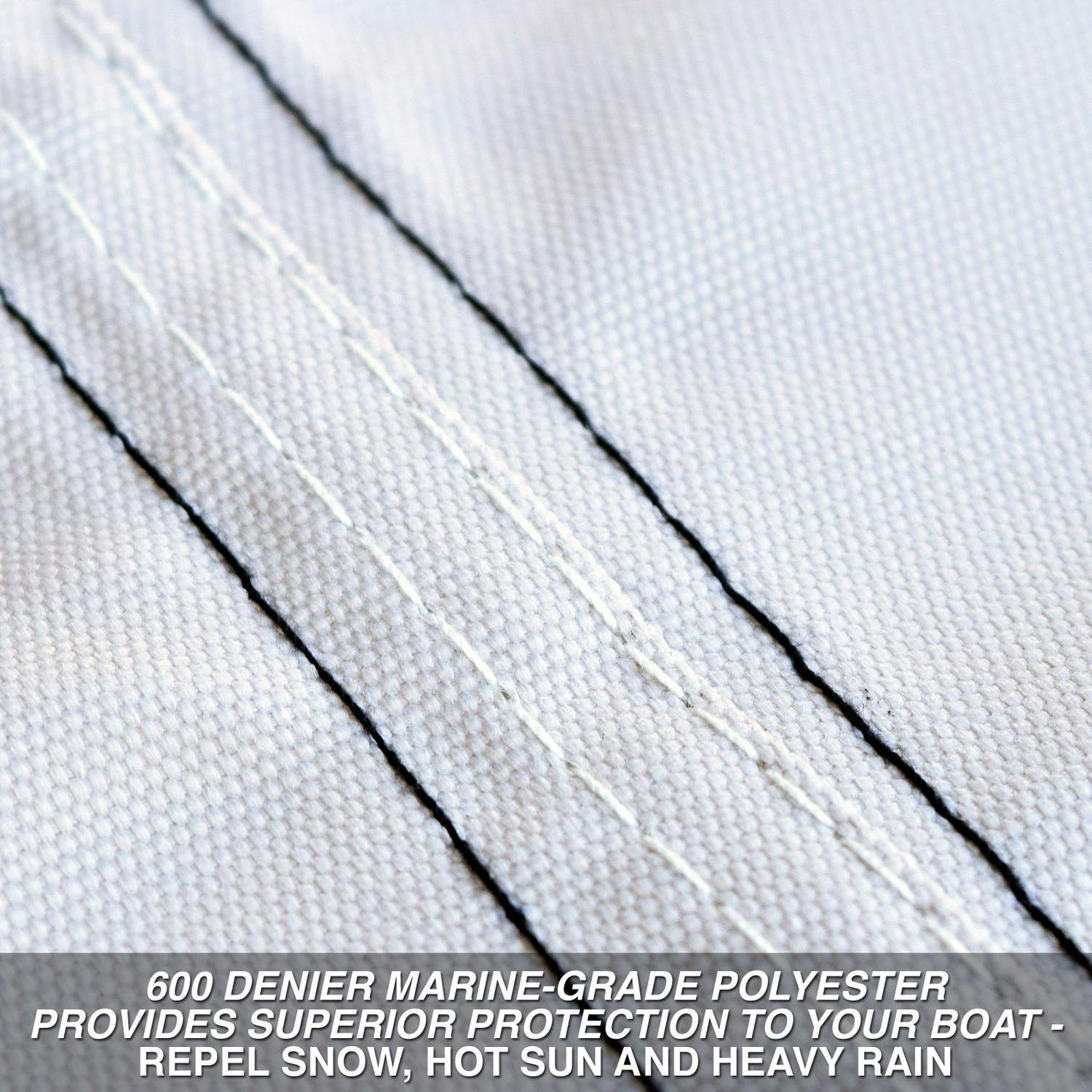 – This heavy duty boat cover will defend against outdoor elements like sun, rain, snow, dirt, dust, tree sap, falling leaves, bird droppings and more