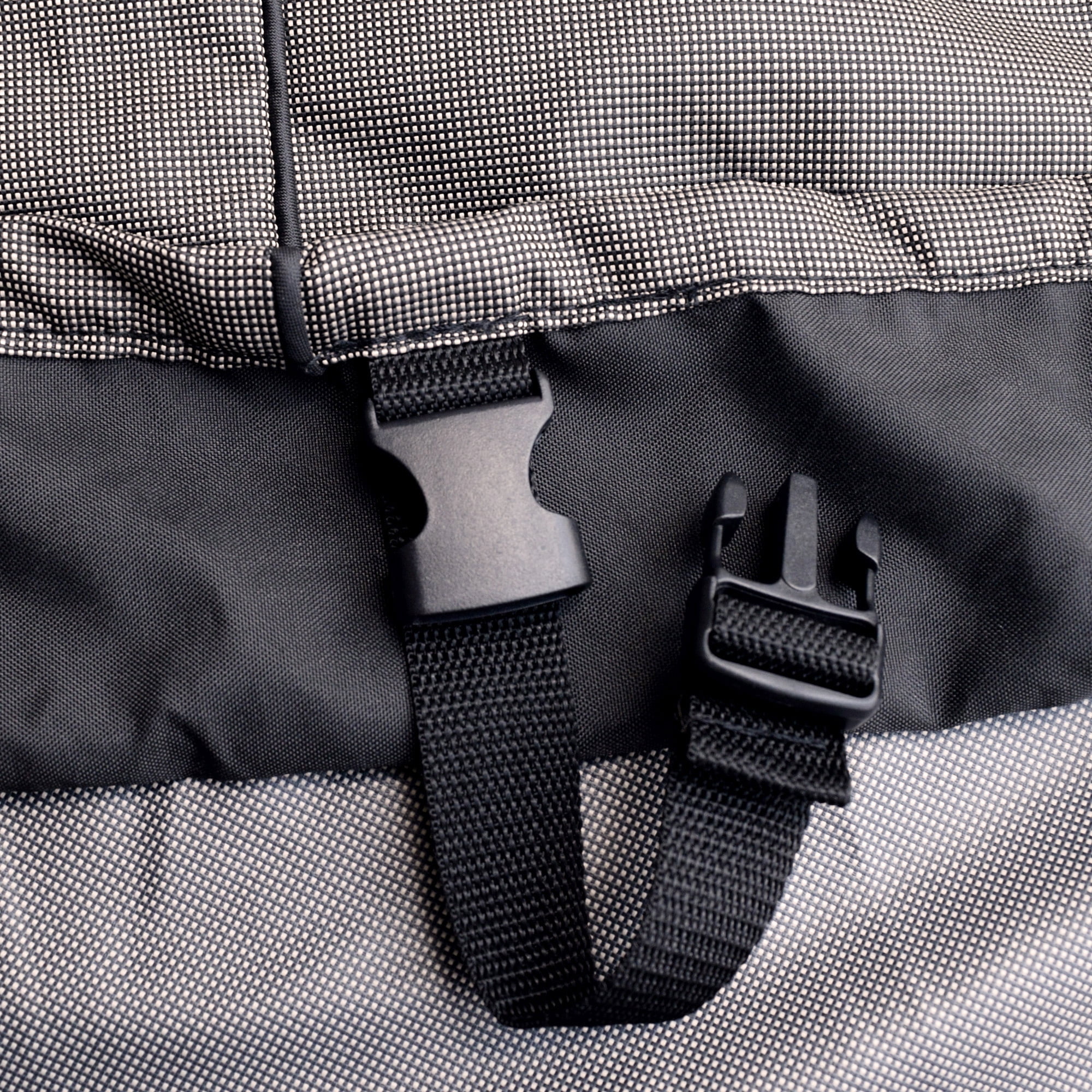 Black and Ivory 600 denier polyester treated with StormBlock™ makes covers waterproof Ultrasonically welded seams and contoured to fit your patio furniture Stain and UV resistant to protect patio furniture year-round Built-in air vents prevent mold and mildew Sewn-in straps and elastic hems provide added security in windy conditions This Budge cover measures: 37″ L x 79″ W x 37″ H