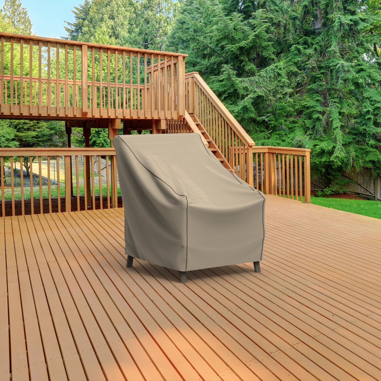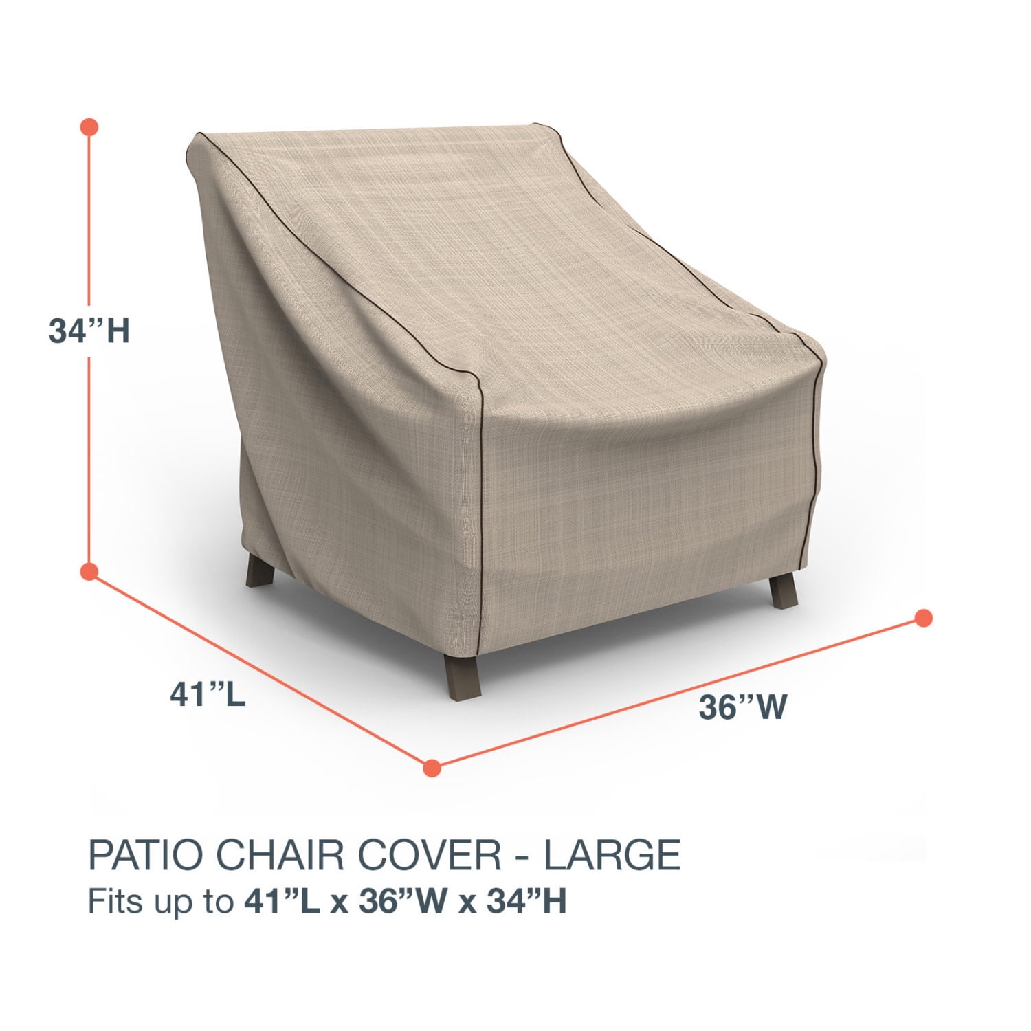 Our Patio Chair Cover, Large provides durable protection for your outdoor patio furniture. Designed to match your patio set, this collection comes in an black and ivory tweed pattern with dark gray piping and is contoured to fully cover your patio furniture. The Mojave collection by Budge combines the long-lasting durability of our machine-woven 600 denier polyester with StormBlock™ technology and UV protection. With this technology, water rolls right off this cover, taking mud, tree-sap, dirt and bird droppings with it. Meanwhile, our strap and buckle system makes it easy to fasten your cover to the legs of your patio furniture for added security in windy weather conditions and sewn-in air vents prevent condensation, preventing the build-up of rust, mold and mildew. This collection will compliment nearly any preexisting patio decor, all while extending the life of your outdoor furniture. Includes a 7-year warranty. This cover measures: 41″ L x 36″ W x 34″ H.