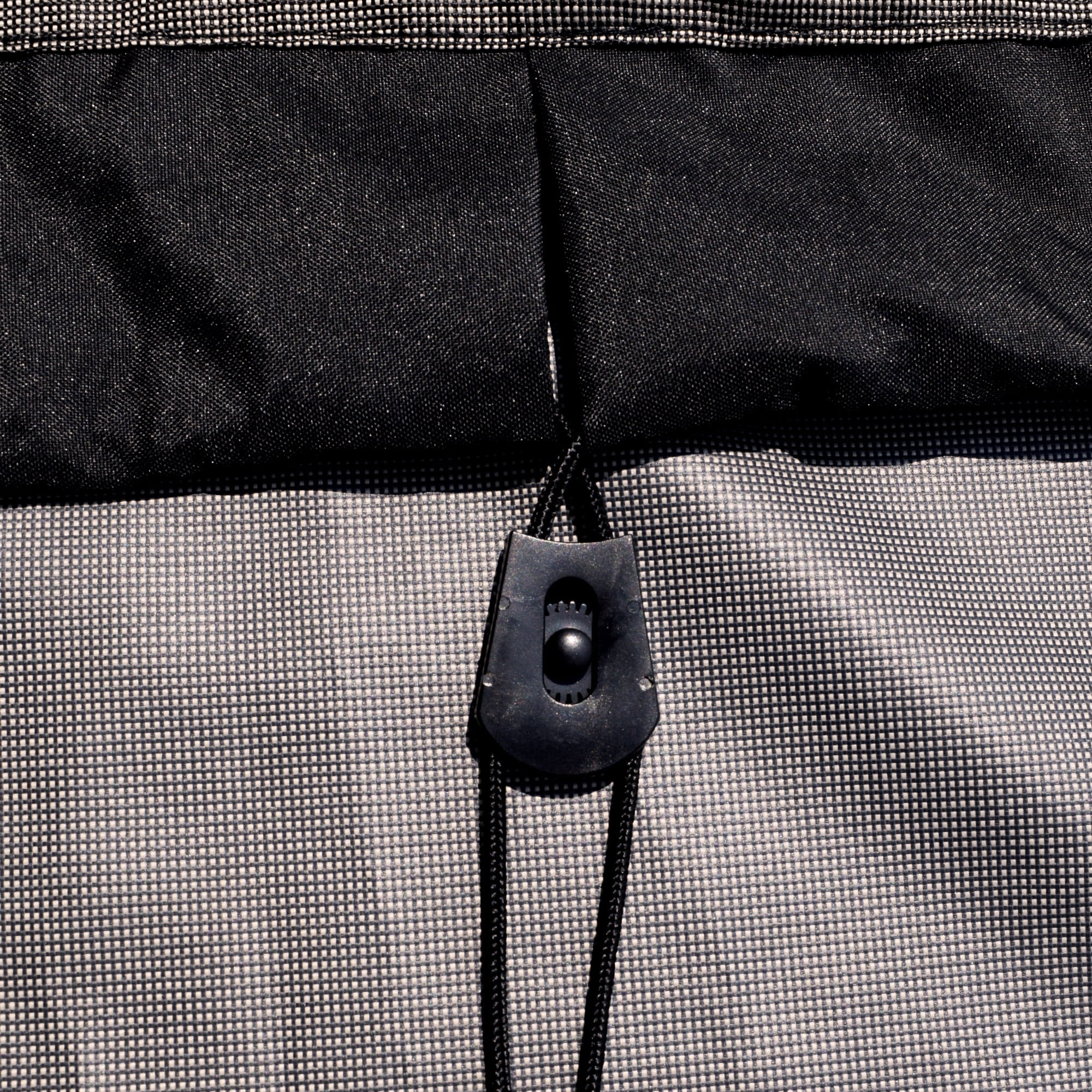 Black and Ivory 600 denier polyester treated with StormBlock™ makes covers waterproof Ultrasonically welded seams and contoured to fit your patio furniture Stain and UV resistant to protect patio furniture year-round Built-in air vents prevent mold and mildew Sewn-in straps and elastic hems provide added security in windy conditions This Budge cover measures: 74″ L x 35″ W x 35″ H