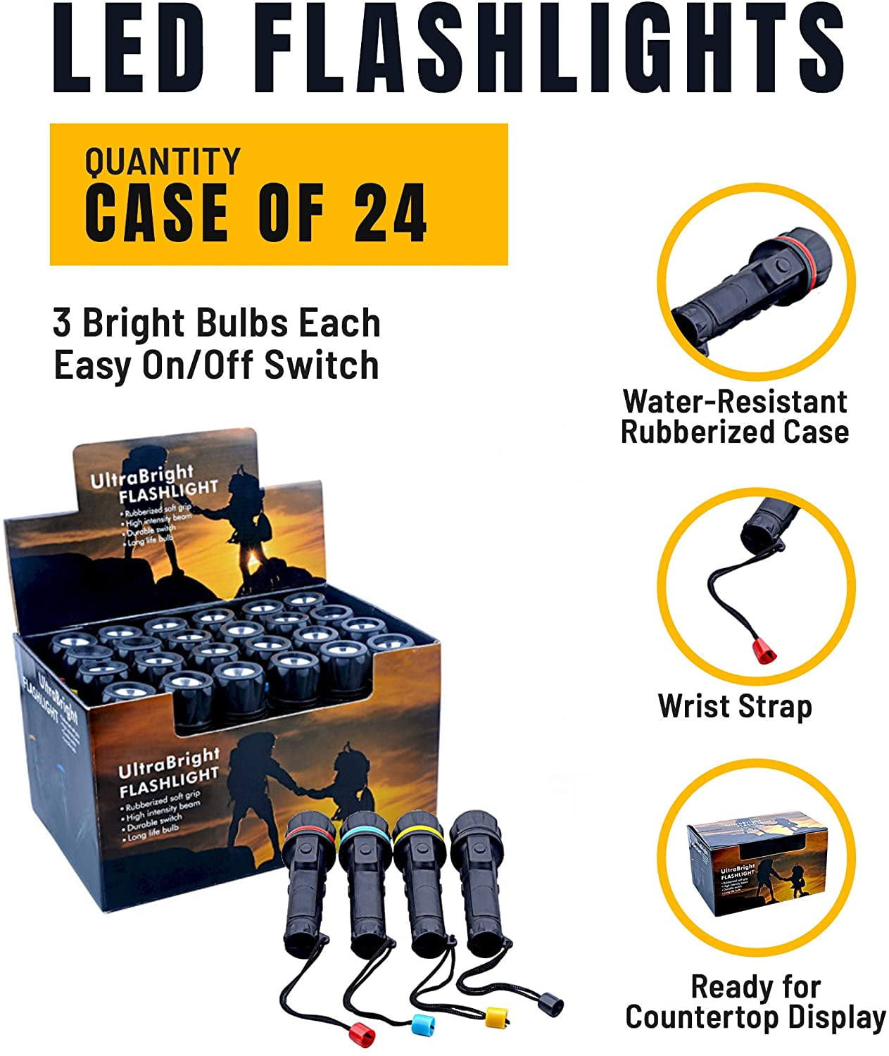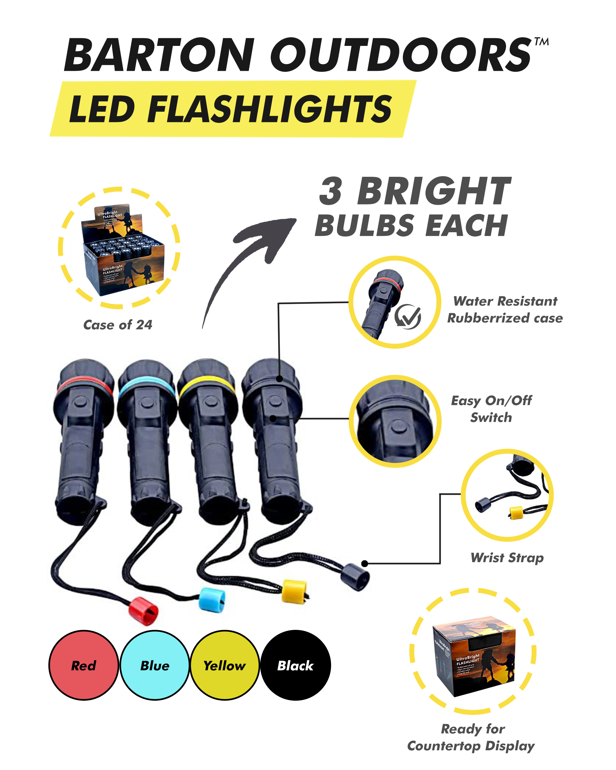 Cheap Flashlights – 24pc 3-Bulb LED Flashlights (3 LED Bulbs PER FLASHLIGHT) Our flashlights are sold in bulk at cheap wholesale prices. These flashlights are in bulk sets of 24 in a handy counter-top display which utilizes the “impulse” phenomenon making resellers money! Slap a $4.99 sticker on each flashlight and you will make a 400% profit on a quick selling product! The heavy gauge LED bulbs (3 per flashlight) are very bright and are made to last up to 15 years; even with heavy use! Each flashlight is encased in a water resistant rubberized case. There is a colored ring with matching wrist strap decoration. Each 24pc bulk box of cheap small (5-1/2 inch) flashlights contains 6 red, 6 blue, 6 yellow and 6 black flashlights. These flashlights measure 5-1/2″ long and each use 2 AA batteries (not included).