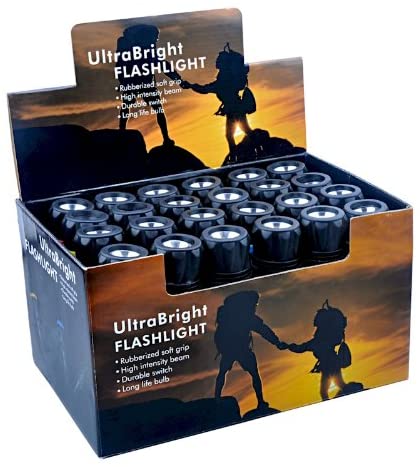 Sell lots of our LED flashlights from your outdoor gear or hardware store for happy customers. Each super bright flashlight uses 3 heavy-gauge LED bulbs that last up to 15 years. Our pocket flashlights switch on easily at the touch of a button at night or for close work. Every 24 piece display comes with 6 red, 6 blue, 6 yellow and 6 black accented flashlights with rubberized soft grip. This handy outdoor mini flashlight is 5 1/2″ long and takes two AA batteries sold separately.