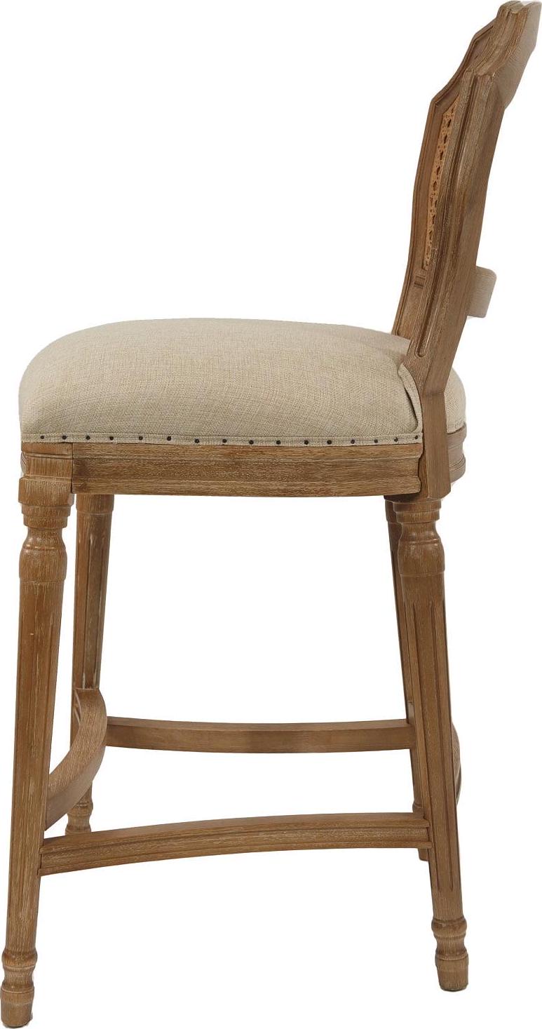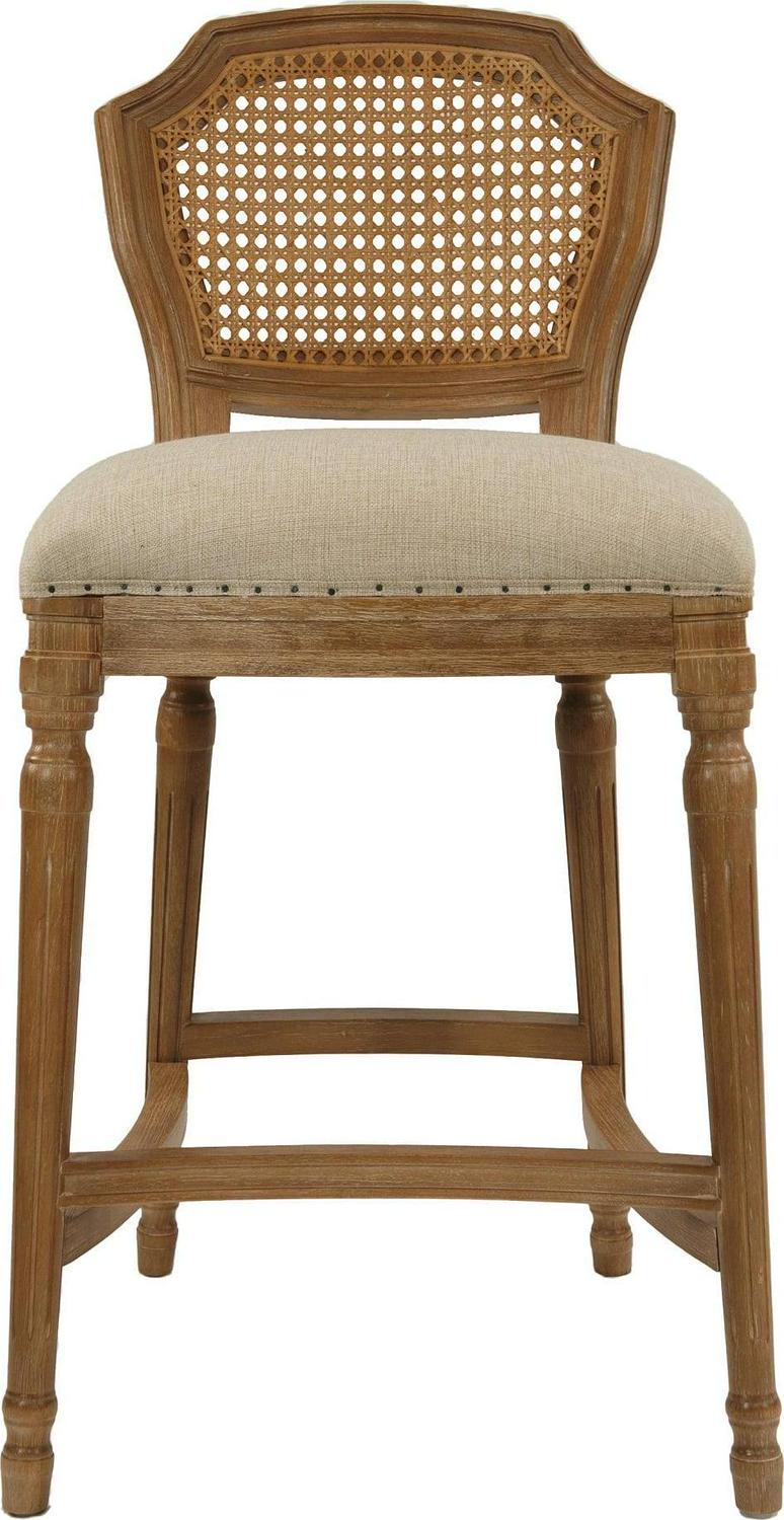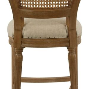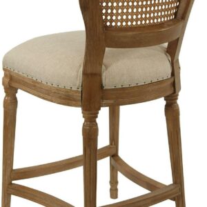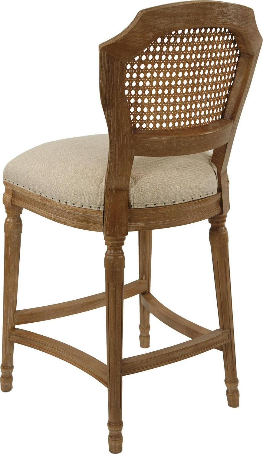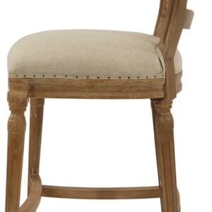 Give your kitchen or dining room an elegant upgrade with the Burnham Home Designs Wilbrandt 27.5 in. Counter Height Stool. This counter-height stool is crafted from solid oak in a light wood and tan finish. The padded, linen seat and high, mesh backrest provide a comfy place to kick back during evening drinks or munch your morning breakfast. An ornate leg design, along with subtle-yet-chic nailhead trim, offer the finishing touches to this sophisticated chair. Add multiple of these modern stools to your in-home eatery for a completely contemporary look.