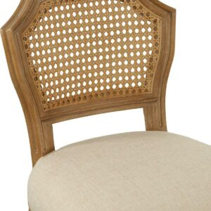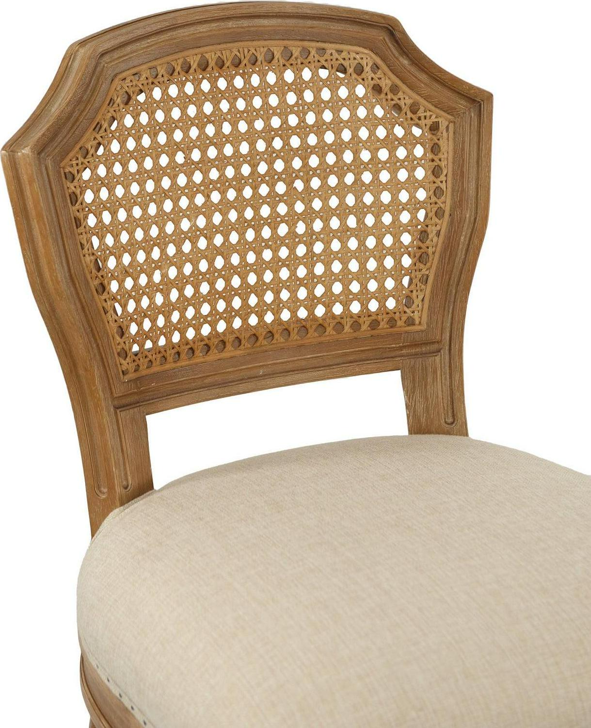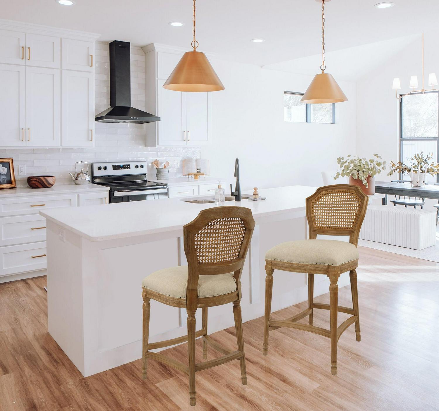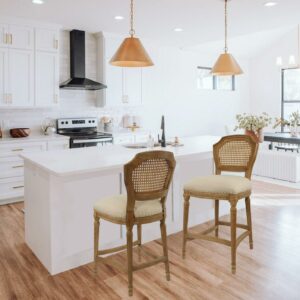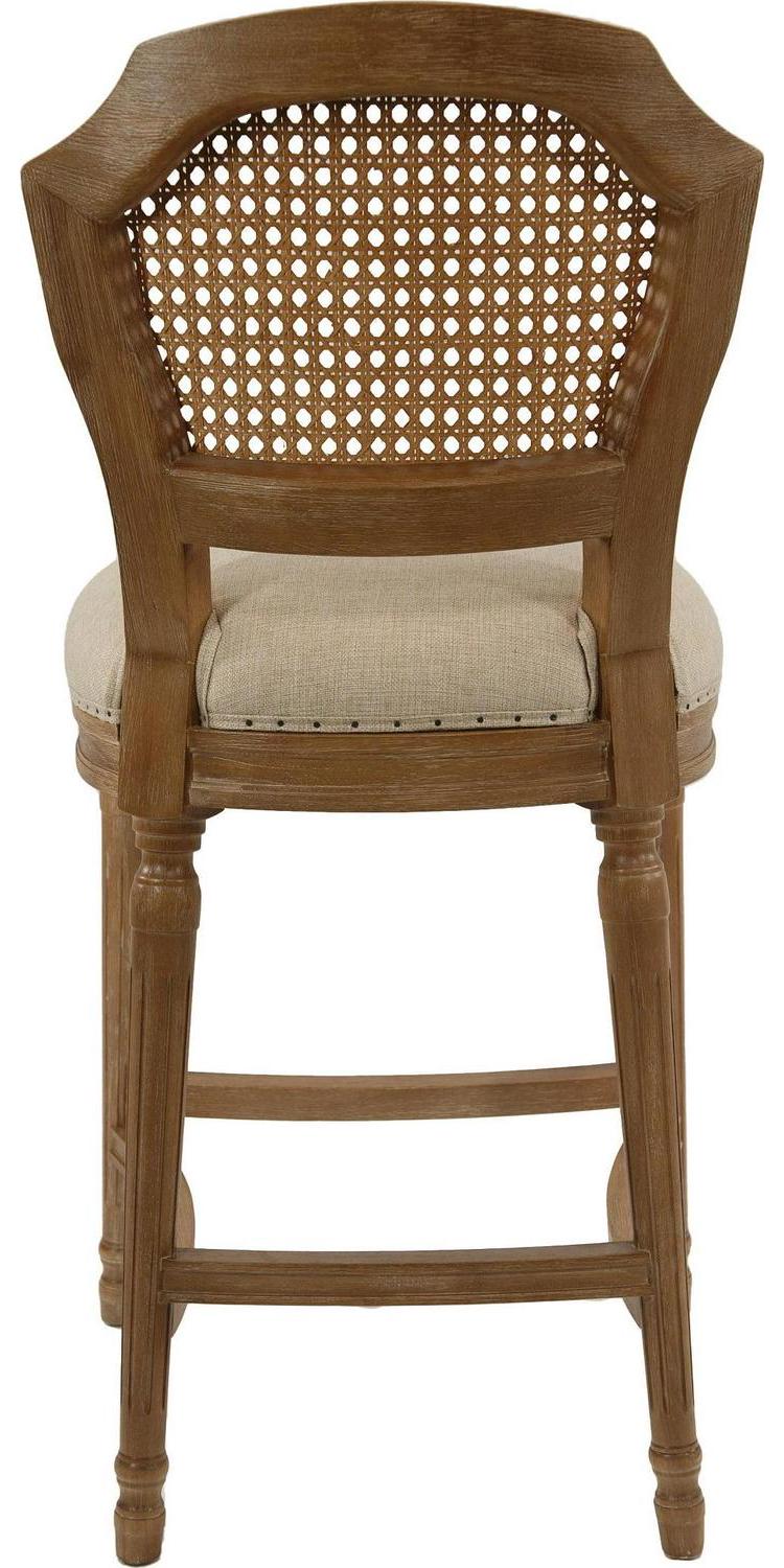Give your kitchen or dining room an elegant upgrade with the Burnham Home Designs Wilbrandt 27.5 in. Counter Height Stool. This counter-height stool is crafted from solid oak in a light wood and tan finish. The padded, linen seat and high, mesh backrest provide a comfy place to kick back during evening drinks or munch your morning breakfast. An ornate leg design, along with subtle-yet-chic nailhead trim, offer the finishing touches to this sophisticated chair. Add multiple of these modern stools to your in-home eatery for a completely contemporary look.