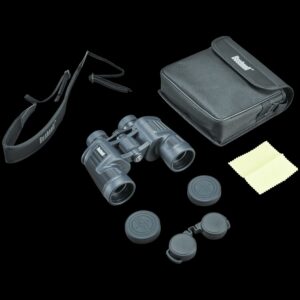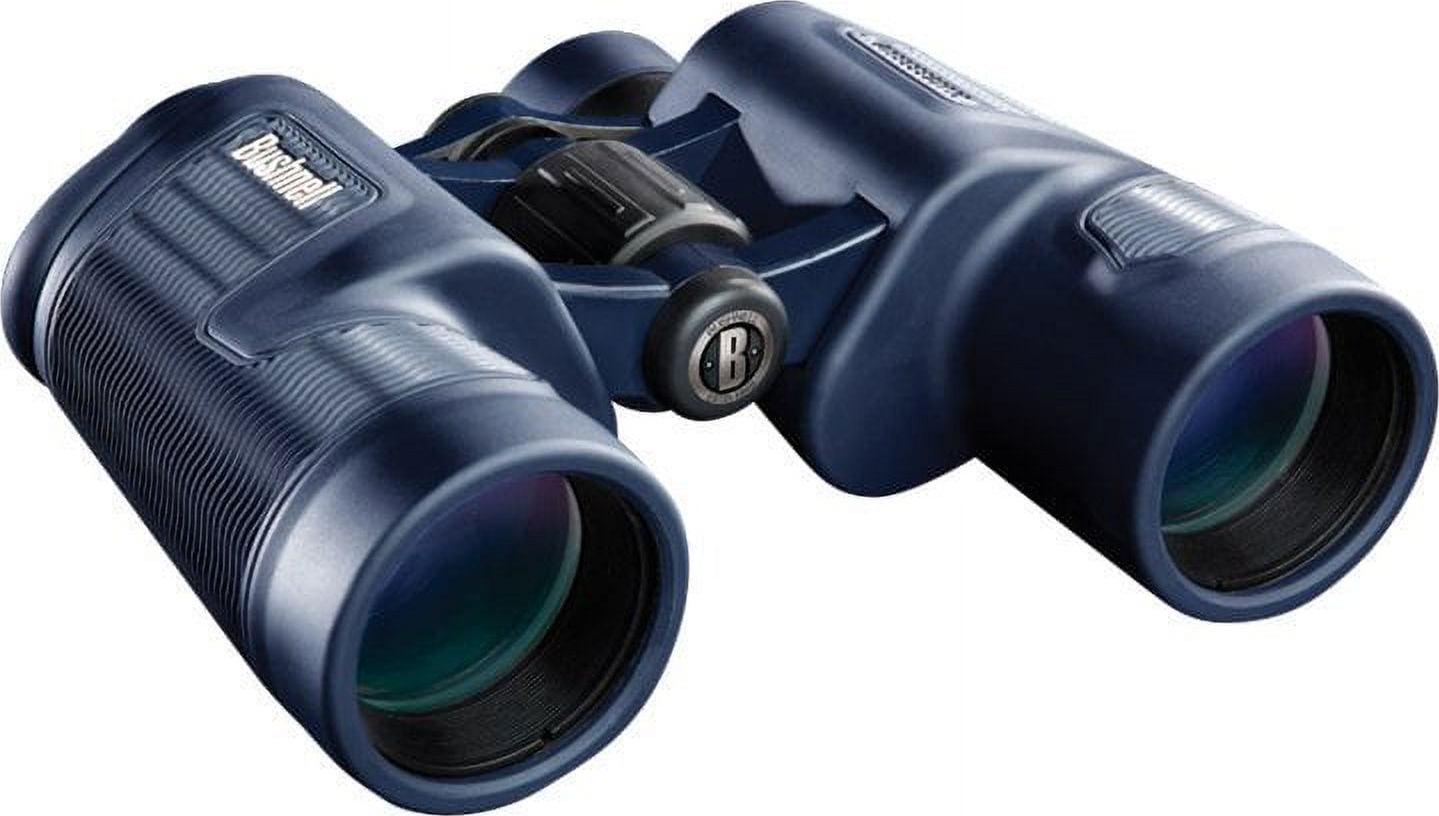 The H2O 10×42 Porro Binocular (Blue) from Bushnell was built to sail the ocean blue, row down a rolling river, or accompany a raft on a languid lake. It has been o-ring sealed and nitrogen purged for waterproof and fogproof protection. Immersed in water, they will still stay dry inside, and the interior optical surfaces won’t fog due to a rapid change in temperature or humidity. To make them even more aquatically acclimated, the protective rubber armoring is a blue color with a soft textured ridged grip so they won’t slip too easily out of the hand and into the hydrosphere even when wet. The magnification of 10 power with the 42mm objective provides excellent viewing for both close-up detail and scanning the field of view. The comfortable size allows the binocular to remain easy to hold steady even on the deck of a deep-water frigate riding the ocean swells. Multi-coated lenses and premium BAK4 prism glass assure superior optics that delivers maximum light transmission and clarity. Twist-up eyecups, a dioptric ring and a large center focus knob supply comfortable, customized viewing no matter what the conditions.Features:- Wide AAOV of 65.0 – Ergonomically designed closed bridge – Locking diopter secures the viewers fine-tuned focus – BAK4 Porro prisms provide bright, clear, crisp viewing – Large center focus knob is fast, accurate, intuitive and easy to access – Twist-up eyecups for a comfortable fit with or without eye or sunglasses – Non-slip, blue, rubber armor absorbs shock while providing a soft textured rippled grip – Nitrogen purged and o-ring sealed for waterproof and fogproof all-climate performance – Multi-coated optics on at least one lens surface reduces light loss and glare due to reflection offering a brighter, higher-contrast imageSpecifications:- Prism Type: Porro – Magnification: 10x – Objective Lens Diameter: 42mm – Angle of View: 6.5 – Field-of-View: 341′ 1000 yd- Minimum Focus Distance: 15′- Exit Pupil Diameter: 4.2mm – Eye Relief: 16mm – Focus Type: Center – Tripod Mount: No- Weight: 27 oz