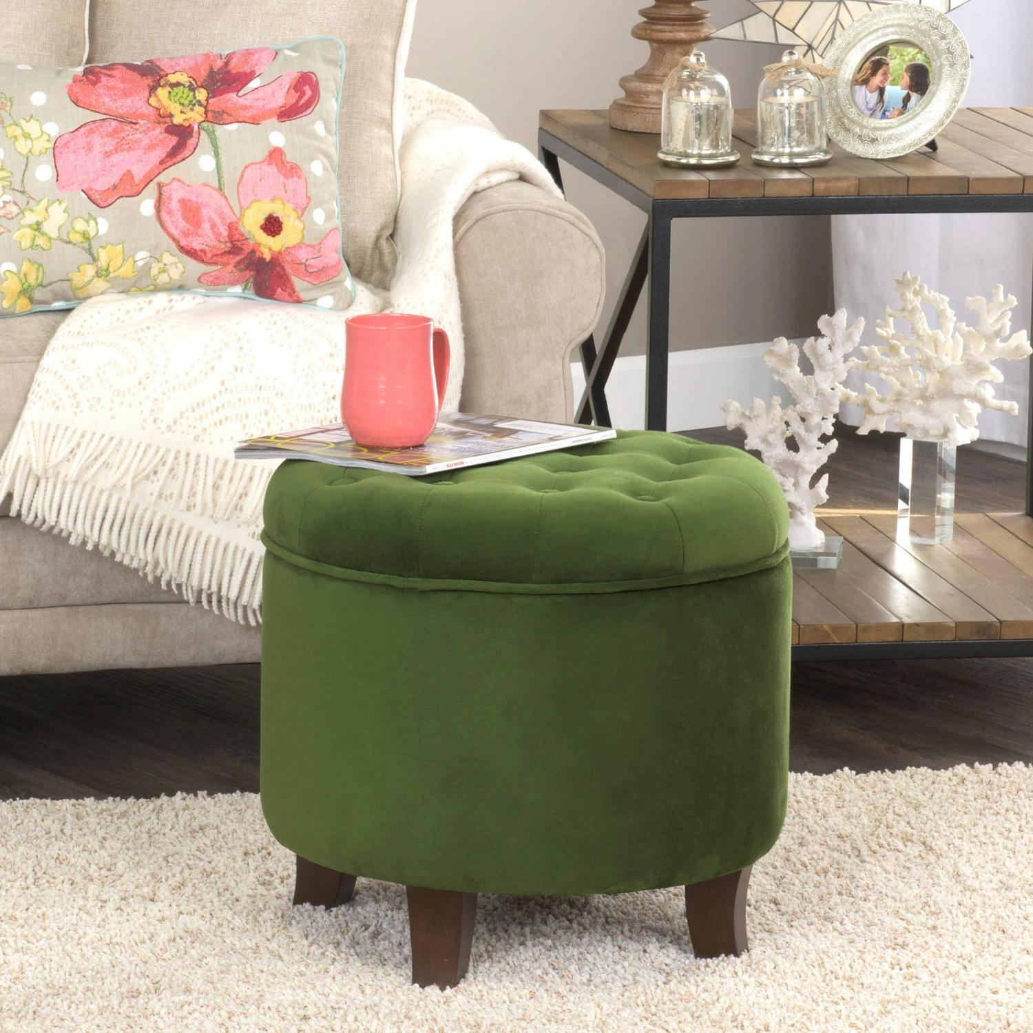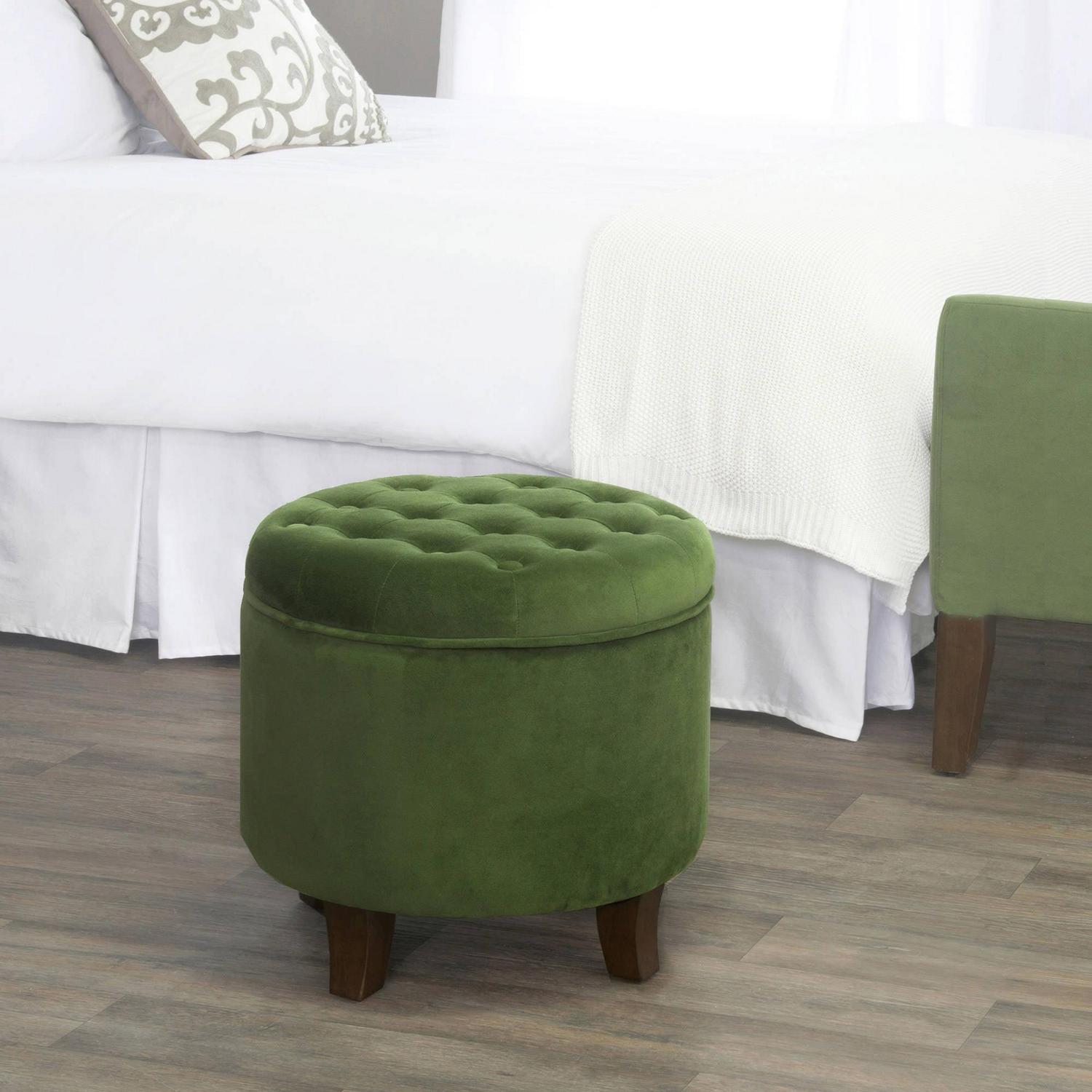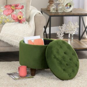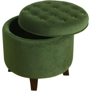 Button Tufted Velvet Upholstered Wooden Ottoman with Hidden Storage, Green and Brown- Saltoro Sherpi Incorporate a sense of supremely plush addition to your living room or bedroom with this elegant ottoman. This velvet tufted round ottoman features a lift off lid with all over button tufting style. Upholstered in green color soft velvet, this elegant round ottoman has flared wooden feet in a rustic brown finish. Use under storage to hide accessories in a bedroom, to store books or magazines in a living room, or to keep remotes nearby but out of sight. This is ideal to be used for seating purposes, serving stool or to rest feet when tired.
