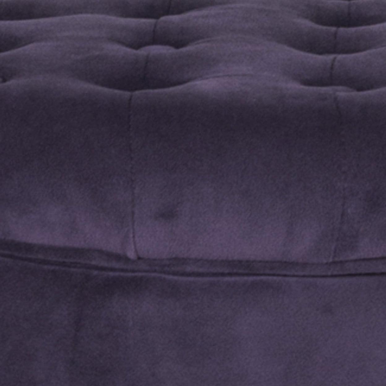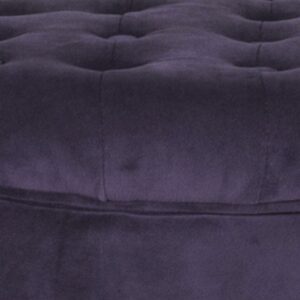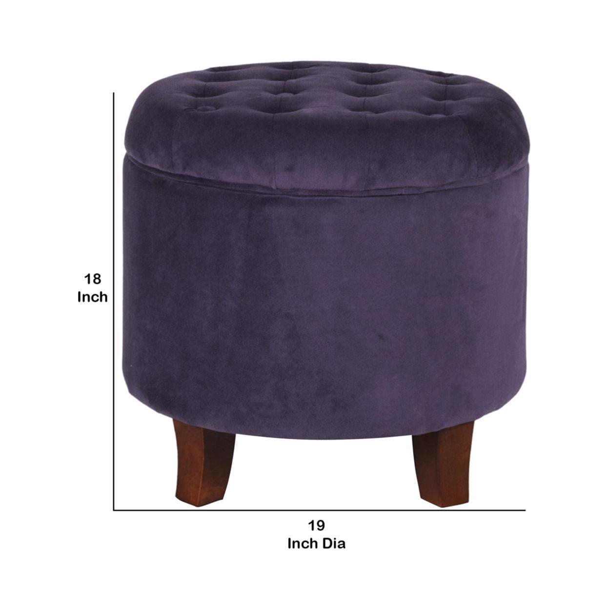 Button Tufted Velvet Upholstered Wooden Ottoman with Hidden Storage, Purple and Brown- Saltoro Sherpi Incorporate a sense of supremely plush addition to your living room or bedroom with this elegant ottoman. This velvet tufted round ottoman features a lift off lid with all over button tufting style. Upholstered in purple color soft velvet, this elegant round ottoman has flared wooden feet in a rustic brown finish. Use under storage to hide accessories in a bedroom, to store books or magazines in a living room, or to keep remotes nearby but out of sight. This is ideal to be used for seating purposes, serving stool or to rest feet when tired.