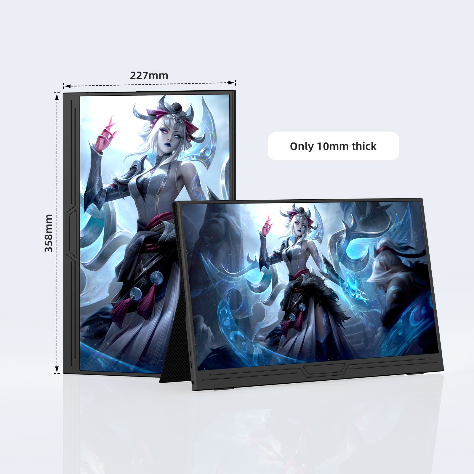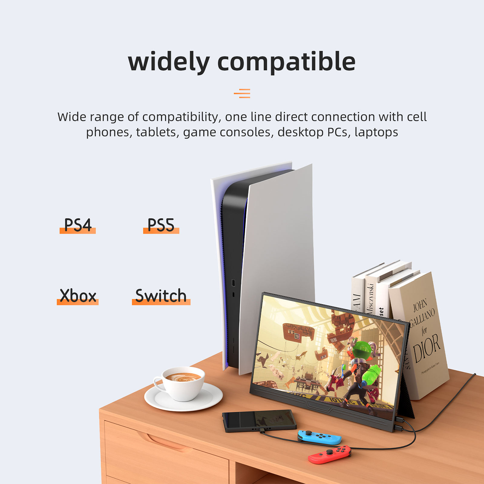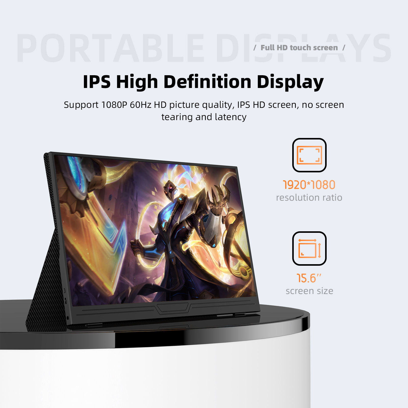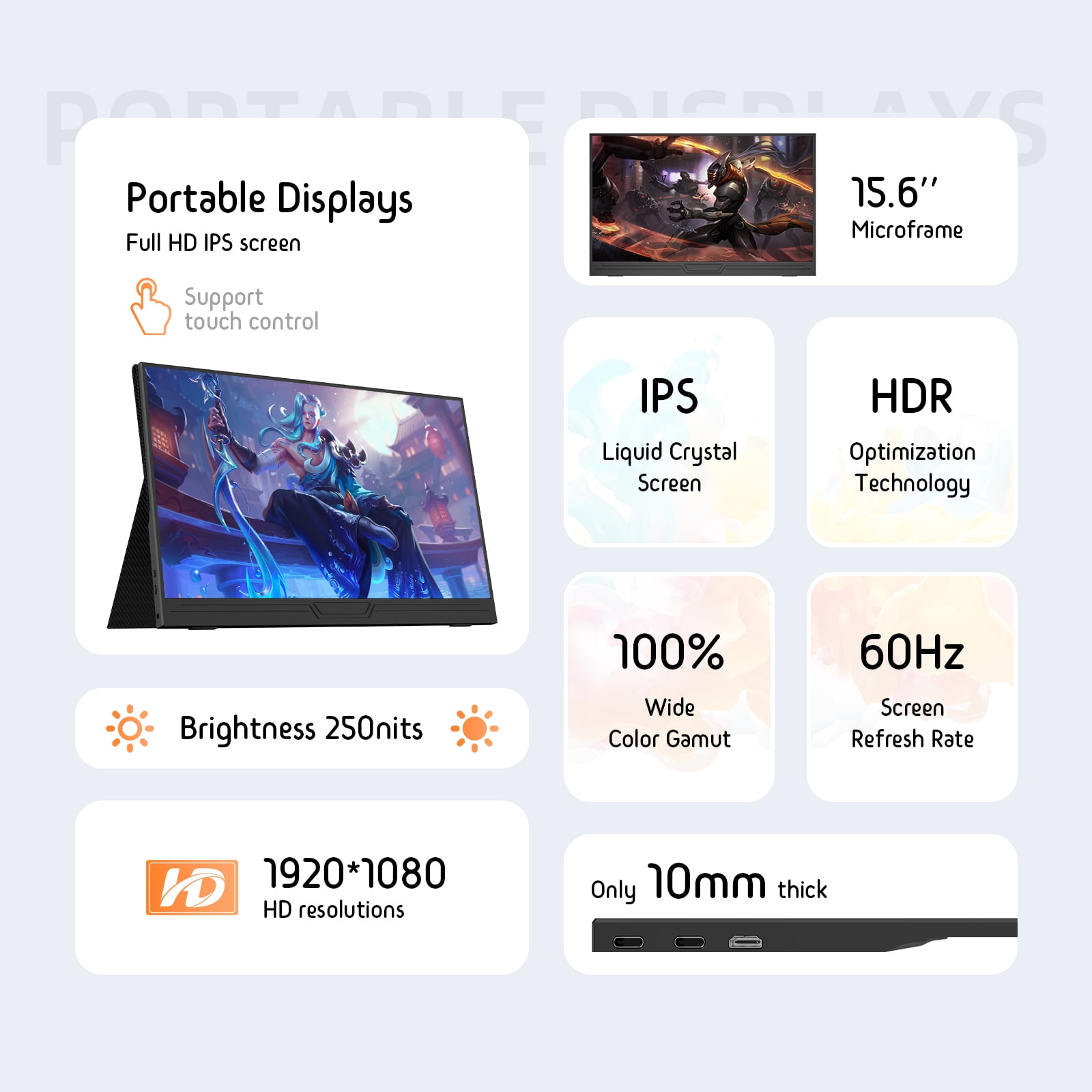 PORTABLE TOUCH SCREEN MONITOR: This 15.6-inch portable monitor features a touch screen interface, allowing for easy navigation and control. HIGH DEFINITION DISPLAY: With a resolution of 1080P, this monitor delivers stunning visuals with crisp and vibrant details. The IPS panel ensures wide viewing angles and accurate color reproduction. VERSATILE COMPATIBILITY: This monitor is compatible with most smartphones, laptops, PS4, SWITCH gaming consoles, and X-BOX. It features HDMI and dual Type-C interfaces for convenient connectivity. BRIGHT AND IMMERSIVE VISUALS: The LED backlighting technology provides a brightness of up to 250 nits, ensuring clear visibility even in brightly lit environments. The FHD HDR capability enhances contrast and brings out more details in dark scenes. ULTRA-THIN AND LIGHTWEIGHT DESIGN: With a thickness of only 10mm and weighing just 3.3 pounds, this portable monitor is highly portable and perfect for on-the-go use.