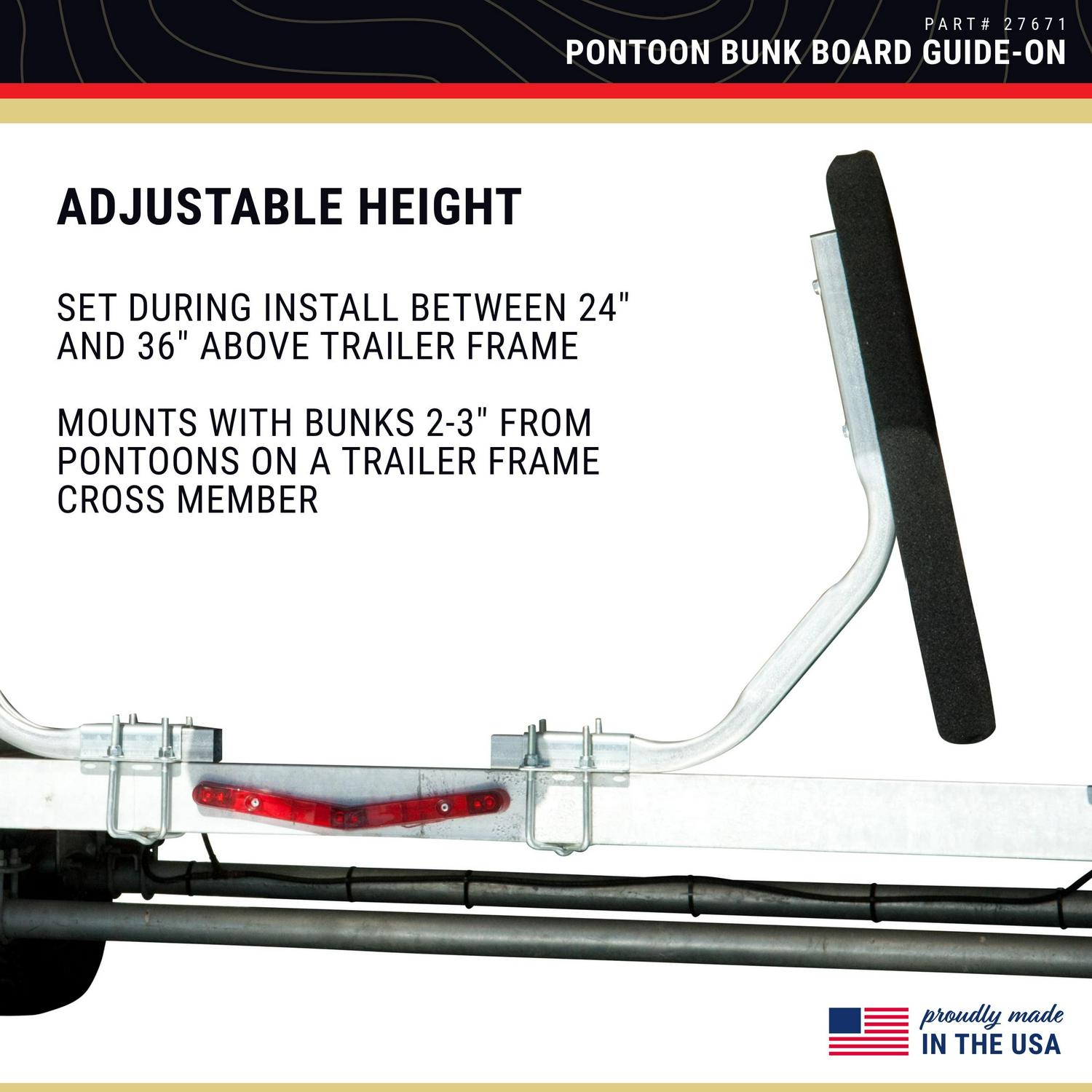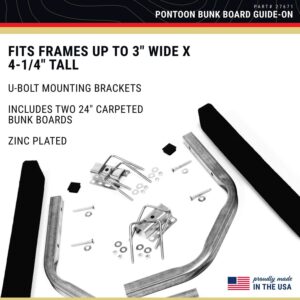 Bunk Board Pontoon Guide-On Ideal for bunk style pontoon boat trailer with box, channel, or I-beam frames up to 3″ wide x 4-1/4″ tall. Pontoon glides easily past the carpeted bunk boards guiding the pontoon boat onto the trailer. Height is adjustable and is set during install between 24″ and 36″ above trailer frame. Mount with bunks 2-3″ from pontoons on a trailer fram cross member. Fits frames up to 3″ wide x 4-1/4″ tall U-bolt mounting brackets Includes two 24″ carpeted bunk boards Galvanized steel construction Zinc plated hardware For larger trailer frames check out our Large Frame U-Bolt Kit (11416). WARNING: This product can expose you to chemicals including LEAD,Chromium (hexavalent compounds) which are known to the State of California to cause cancer, birth defects or other reproductive harm, and NICKEL (METALLIC),COBALT METAL POWDER,BERYLLIUM which are known to the State of California to cause cancer, and ARSENIC ,CADMIUM which are known to the State of California to cause cancer or other reproductive harm. For more information go to P65Warnings.ca.gov.
