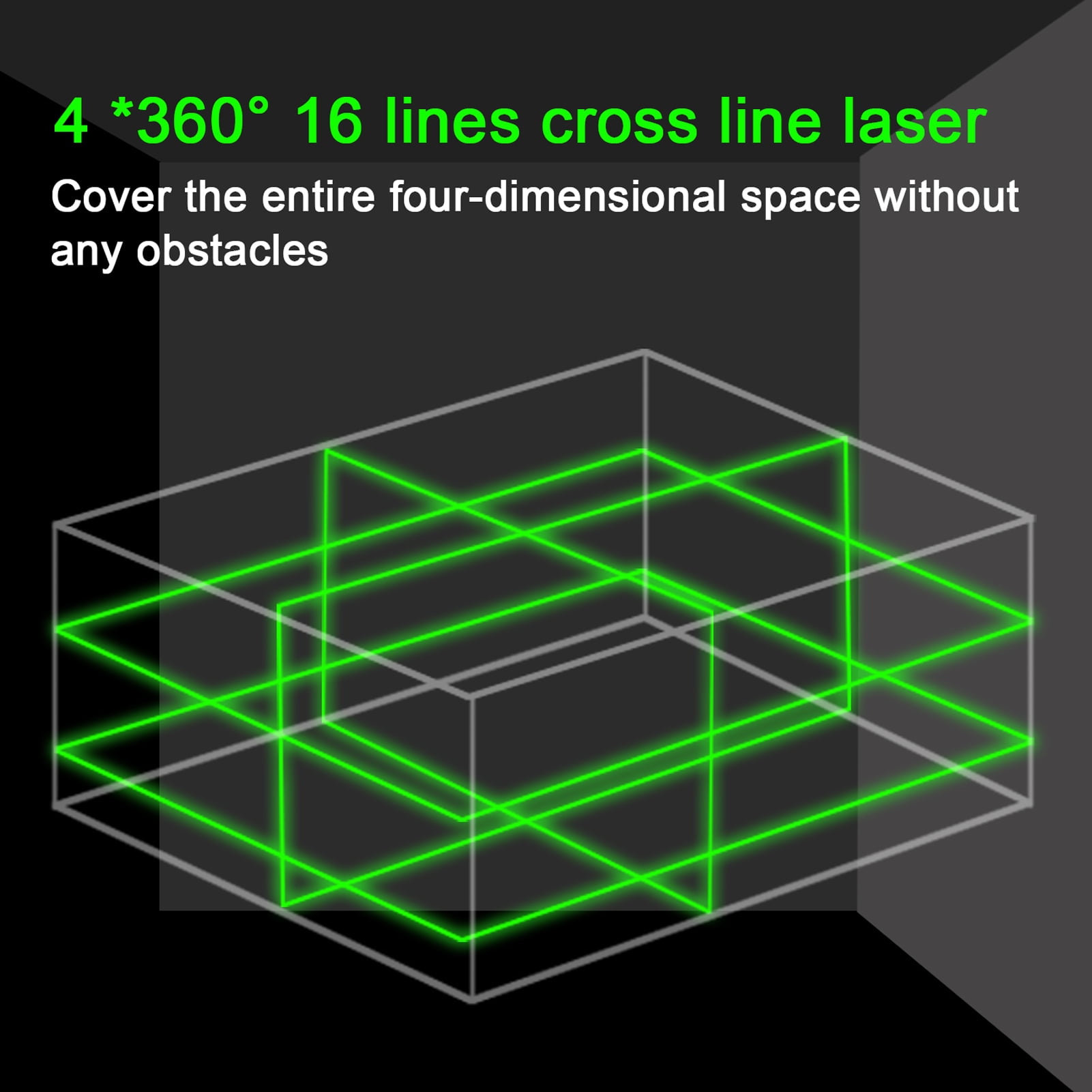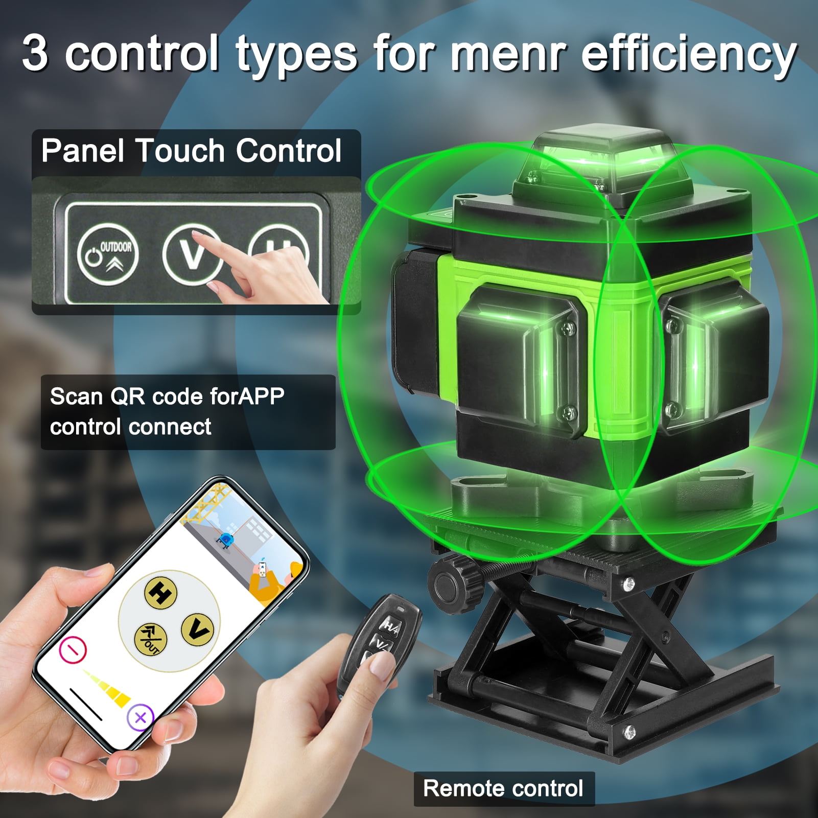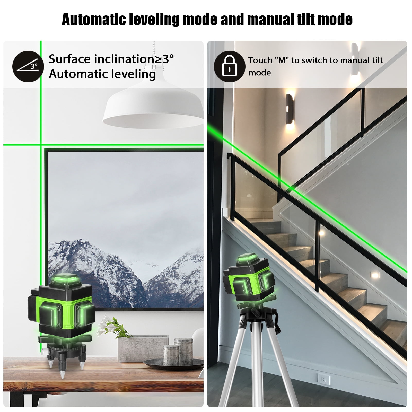 4x 360° 16 LINE GREEN BEAM LASERS: Clearly visible 360° laser line up to a diameter of 80ft.Including 2 horizontal and 2 vertical lasers as well as 360-degree coverage,could projects an accurate horizontal or vertical illuminated line onto the surface. Use for installing cabinetry, tile, a drop ceiling, or for basic leveling.You can easily hang an entire room’s worth of pictures SELF-LEVELING & MANUAL MODE: 1. Laser Level Self Leveling Mode: laser measurement tool can be tilted self-leveling within ±3°,when the device is out of level and the lines will flashing and beeps. 2. Manual Mode: Possible to set angled lines which are often required in decorating projects.Installing wainscoting on the stairs suddenly becomes a snap. 3. Wireless Remote Control.If you are working in a very large space with few hands to help, this could prove useful. TILT MODE: It features a tilt mode, you can place the laser tool at arbitrary angle to make tilt lines, will not flash the line and will not promote beeping sound MULTIPLE MOUNTING OPTIONS:1. Including a magnetic bracket with a 360-degree swivel for mounted to a metal surface,and an Iron Plate for sticking on the wall. 2. Lifting Platform Suitable For Measuring Low Wall. 3. Come with a rotary base.You can rotate the laser level 360 degrees. 4. The Laser Level Could work With 1/4″ or 5/8″ Tripod.You can project lines in any position or angle MULTI USEFUL ACCESSORIES: We Provide 2 Rechargeable Batteries To Extend Your Use Time.One Battery Supplys About 4 Hours While 16 Lines Full Opened. Laser Target Plate increase the visibility of green laser lines or dots by 1.3 times when working under long distance or bright sunlight conditions. WATERPROOF & DIGITAL DISPLAY: The digital display control panel features a clear-definition battery power display, providing real-time information about the remaining battery power. This convenient feature allows you to recharge or replace the battery in a timely manner. Additionally, the unit is designed with an IP54 waterproof rating, offering protection from water splashes, dust, and construction debris. Note: Please avoid exposing your eyes directly to the laser beams. Press the “OUTDOOR” button for 3 seconds to enter tilt mode then you can place the laser tool at any-angle to project the tilt lines; Press the “OUTDOOR” button shortly or long time press “H” or “V” button, you can adjust the laser brightness according to the working condition freely. Scanning QR code on the back of remote controller to download cellphone APP, convenient to control the level machine. The laser level is controlled by the APP through Bluetooth connection, and also has electric quantity display, laser light brightness adjustable and voice control function.