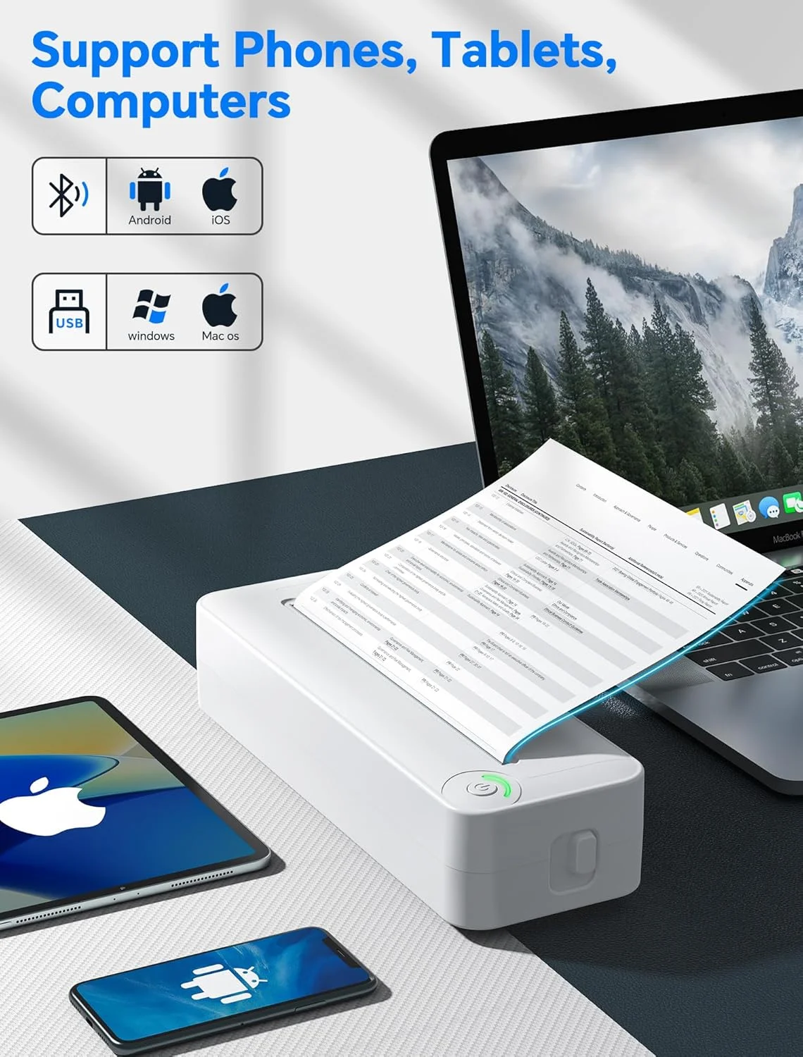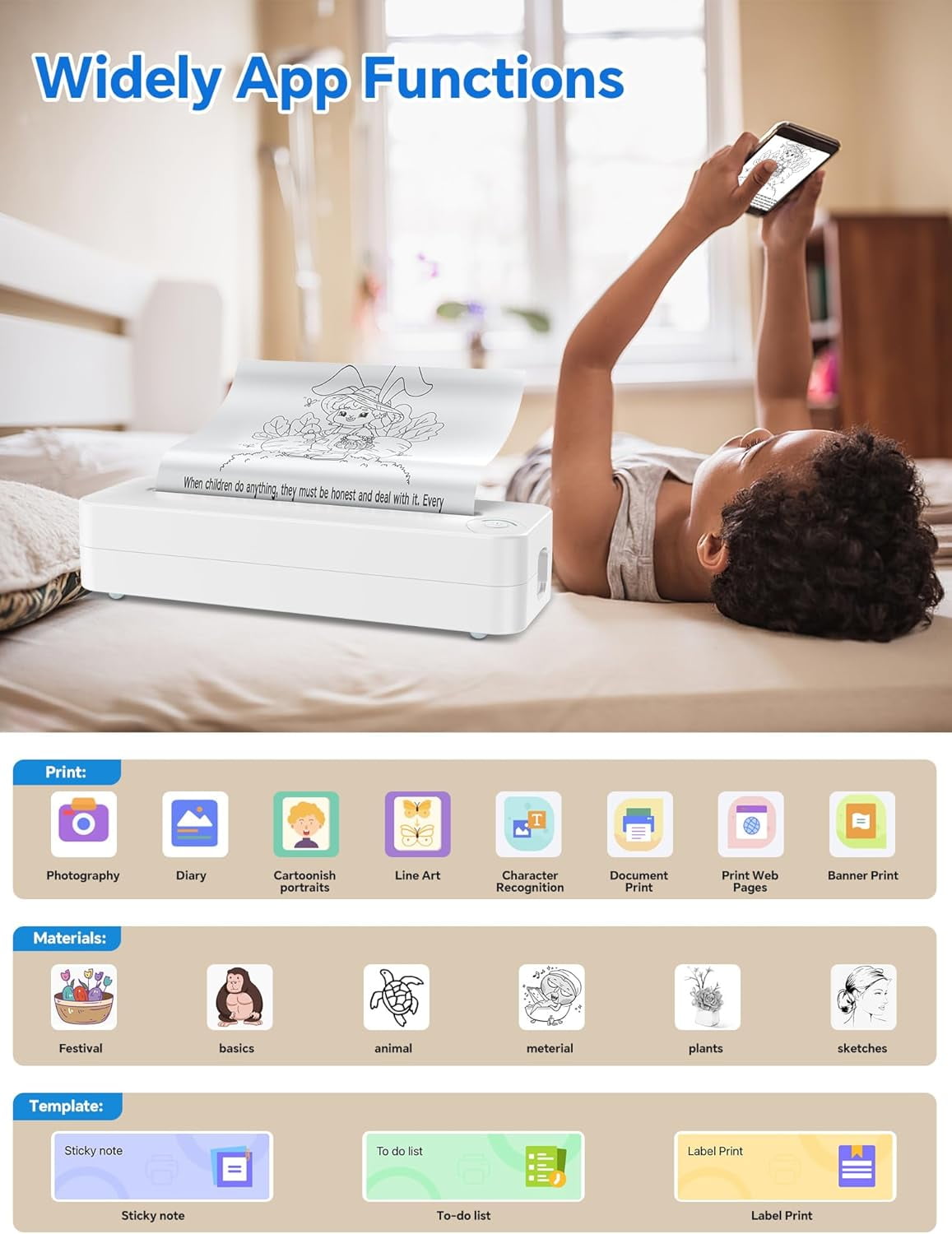 All in One Printer: Perfect to print anything you want, PDF file, test paper, webpage, contract, photo, picture, etc. Wireless to print loads of paper during business trip, an excellent assistant for study and office work. Inkless printing without ribbon.
